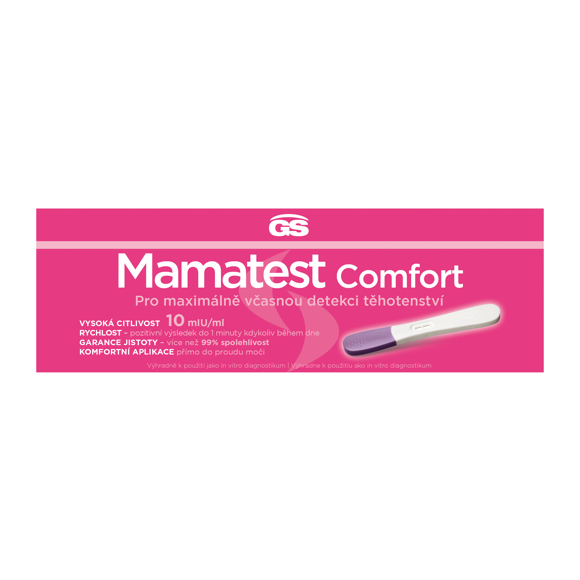 GS Mamatest Comfort je rychlý a spolehlivý těhotenský test, který můžete provádět Vy sama. Zjišťuje přítomnost lidského choriového gonadotropinu (hCG), který se objevuje v moči již ve velmi časném období těhotenství. Těhotenství spolehlivě zachytí již první den vynechání pravidelné menstruace.