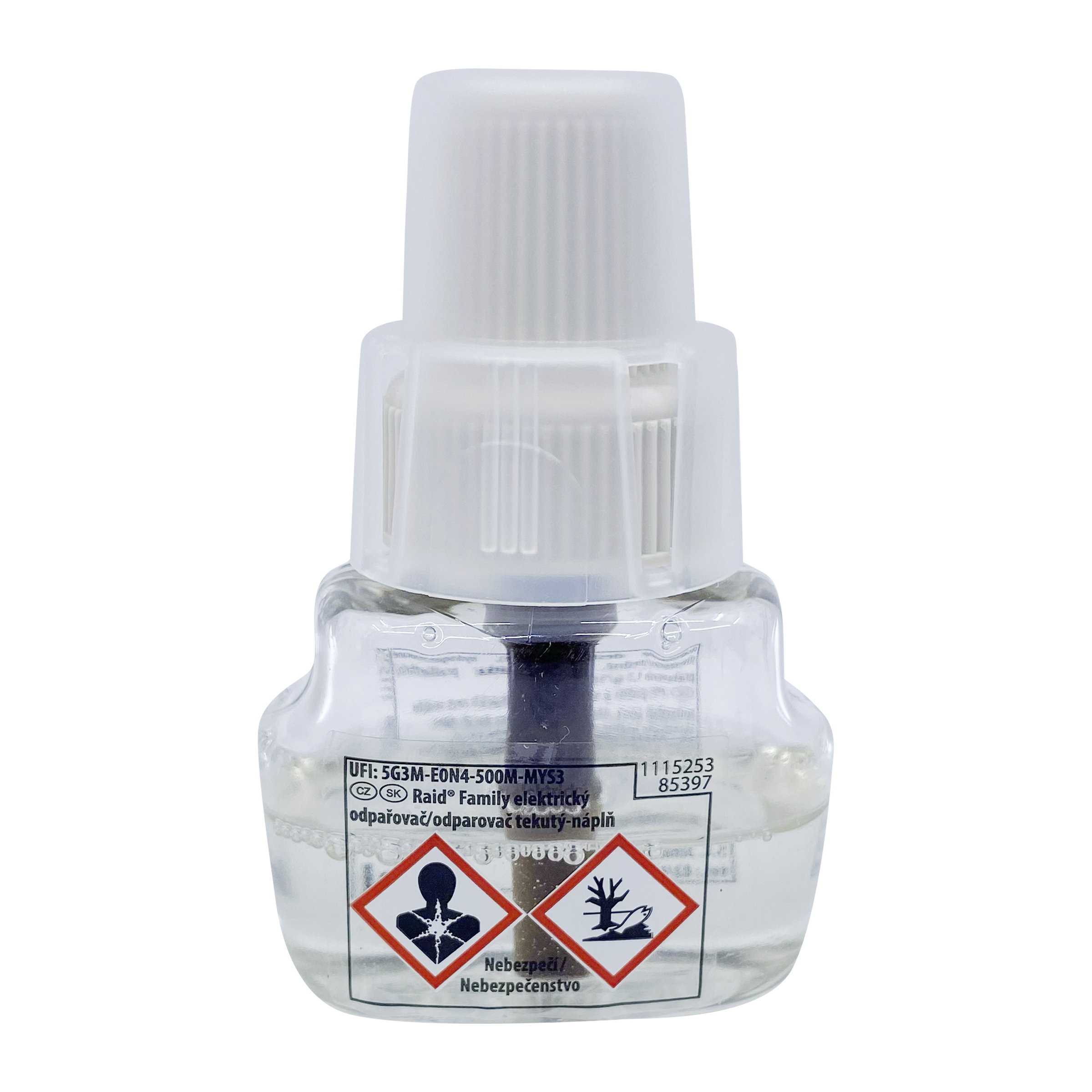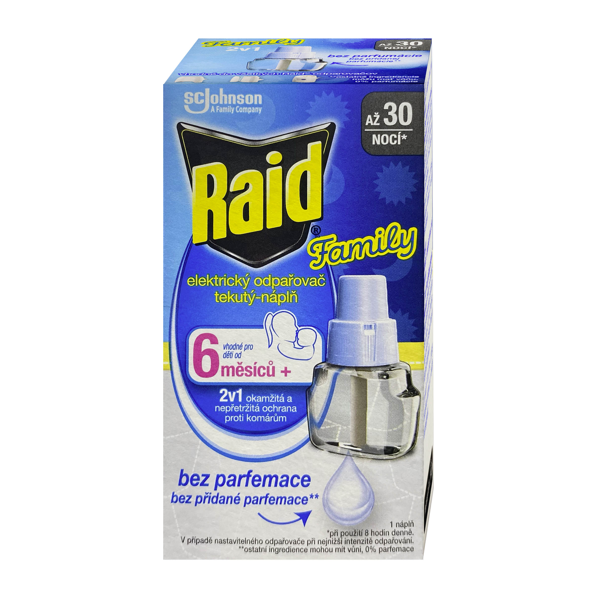 Raid® Family elektrický odpařovač tekutý-náplň, insekticid bez parfemace poskytuje efektivní ochranu proti komárům včetně tygřích až 30 nocí/8 hodin/noc. Až 30 nocí*. Bez přidané parfemace**.