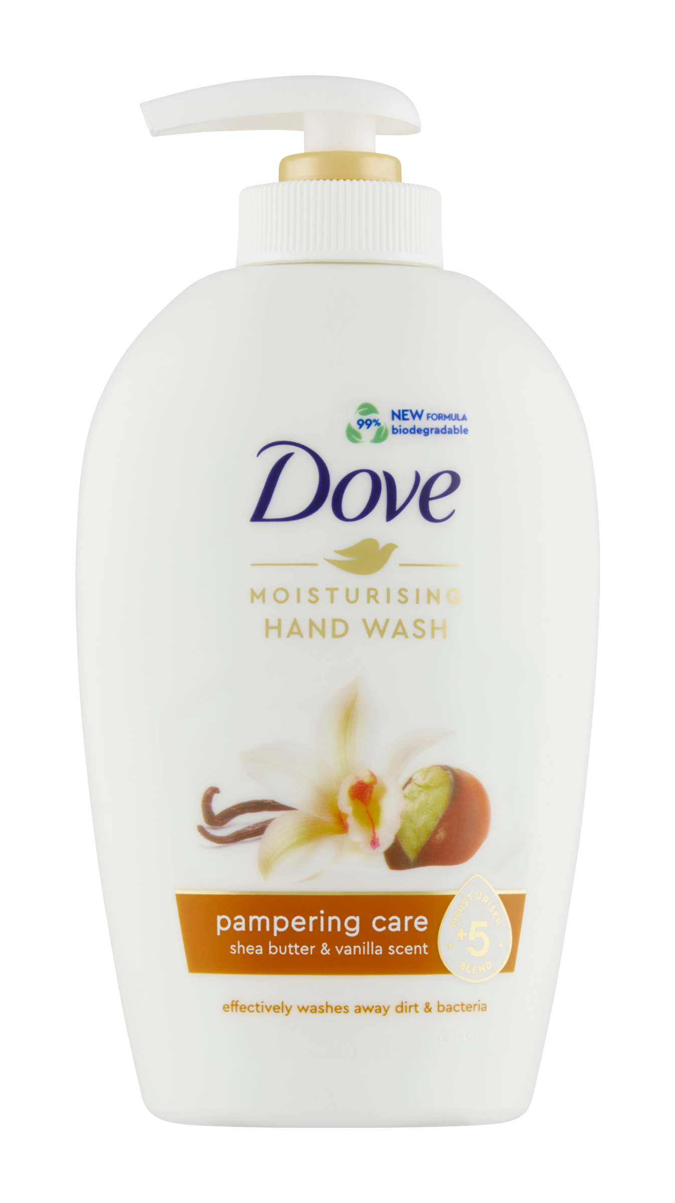 Pokud hledáte luxusní péči o pokožku při mytí rukou, která poskytuje hloubkové čištění a hydrataci, Dove Pampering Care je to správné tekuté mýdlo pro vás. Jemné a pečující mytí rukou, které smyje bakterie z vašich rukoou již po 20 sekundách. Navíc naše mýdlo není testované na zvířatech a obsahuje jemné čistící prostředky, takže každé mytí rukou bude pro vaší pokožku malým aktem péče. Jedinečná hydratační směs +5, skládající se z pěti výživných látek a hydratačních látek poskytne vašim rukám dlouhotrvající hydrataci. Toto tekuté mýdlo je obohaceno o výtažky z bambuckého másla a o hřejivou vůni vanilky, která zanechá vaši pokožku krásně voňavou. Dove tekuté mýdlo je vyrobeno s ohledem na udržitelnost, proto má na 99% biologicky odbouratelné složení a jeho lahev je vyrobena ze 100% recyklovaného plastu.