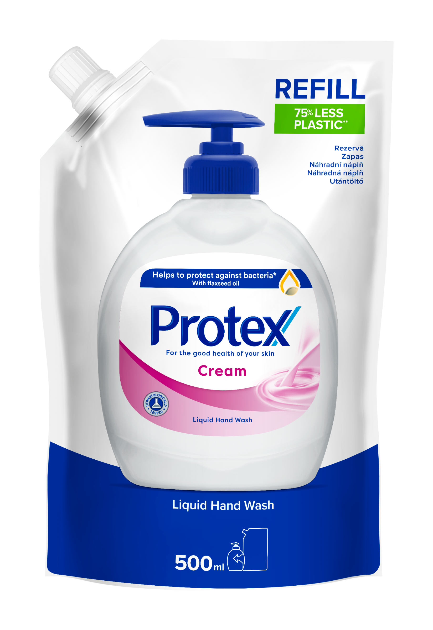 Doplňte své tekuté mýdlo na ruce Protex Cream pomocí tohoto praktického náhradního balení. Toto náhradní balení mýdla na ruce vám pomáhá chránit se před bakteriemi při pravidelným mytím rukou. Složení obsahuje lněný olej a je obohaceno o zvlhčující látky, které pomáhají udržovat přirozenou hydrataci vaší pokožky. Mýdlo na ruce bylo dermatologicky testováno a má jemnou a krémovou vůni, obohacenou o květinové tóny, bílý pižmo a pudrové dřevo. A s o 75 % méně plastu** je toto náhradní balení mýdla na ruce také šetrnější k životnímu prostředí. **Toto náhradní balení používá o 75 % méně plastu na ml produktu než 300ml balení tekutého mýdla na ruce Protex s pumpičkou.