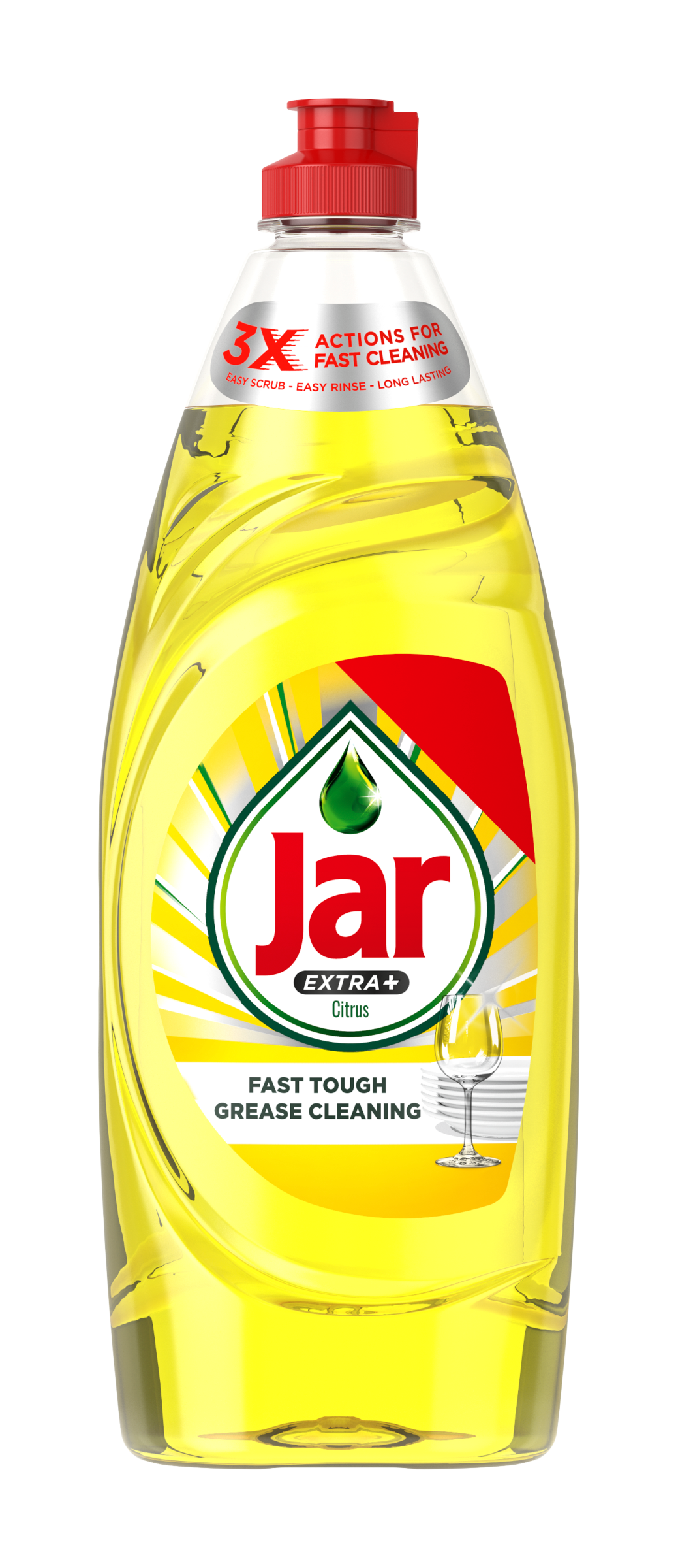 Tekutý prostředek na mytí nádobí Jar Extra+ Citrus vám pomůže dostat se rychleji z kuchyně tím, že myje rychleji a snadněji. Každá kapka Jaru rychle proniká do odolné mastnoty na nádobí, rozpouští ji a zanechává dokonalé výsledky i v případě těch nejodolnějších nečistot.