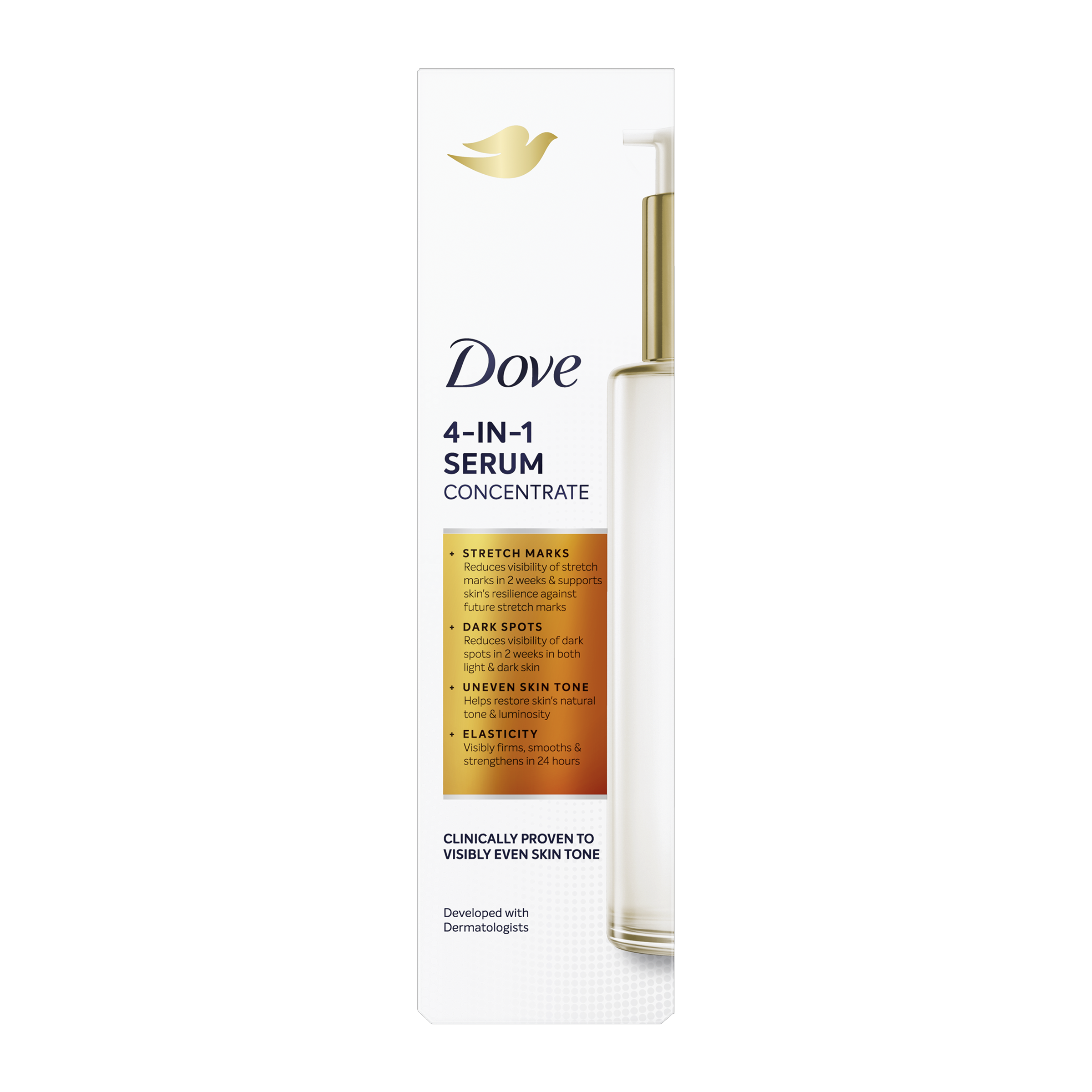 Objevte sílu účinných sér, nyní pro celé vaše tělo - s novým tělovým sérem Dove 4v1. Toto multifunkční sérum bylo klinicky testováno a prokázáno, že pomáhá redukovat strie, tmavé skvrny, zlepšuje pružnost pokožky a sjednocuje její tón. Je ideální pro namáhané oblasti, které potřebují intenzivní péči, obnovu a dlouhotrvající hydrataci. Jeho složení je obohaceno o účinné aktivní látky, které podporují hojení pokožky, posilují její strukturu a zajišťují viditelně zářivější vzhled. Díky 48hodinové hydrataci je pokožka okamžitě jemná, vypnutá a viditelně obnovená. Viditelné výsledky se dostavují už od prvního použití - pokožka je hydratovaná, namáhané oblasti zklidněné a po 4 týdnech jsou strie viditelně bledší, pleť působí pevněji, pružněji a má rovnoměrnější tón. Dove 4v1 tělové sérum - pro tělo, které je sjednocené, pevné, pružné a krásně hydratované.
