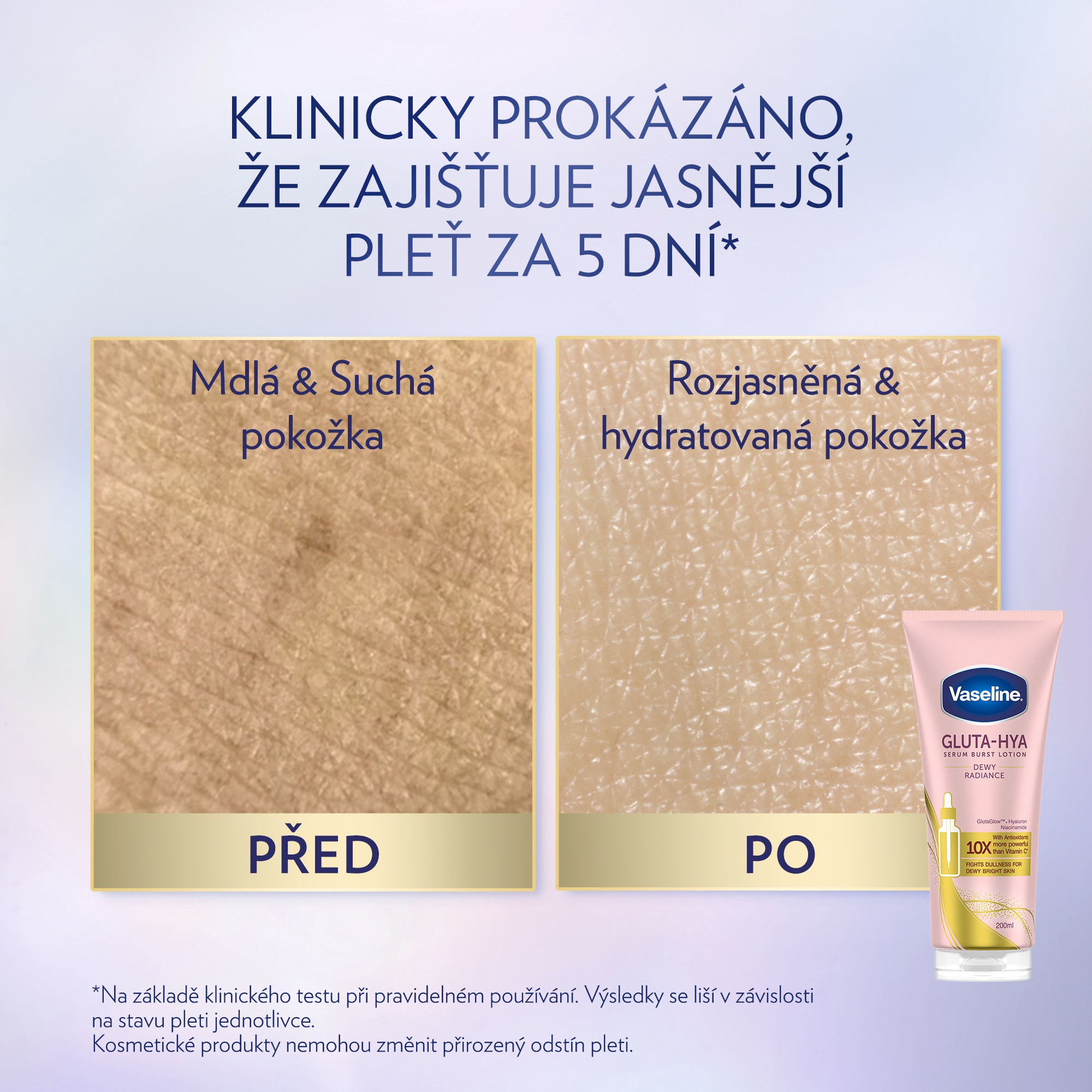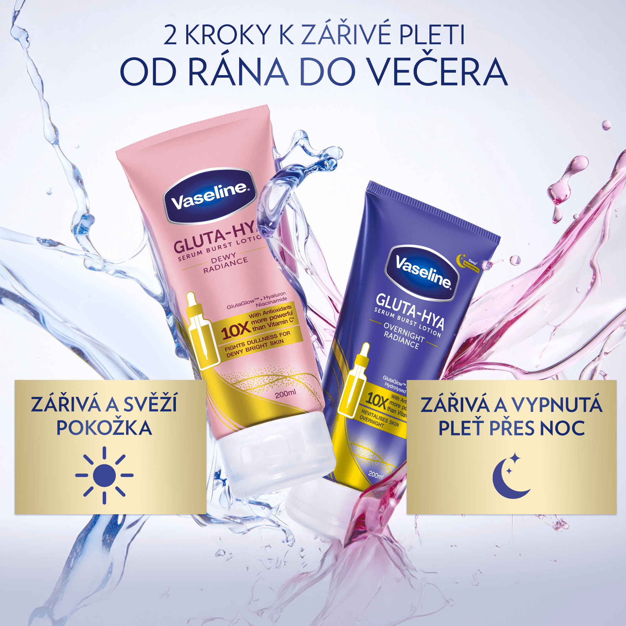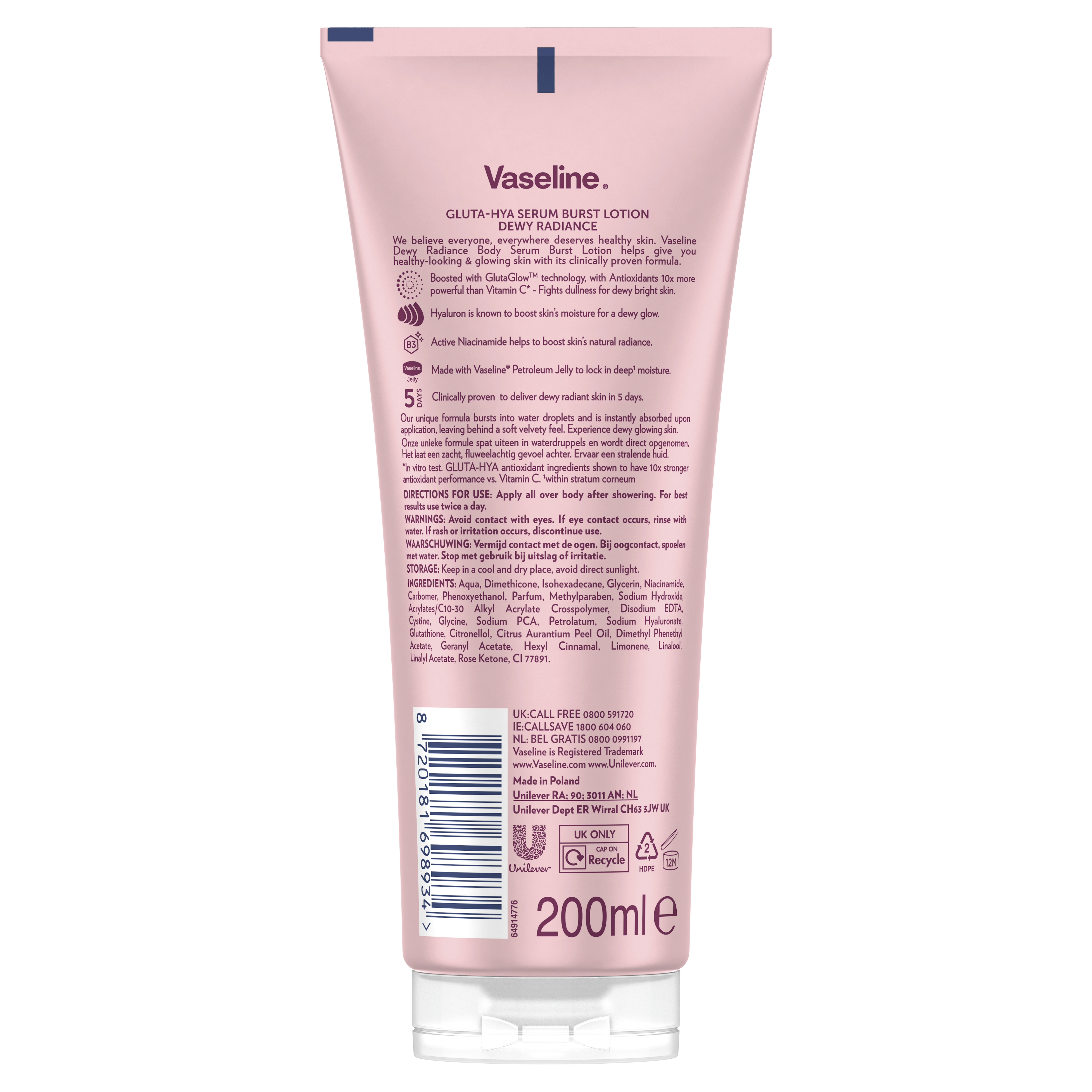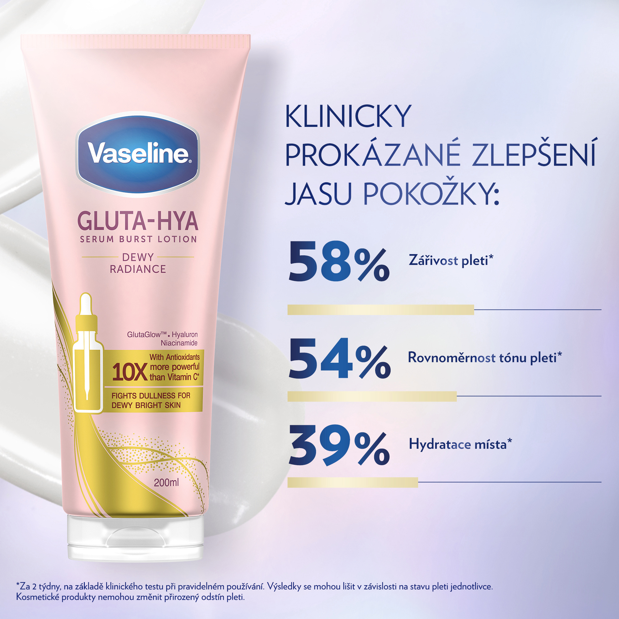Tělové sérum Gluta-Hya Dewy Radiance od Vaseline přináší intenzivní rozjasnění a hydrataci pro všechny typy pokožky. Jeho lehké složení s inovativními aktivními látkami zajišťuje viditelně zdravější, pružnější a zářivější pleť už po několika dnech používání. Díky technologii GlutaGlow podporuje přirozenou obranyschopnost pleti proti škodlivým vlivům a napomáhá obnově její vitality.