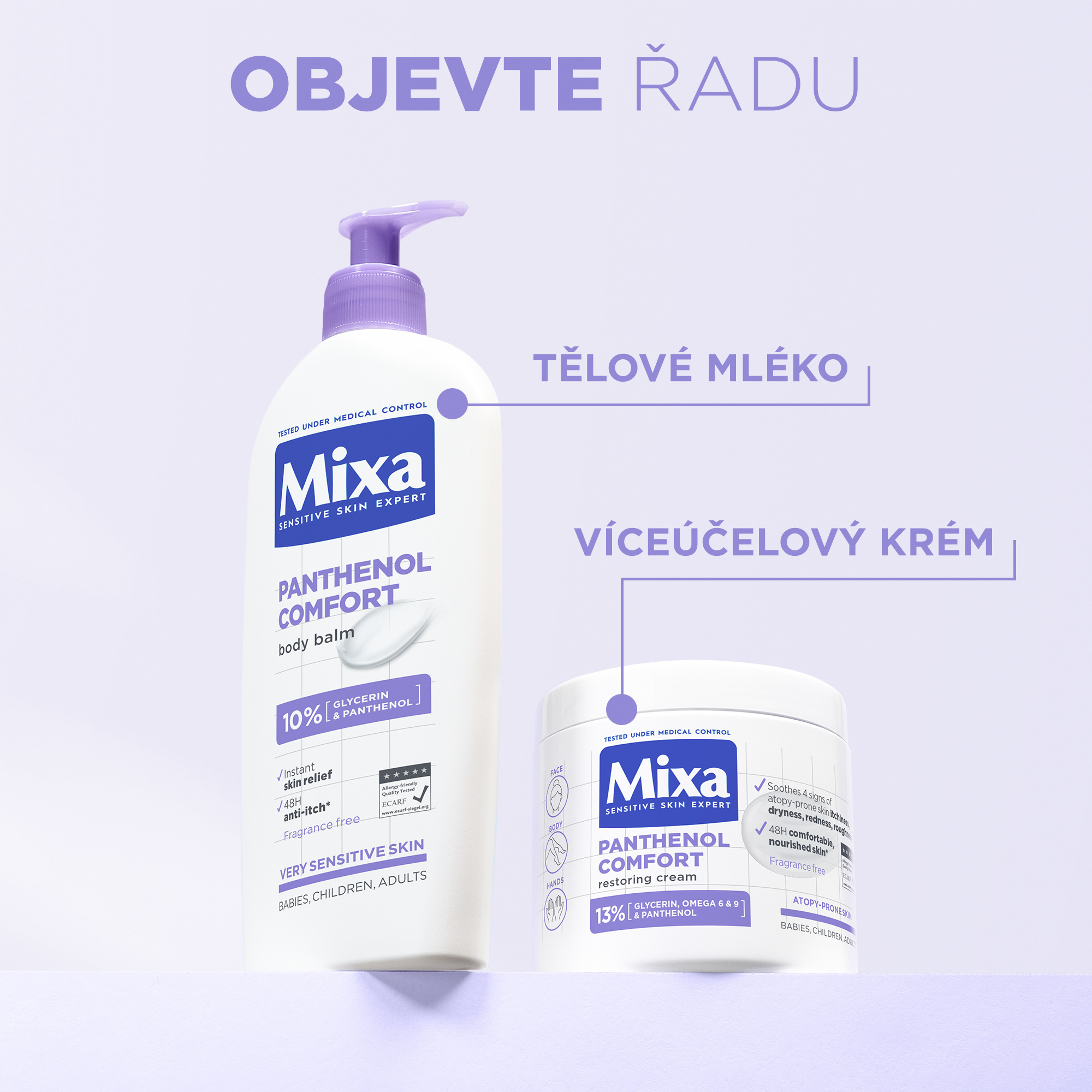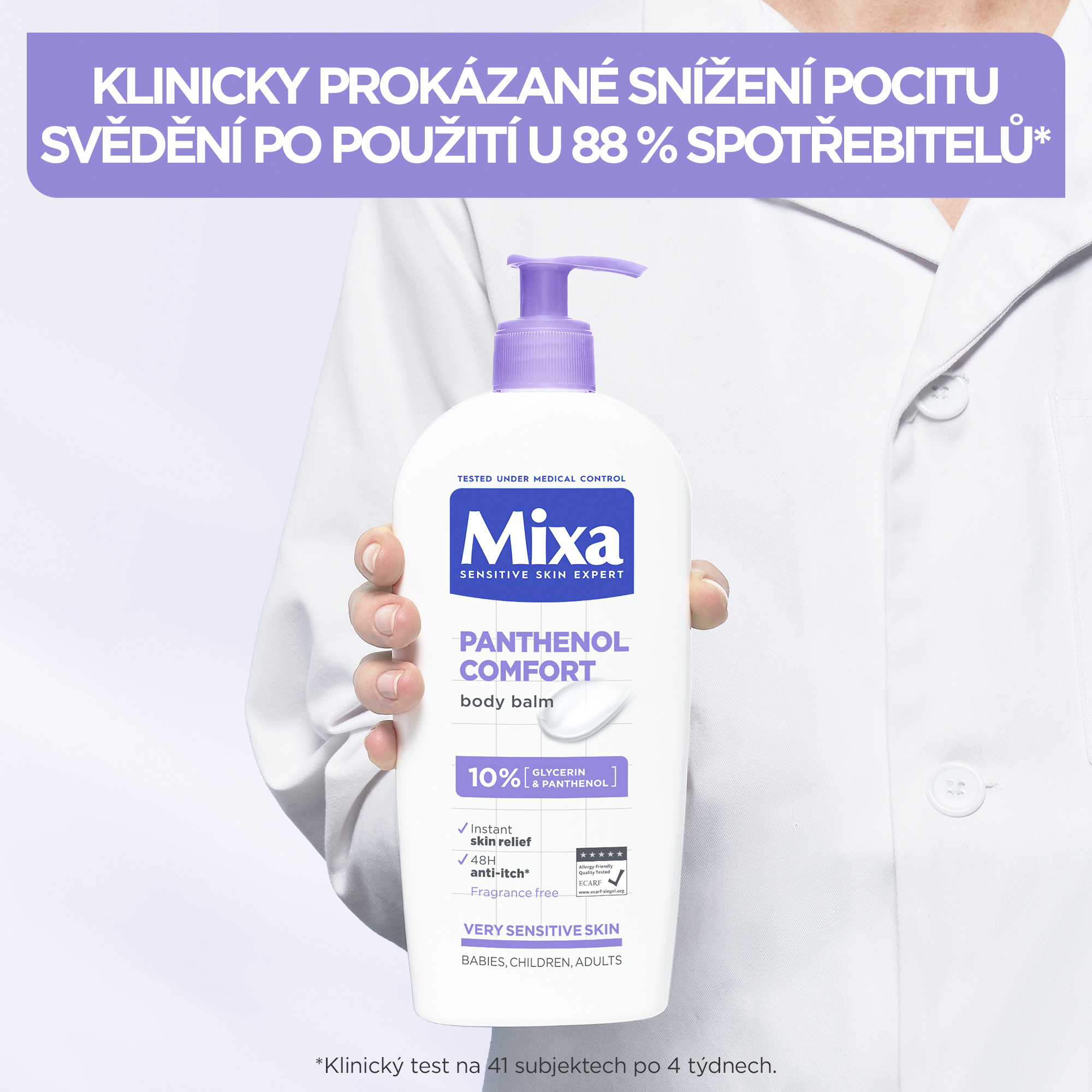 Mixa Panthenol Comfort zklidňující tělové mléko pro velmi citlivou pokožku s tendenci k svědění je obohacené o Panthenol, známý pro své zklidňující účinky a glycerin, známý pro své intenzivní hydratační a ochranné vlastnosti. Tělové mléko Panthenol Comfort je určené pro miminka, děti i dospělé. Tělové mléko je hypoalergenní a bez obsahu parfému. Po použití zklidňujícího tělového mléka je pokožka okamžitě intenzivně vyživená a pocit svědění je potlačen.
