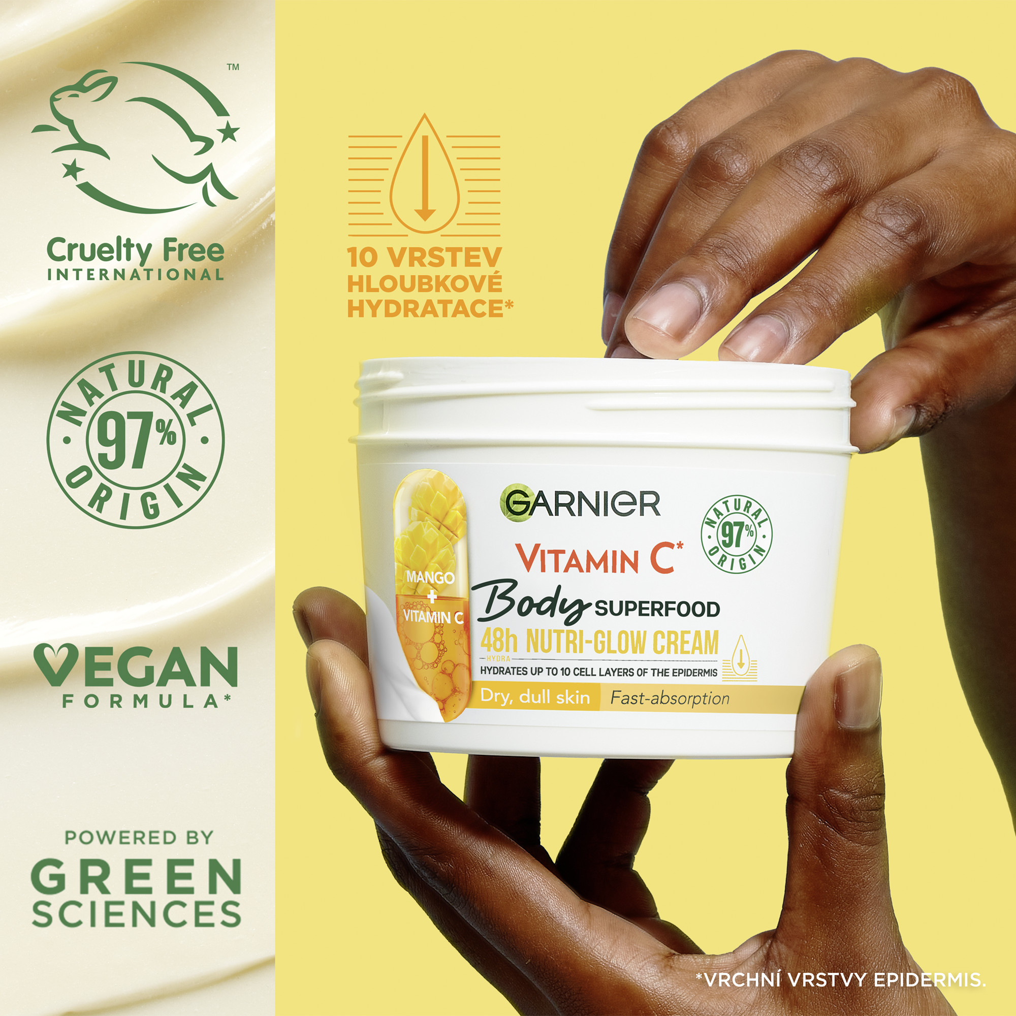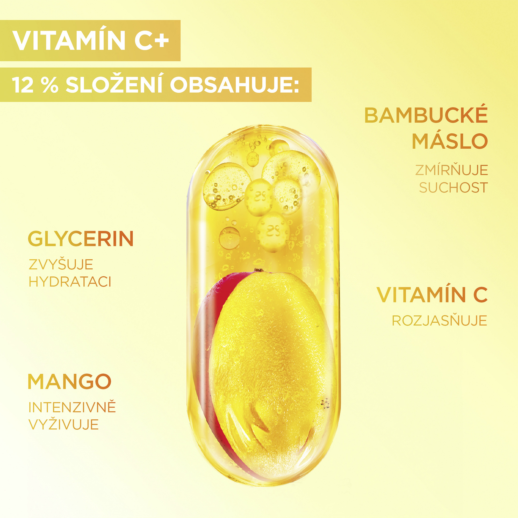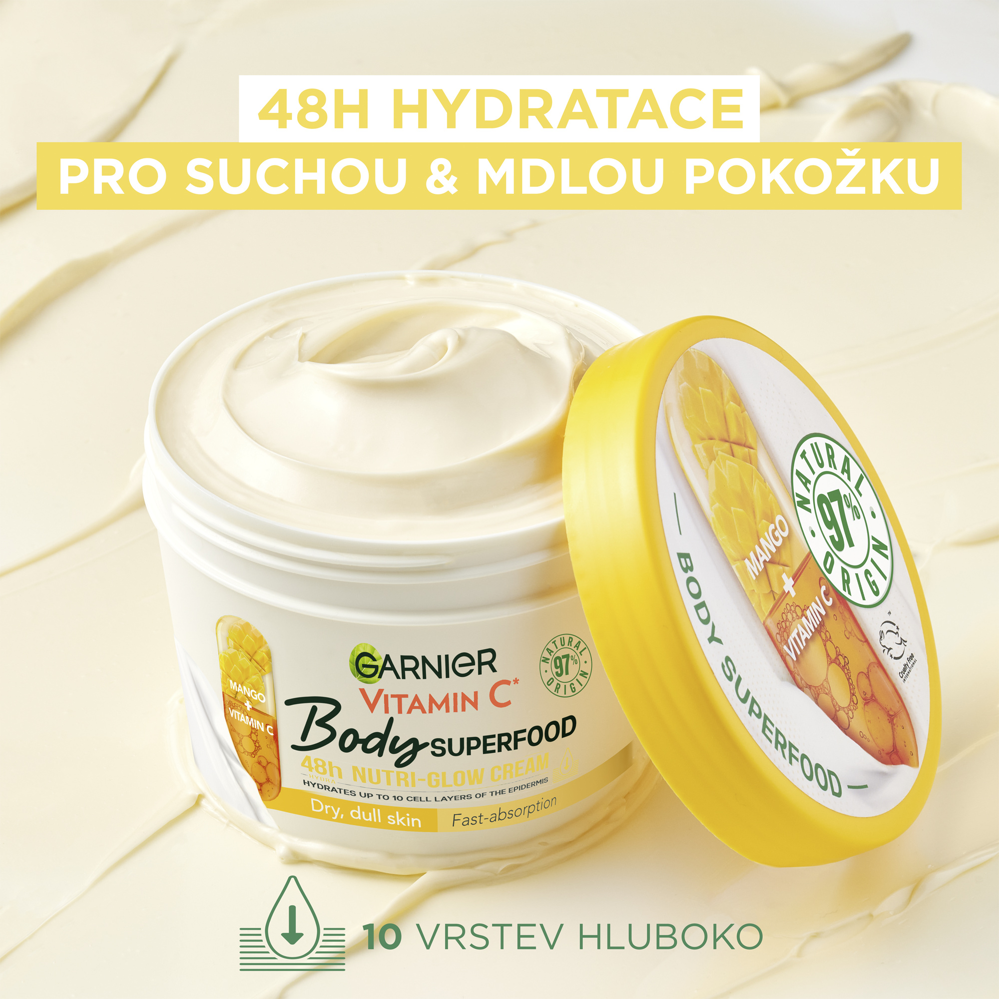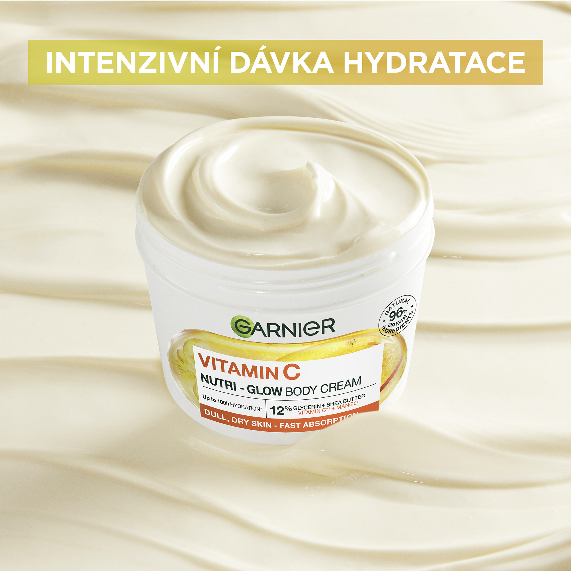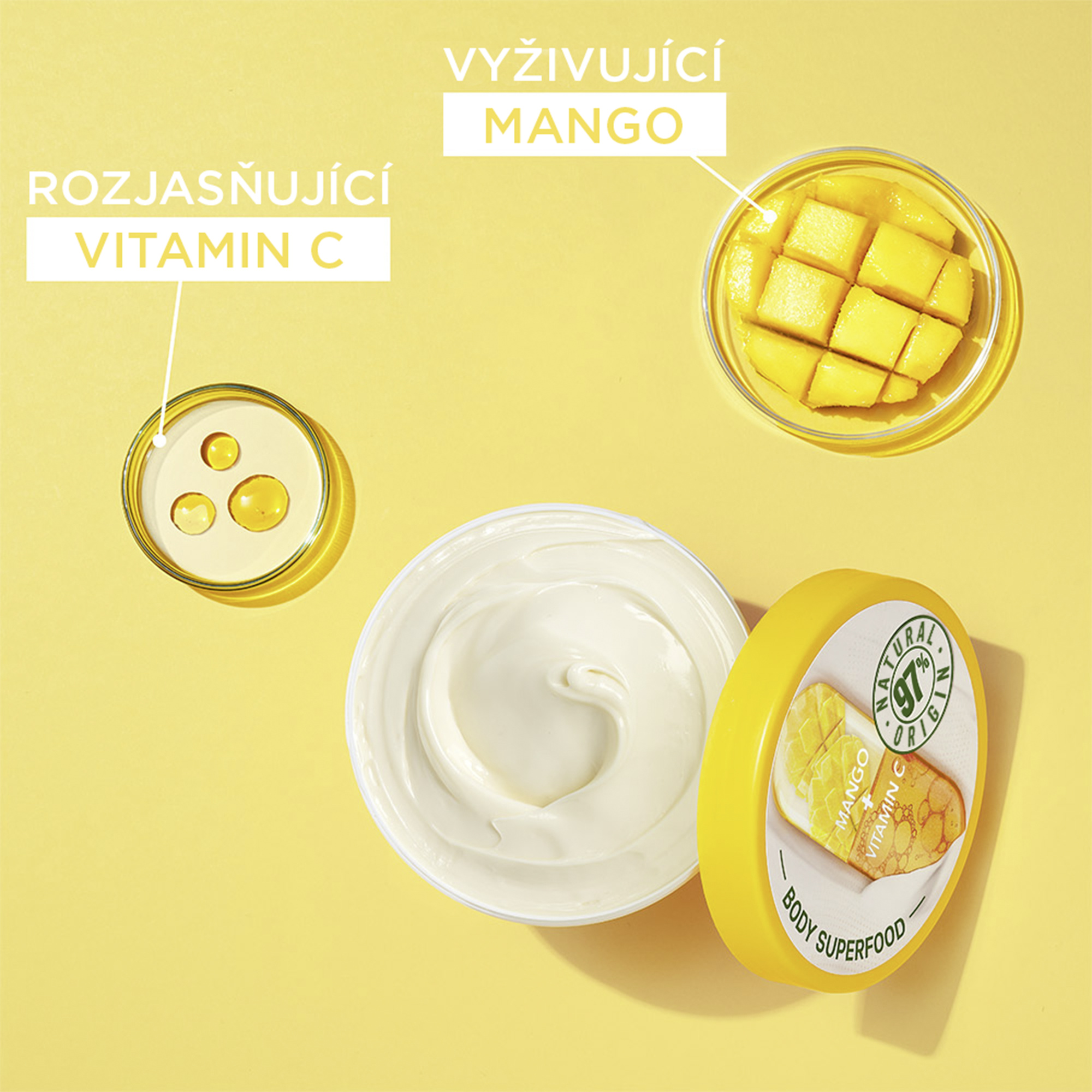 Garnier Body Food Krém na rozjasnění těla Mango + Vitamin C. Mango - extrakt, známý pro svou bohatost na živiny. Vitamin C* - dermální účinná látka známá pro své rozjasňující vlastnosti. *Derivát vitaminu C.