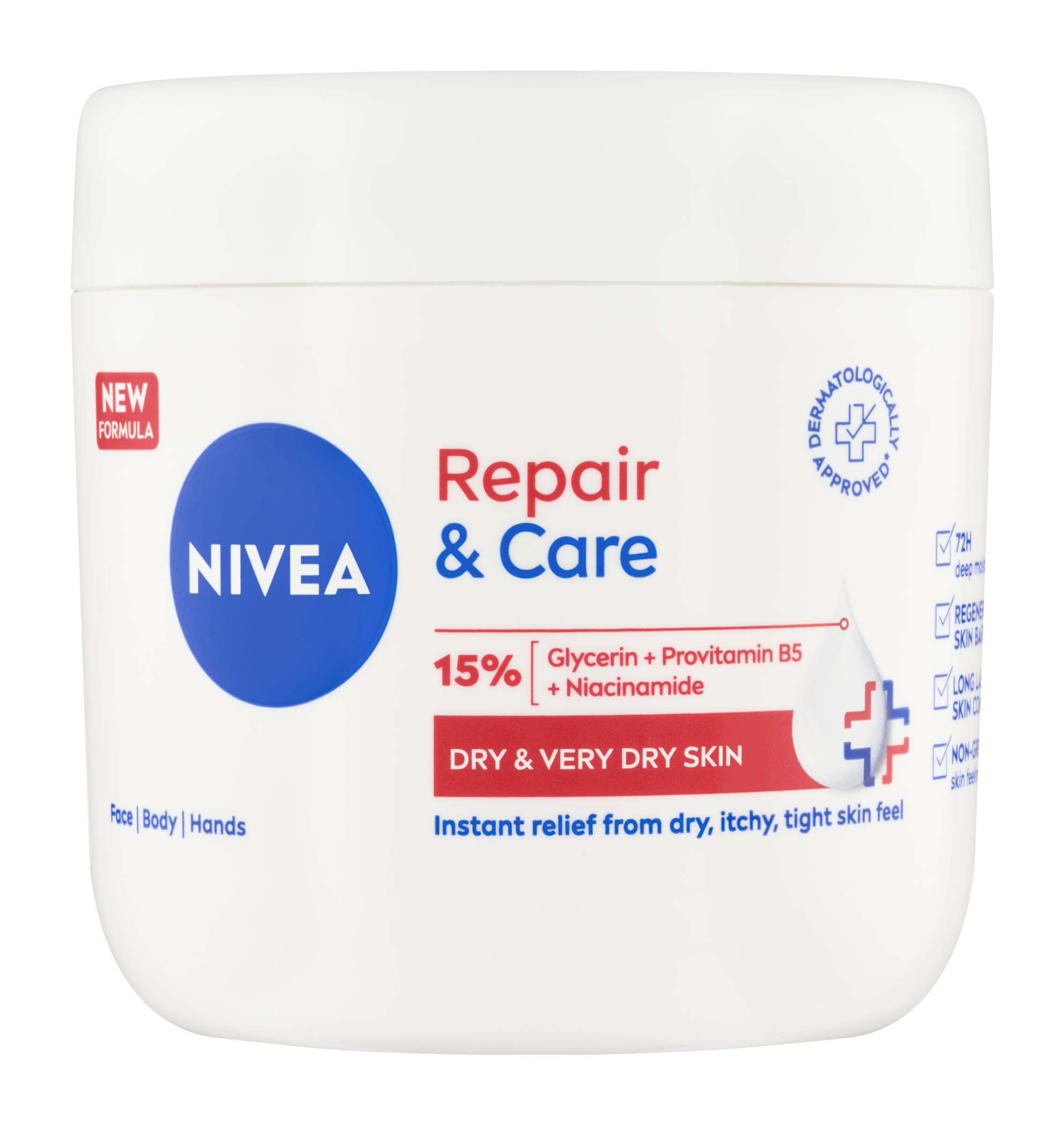 Nivea® Tělový krém Repair & Care obsahuje 15 % glycerinu, provitamínu B5 a niacinamidu. Okamžitě ulevuje velmi suché, svědivé a napjaté pokožce.