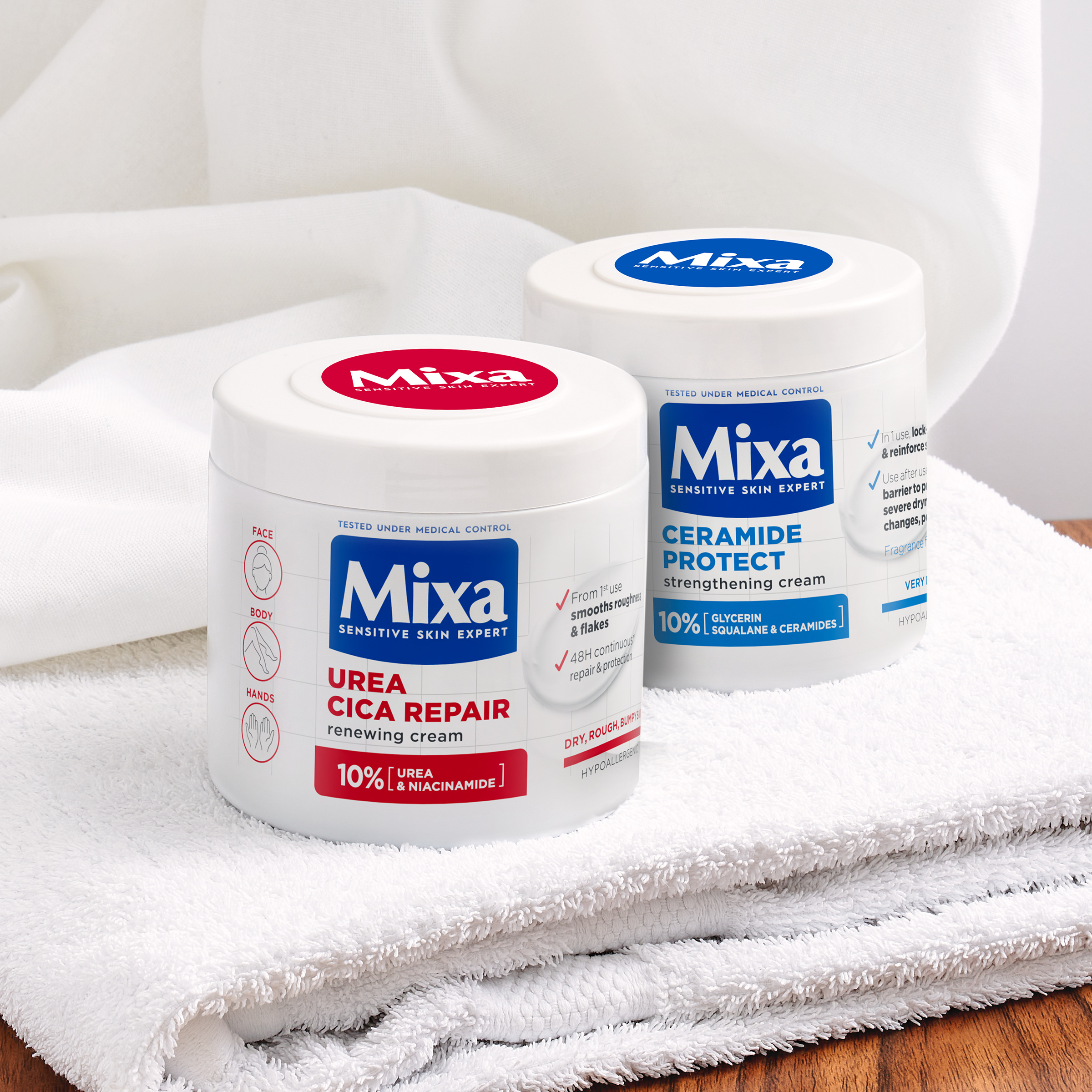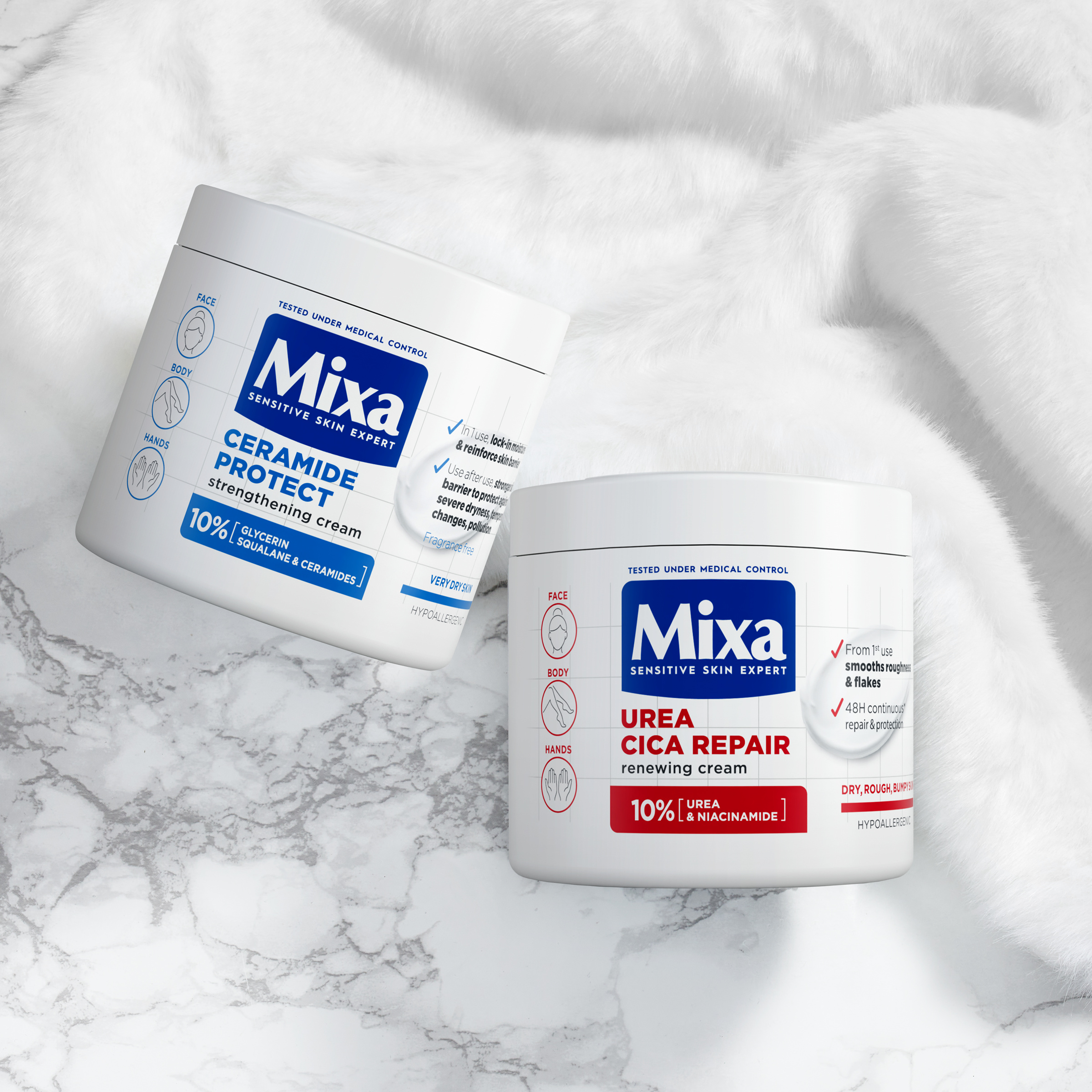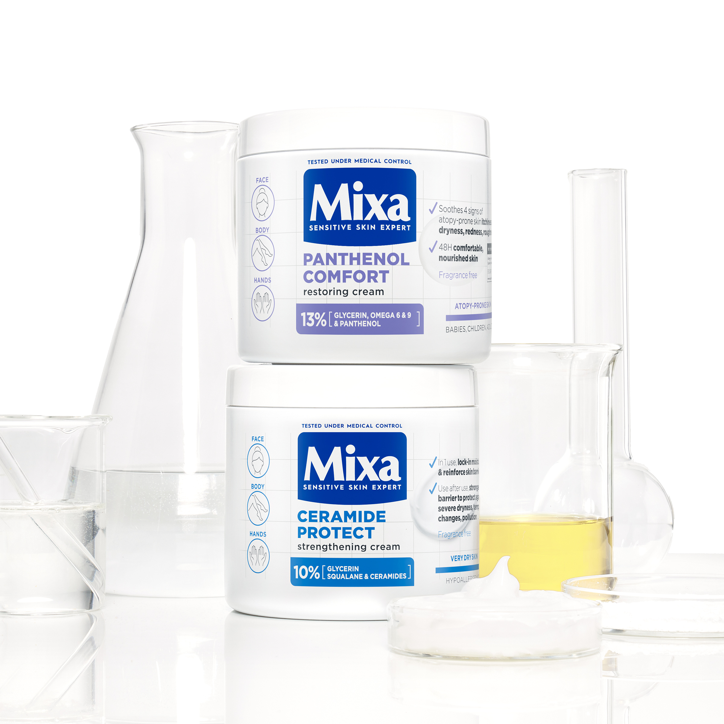 Hypoalergenní složení je obohacené o ceramidy, skvalan a glycerin. Ceramidy posilují ochrannou bariéru pokožky. Skvalan napomáhá udržet vlhkost v pokožce. Glycerín je známý pro své intenzivní hydratační a ochranné vlastnosti.
