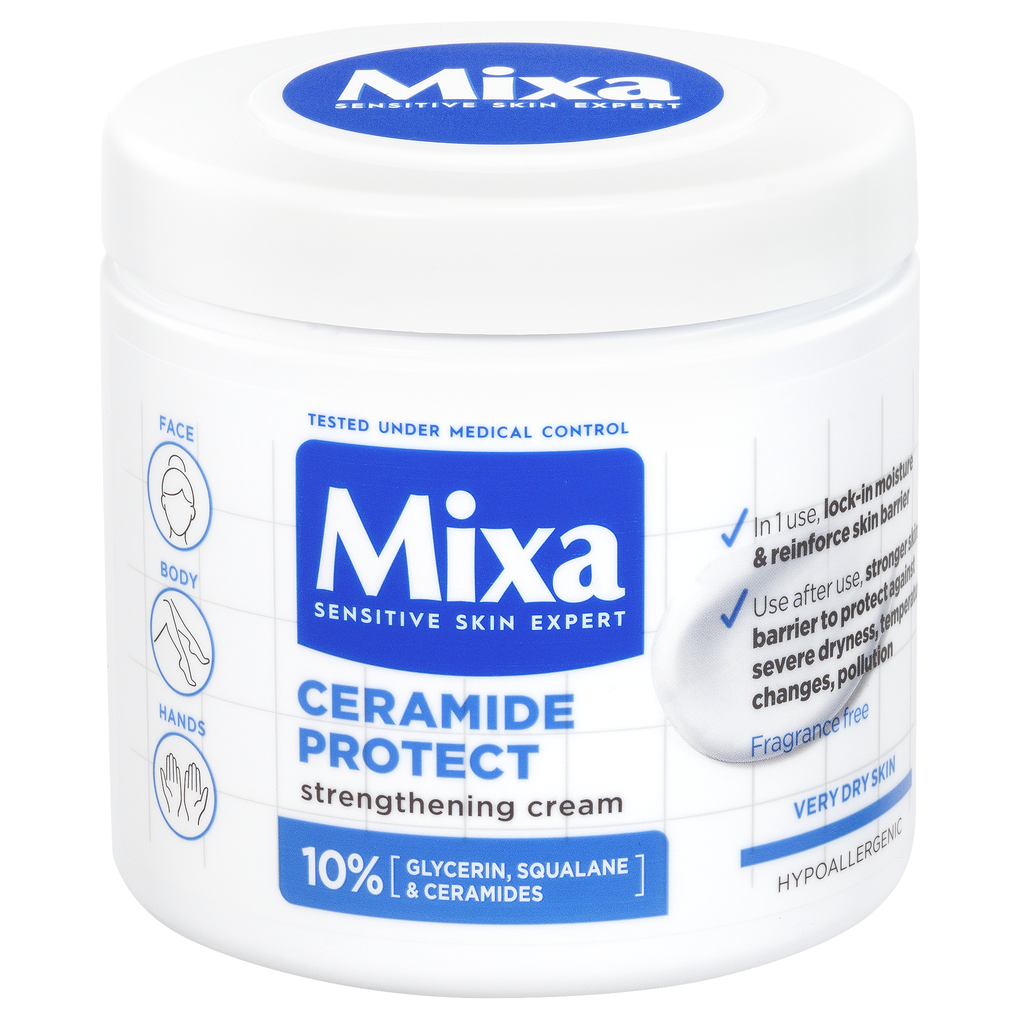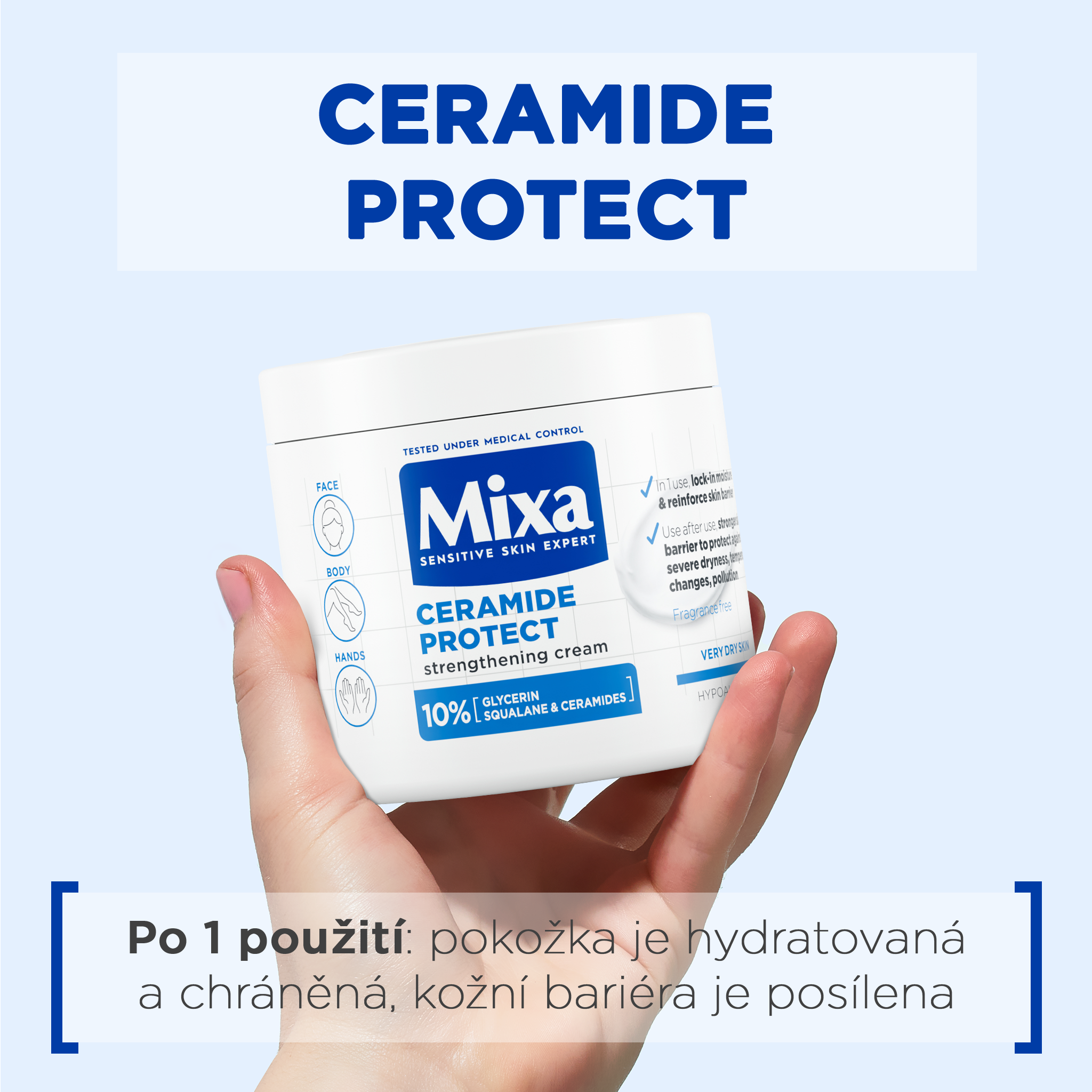 Mixa posilující tělová péče pro velmi suchou pokožku s jemným složením obohaceným o ceramidy, skvalan a glycerin je vhodná pro citlivou pokožku. Nemastná textura, která se rychle vstřebává hydratuje a posiluje ochrannou bariéru pokožky