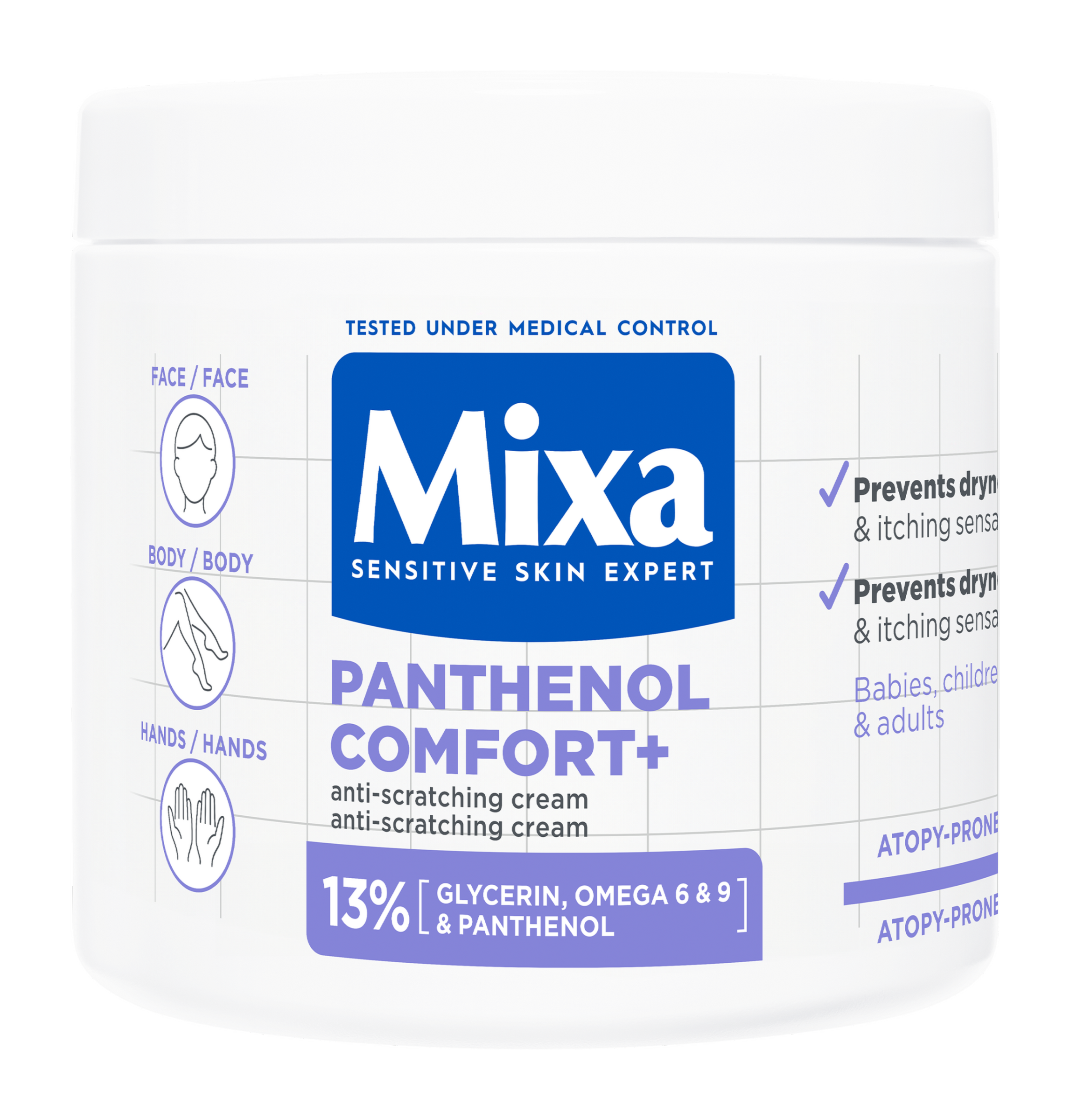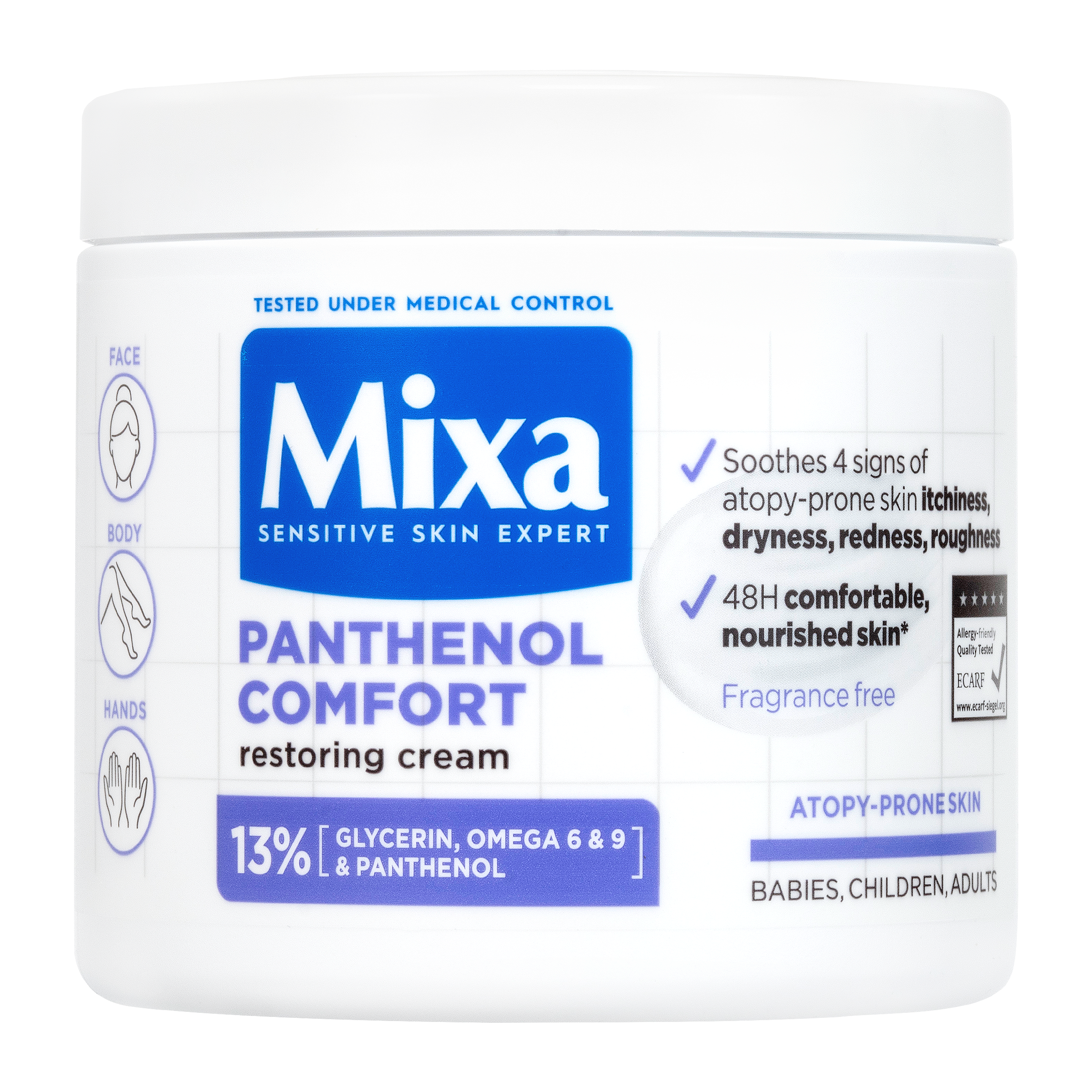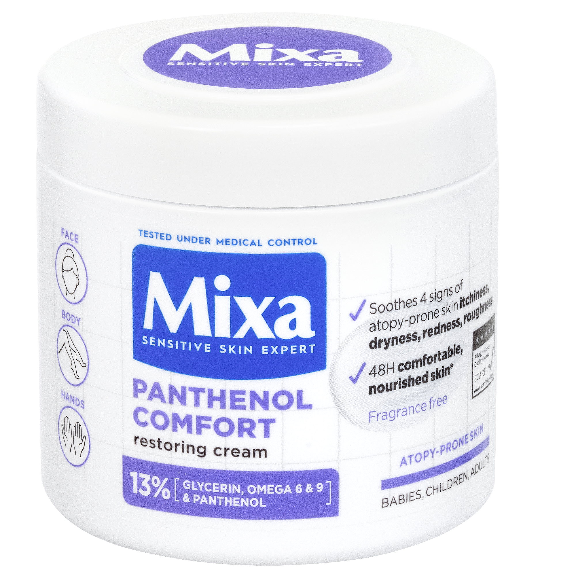 Mixa obnovující tělová péče i pro pokožku se sklonem k atopii má jemné složení obohacené o pathenol, glycerin a omega 6 & 9. Nemastná textura se rychle vstřebává do pokožky. Zmírňuje pocit 4 příznaků pokožky se sklonem k atopii: svědění, zarudnutí, drsnost, suchost