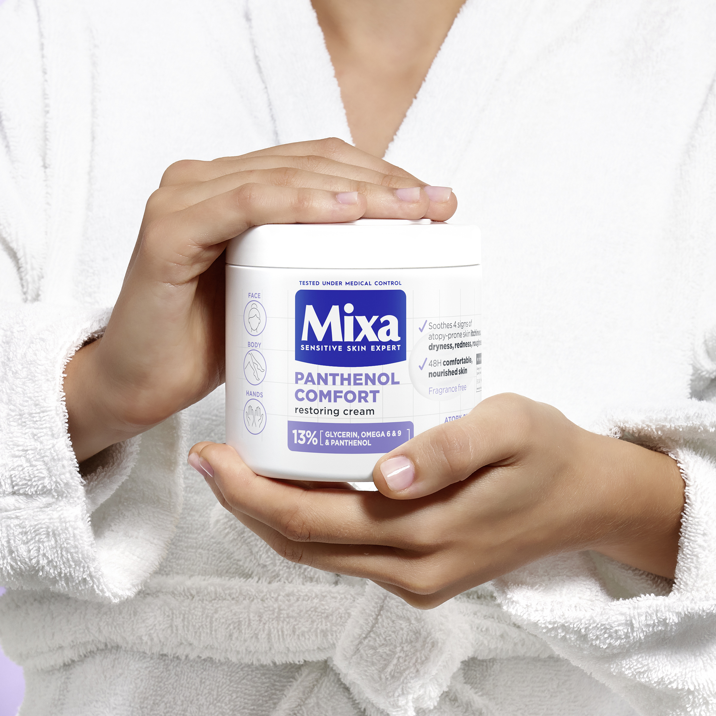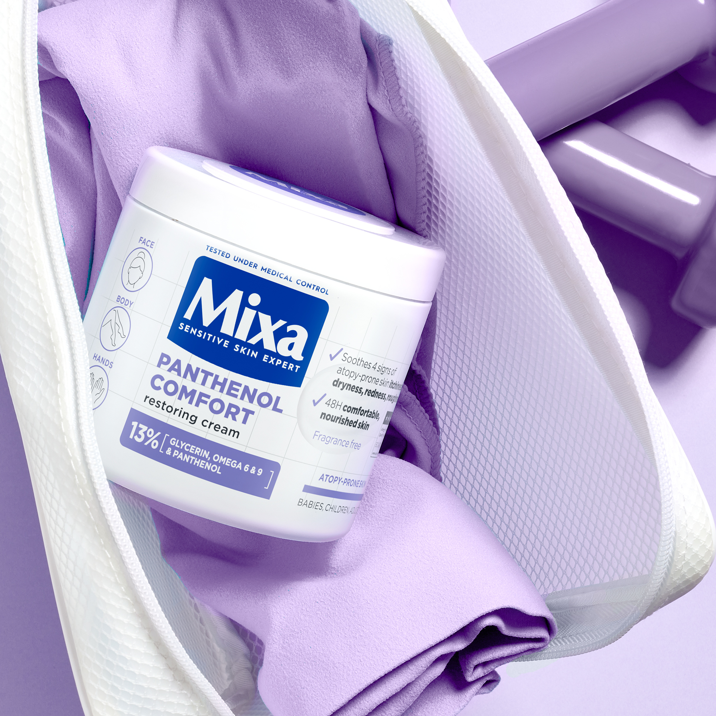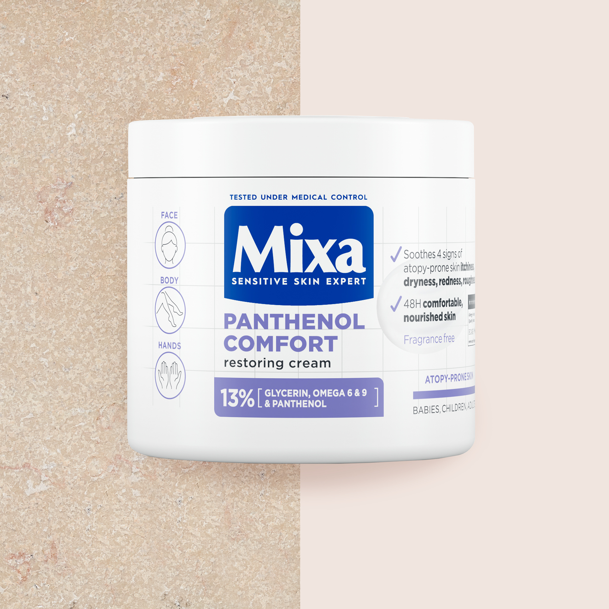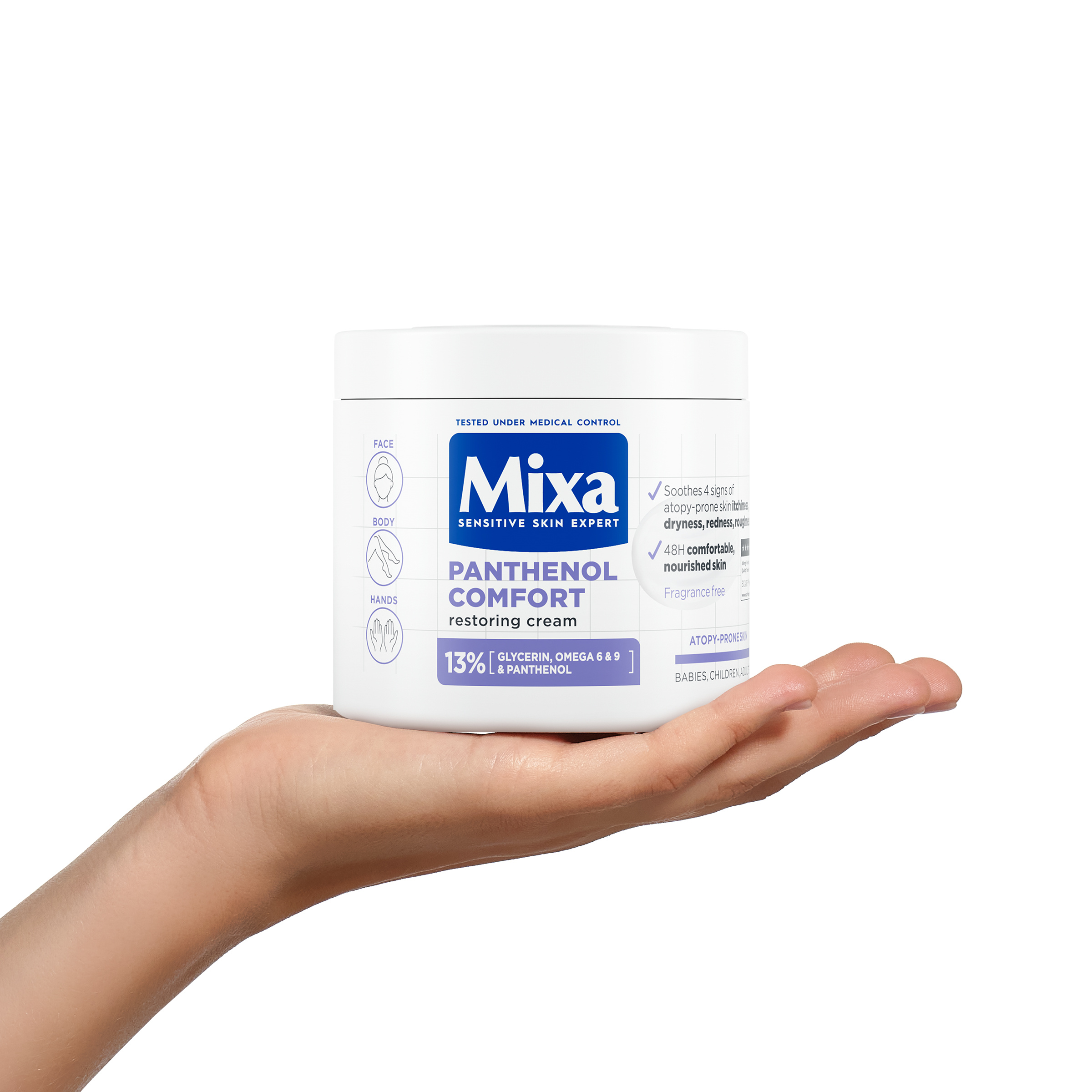 Mixa obnovující tělová péče i pro pokožku se sklonem k atopii má jemné složení obohacené o pathenol, glycerin a omega 6 & 9. Nemastná textura se rychle vstřebává do pokožky. Zmírňuje pocit 4 příznaků pokožky se sklonem k atopii: svědění, zarudnutí, drsnost, suchost