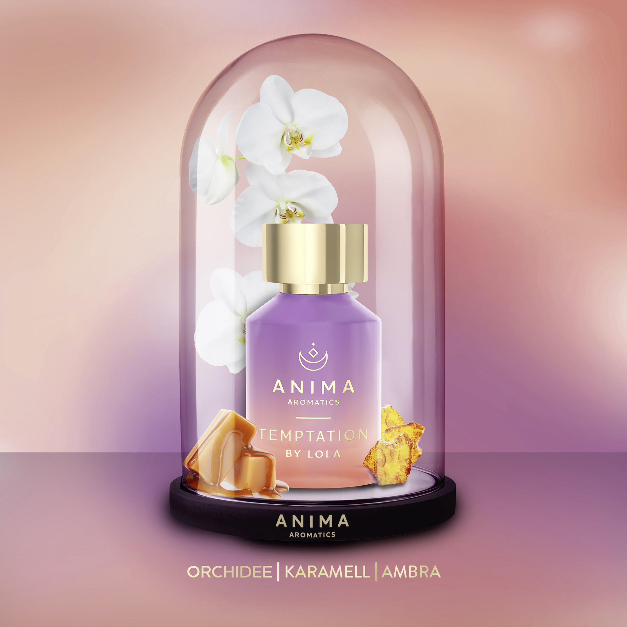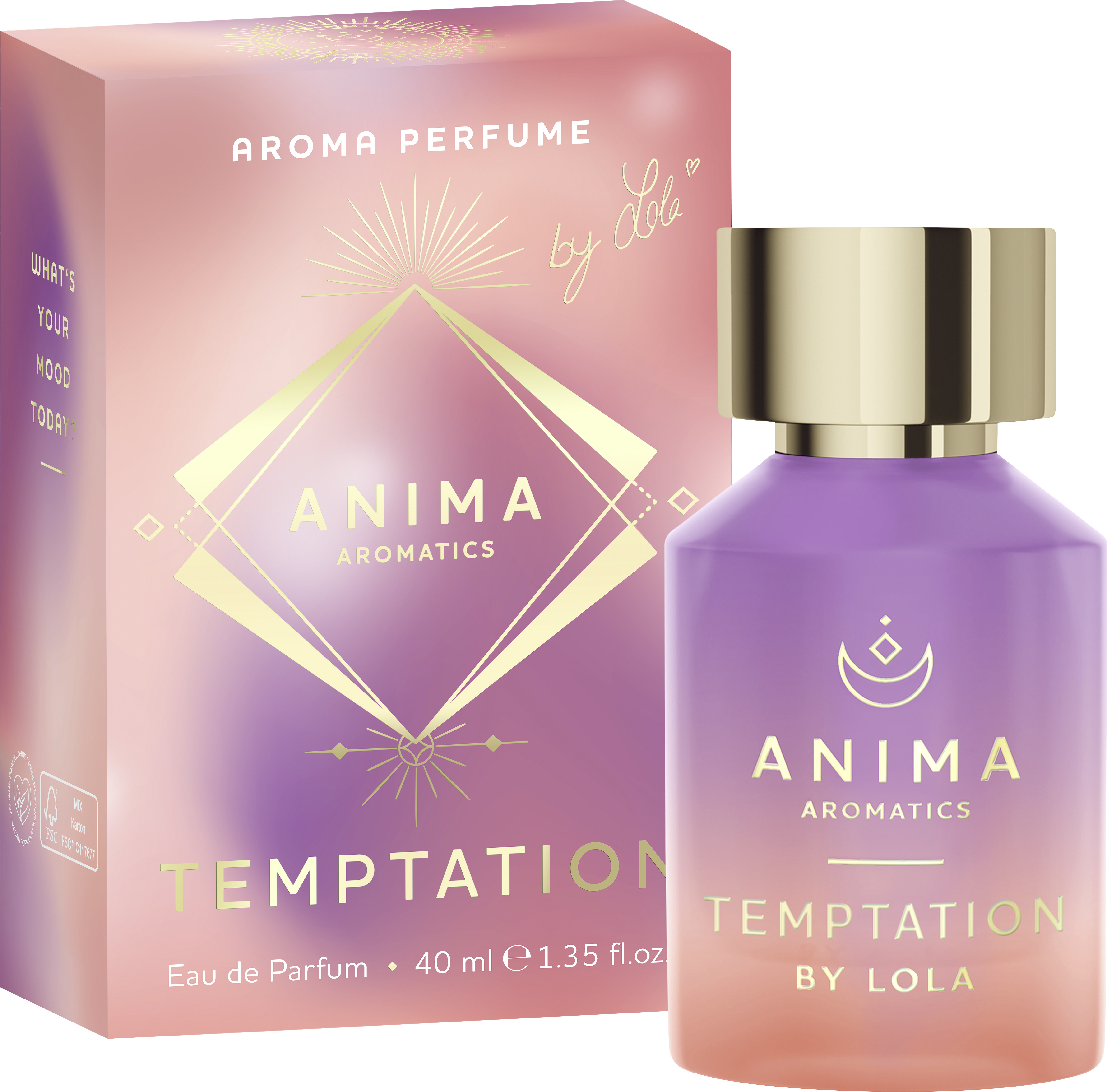 Parfémovaná voda Temptation od Anima Aromatics byla vytvořená ve spolupráci s moderátorkou Lolou Weippert. Kombinuje zemito-kořeněné a květinové tóny a vytváří tak kompozici plnou přitažlivosti. Kromě toho obsahuje esenciální olej pačuli, který má pozitivní vliv na náladu. Profil vůně dotváří karamel a pižmo. Moderní design ve fialových a korálových tónech dokonale doplňuje kolekci vůní.