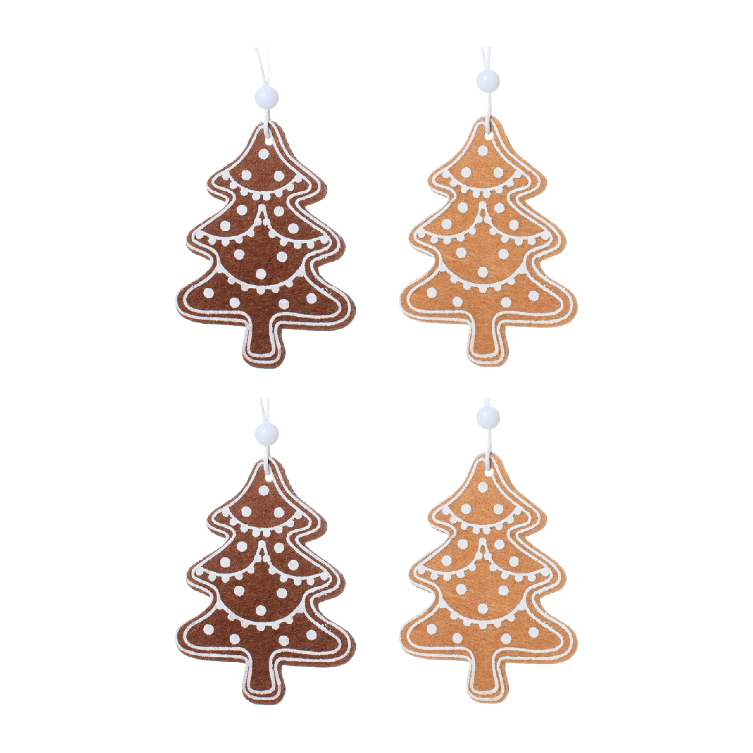Stylová textilní ozdoba ve tvaru perníkového stromečku s jemným bílým zdobením připomínajícím cukrovou polevu. Vhodná k zavěšení na vánoční stromeček, věnec nebo do interiéru.