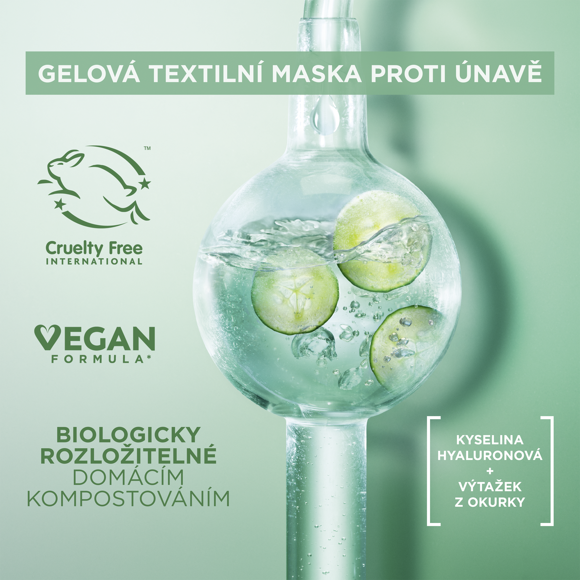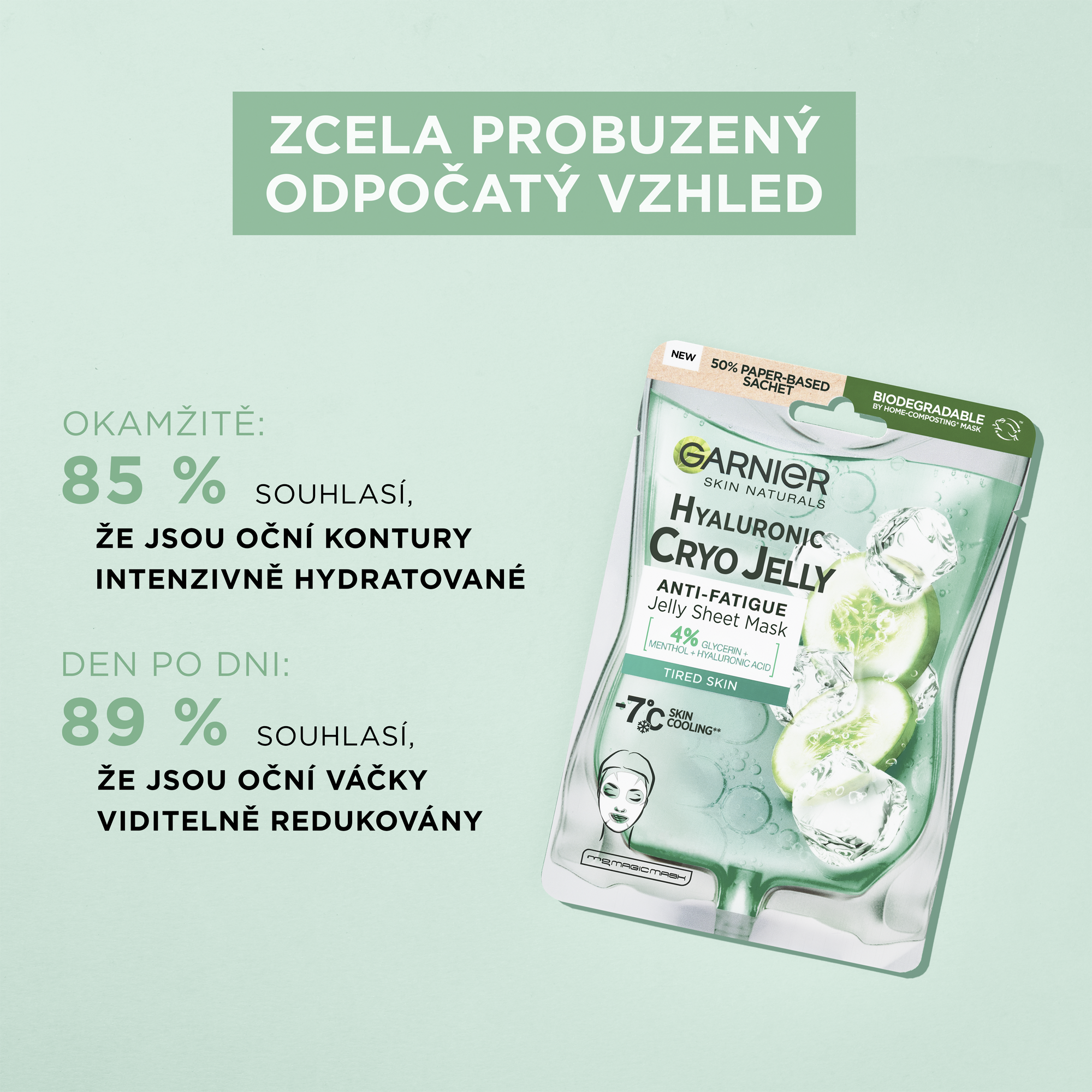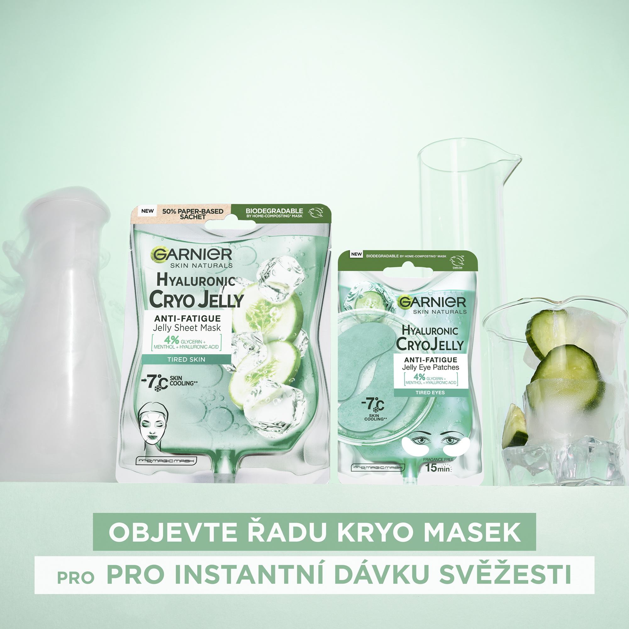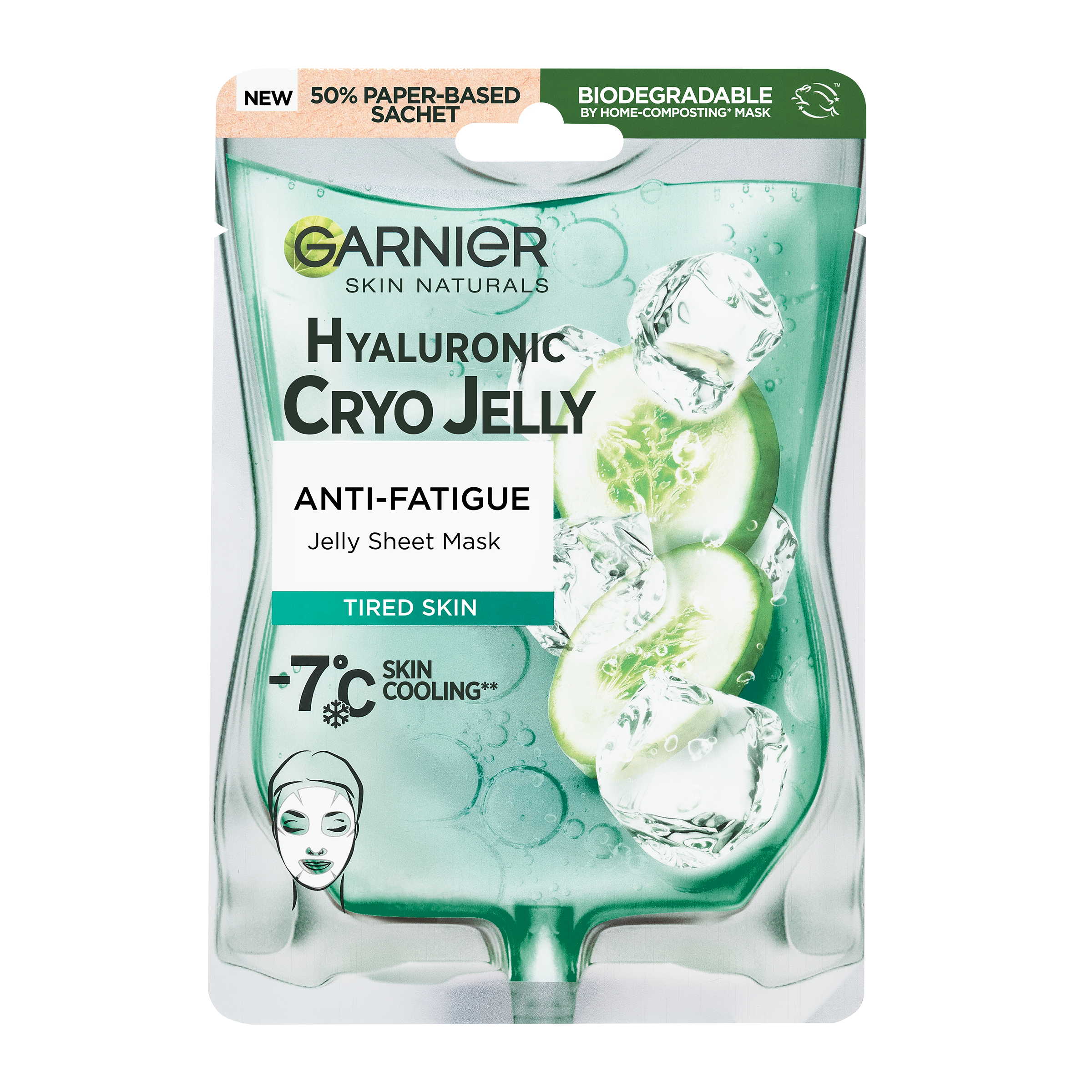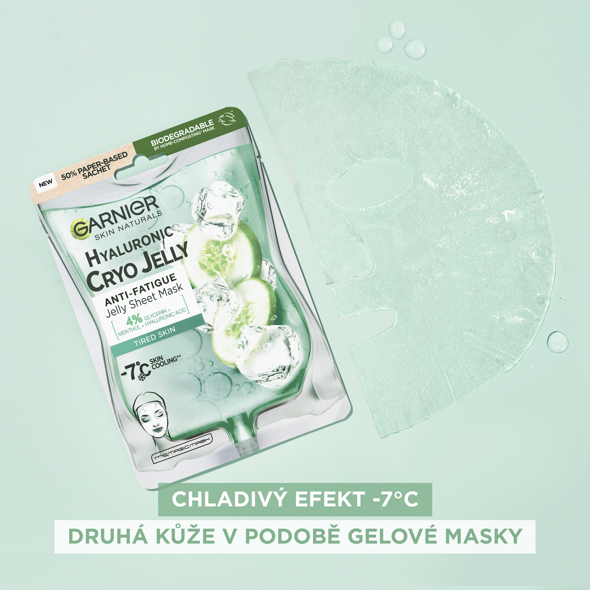 Textilní maska Cryo Jelly je hydratační gelová maska s chladivým efektem obohacená o kyselinu hyaluronovou a výtažek z okurky. Ochlazující technologie snižuje teplotu pokožky o 7 °C. Složení se 4% glycerinu + mentolu + kyseliny hyaluronové zmírňuje projevy únavy pleti.