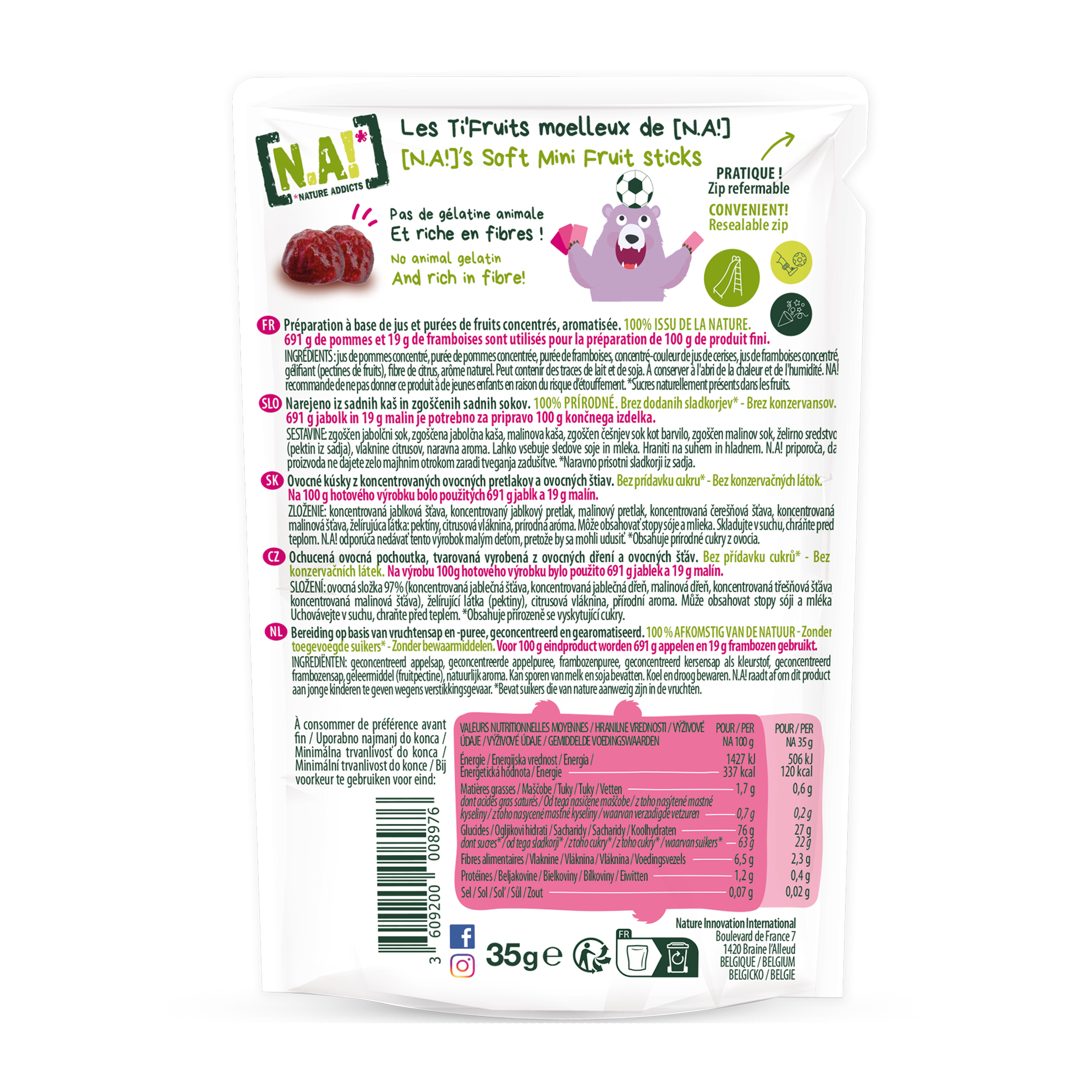 koncentrát z jablečné šťávy, koncentrát z jablečného pyré, malinové pyré, barvící koncentrát z třešňového džusu, koncentrát z malinové šťávy, želatina (pektin z ovoce), přírodní aroma.