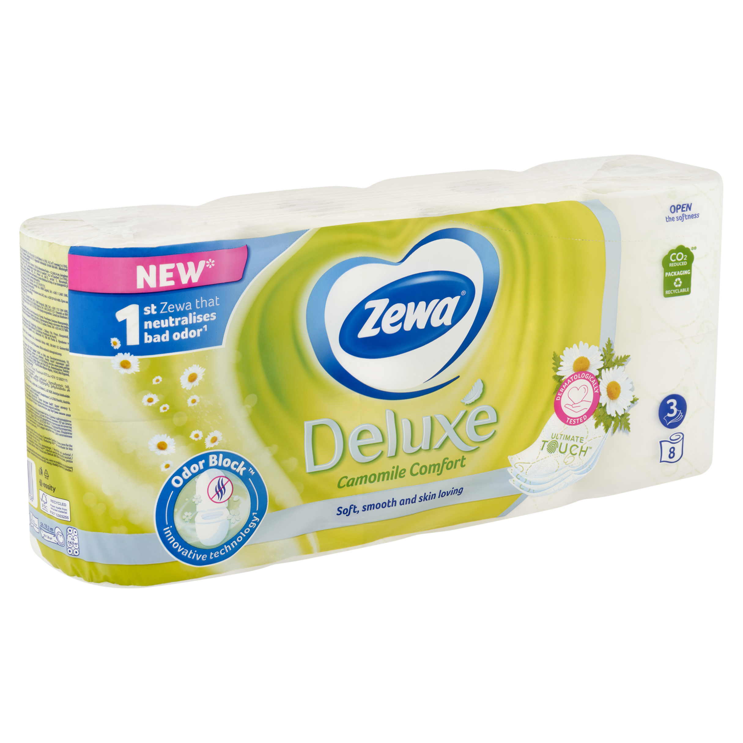 Zewa Deluxe Camomile Comfort toaletní papír nabízí dokonalou rovnováhu mezi funkčností - díky třem vrstvám a komfortem jemných a pevných polštářků. Je tak ideální pro rodiny, které chtějí pečovat o svou pokožku, aniž by slevily z kvality. Navíc s technologií OdorBlock™ působí heřmánková vůně jako neutralizátor zápachu, který eliminuje nepříjemné pachy ve vaší koupelně. Jemný dotek toaletního papíru Zewa Deluxe Camomile Comfort vám dodá pocit čistoty a pohodlí, ale nabízí i mnohem více než jen to. Rozpustná a recyklovatelná rulička AquaTube® může být bez obav spláchnuta přímo do toalety. Navíc je balení toaletního papíru recyklovatelné! Toaletní papír Zewa Deluxe Camomile Comfort je vytvořen z přírodních vláken, díky kterým je hedvábně jemný a je tak ideální pro jemnou pokožku, které nabízí maximální pohodlí. Věříme, že hedvábně jemné polštářky, které si však zachovali svou pevnost, uspokojí potřeby vás i vaší rodiny. Papír je navíc dermatologicky testován, aby se minimalizovaly nežádoucí kožní reakce. Vaši koupelnu naplní uklidňující vůně heřmánku, která vám dodá klid a pohodu. Ale to není všechno, součástí toaletního papíru Zewa je nyní nová inovativní technologie OdorBlock™, kdy příjemná heřmánková vůně ve skutečnosti slouží jako neutralizátor zápachu a účinně neutralizuje nepříjemné pachy z koupelny. Na rozdíl od jiných vonných produktů, které nepříjemné pachy pouze maskují. Co více byste si mohli přát?