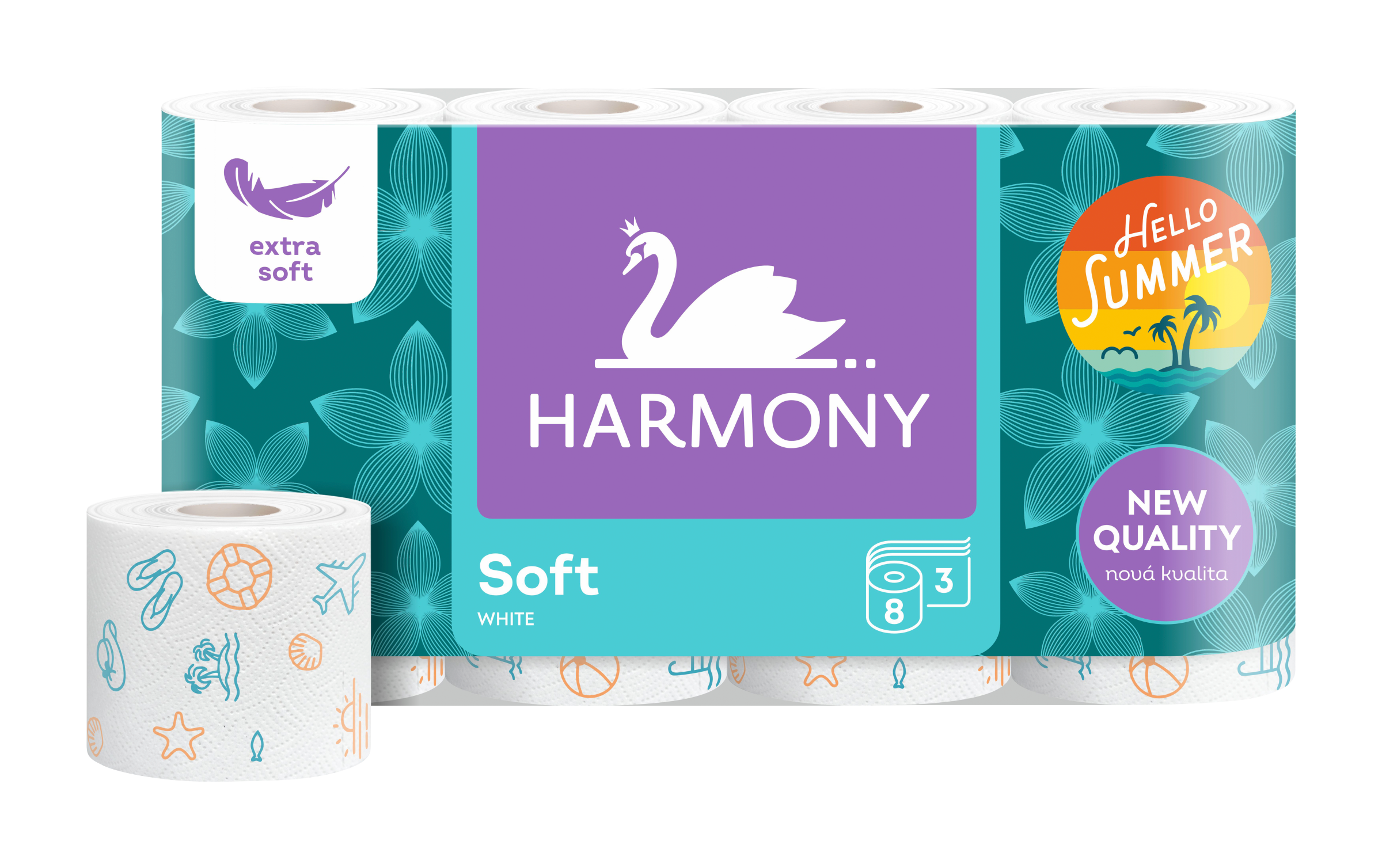 Bílý, neparfemovaný, 3vrstvý toaletní papír HARMONY SOFT 8, balení obsahuje 8 rolí s návinem 17 m. Dermatologicky testováno.