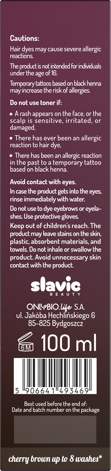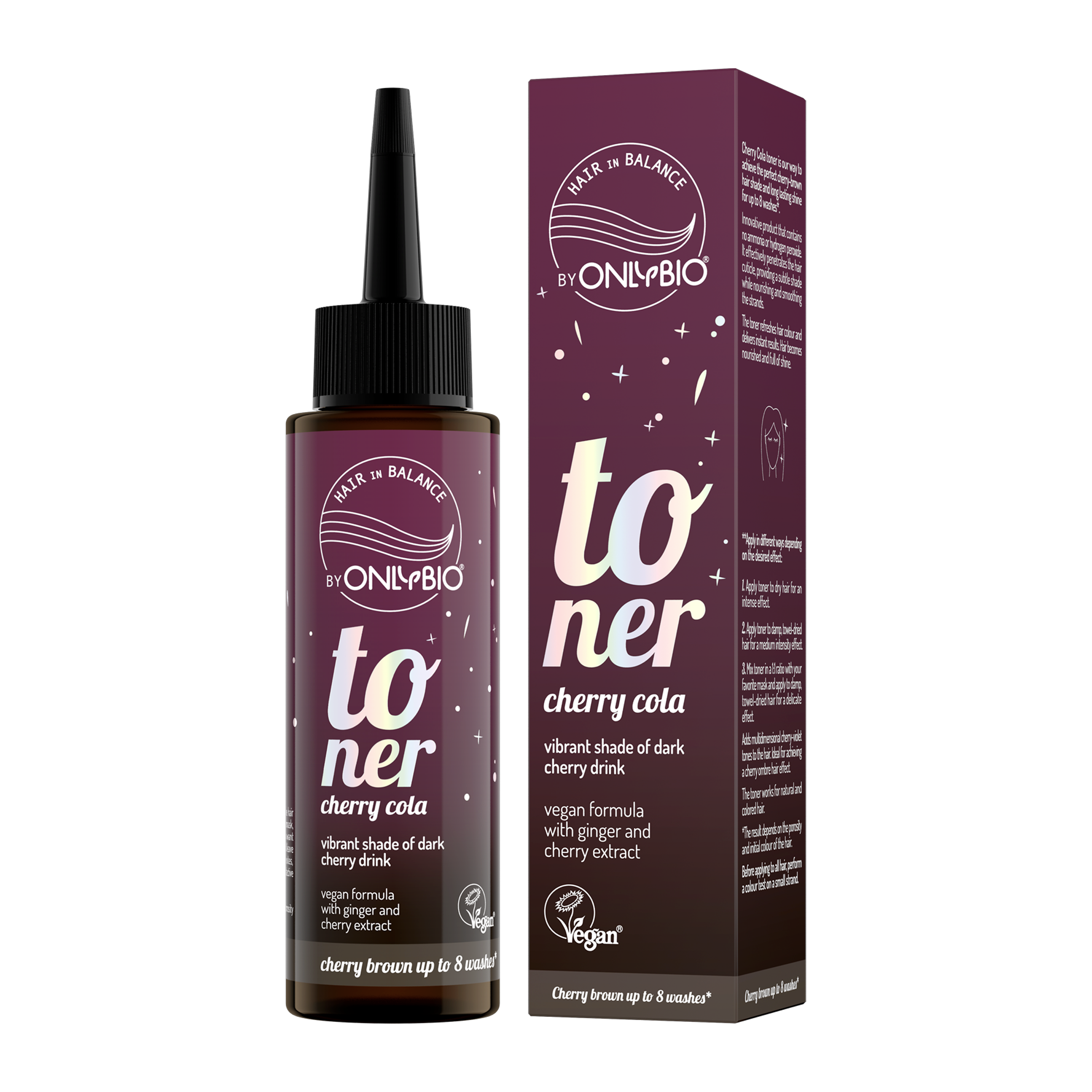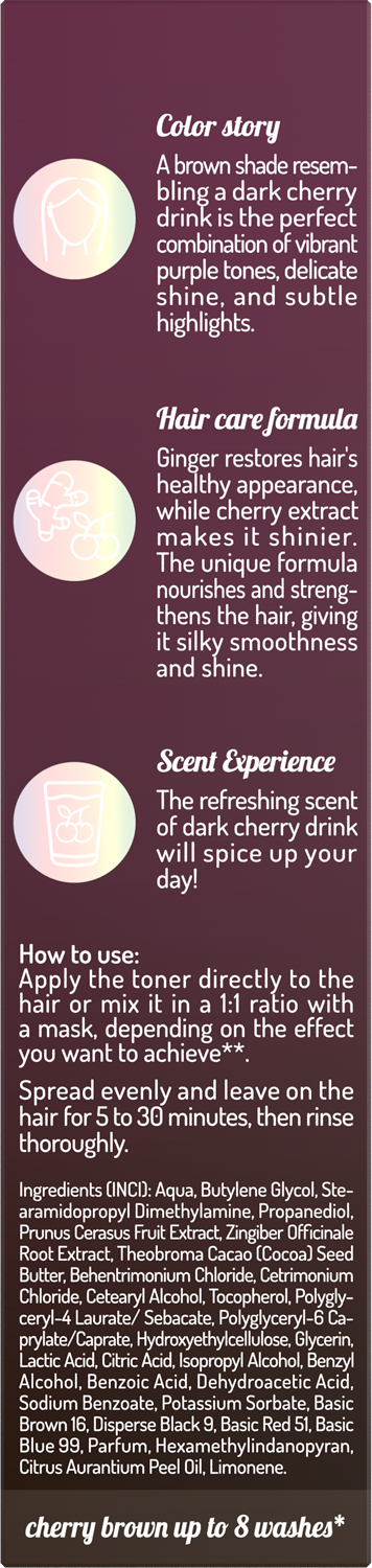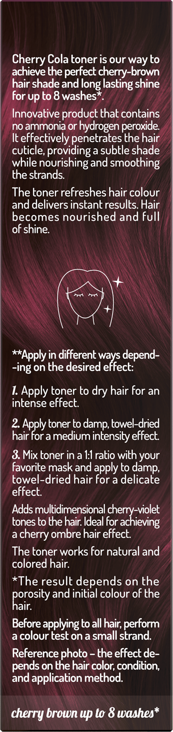 Toner Cherry Cola přináší nádherný třešňově-hnědý odstín a dlouhotrvající lesk vlasů až na 8 umytí. Tento inovativní produkt neobsahuje amoniak ani peroxid vodíku. Účinně proniká do kutikuly vlasů, dodává jemný odstín a zároveň je vyživuje a uhlazuje. Toner osvěžuje barvu a poskytuje okamžité výsledky, přičemž vlasy zanechává zdravé a lesklé. Vlasy jsou krásné a vyživené.