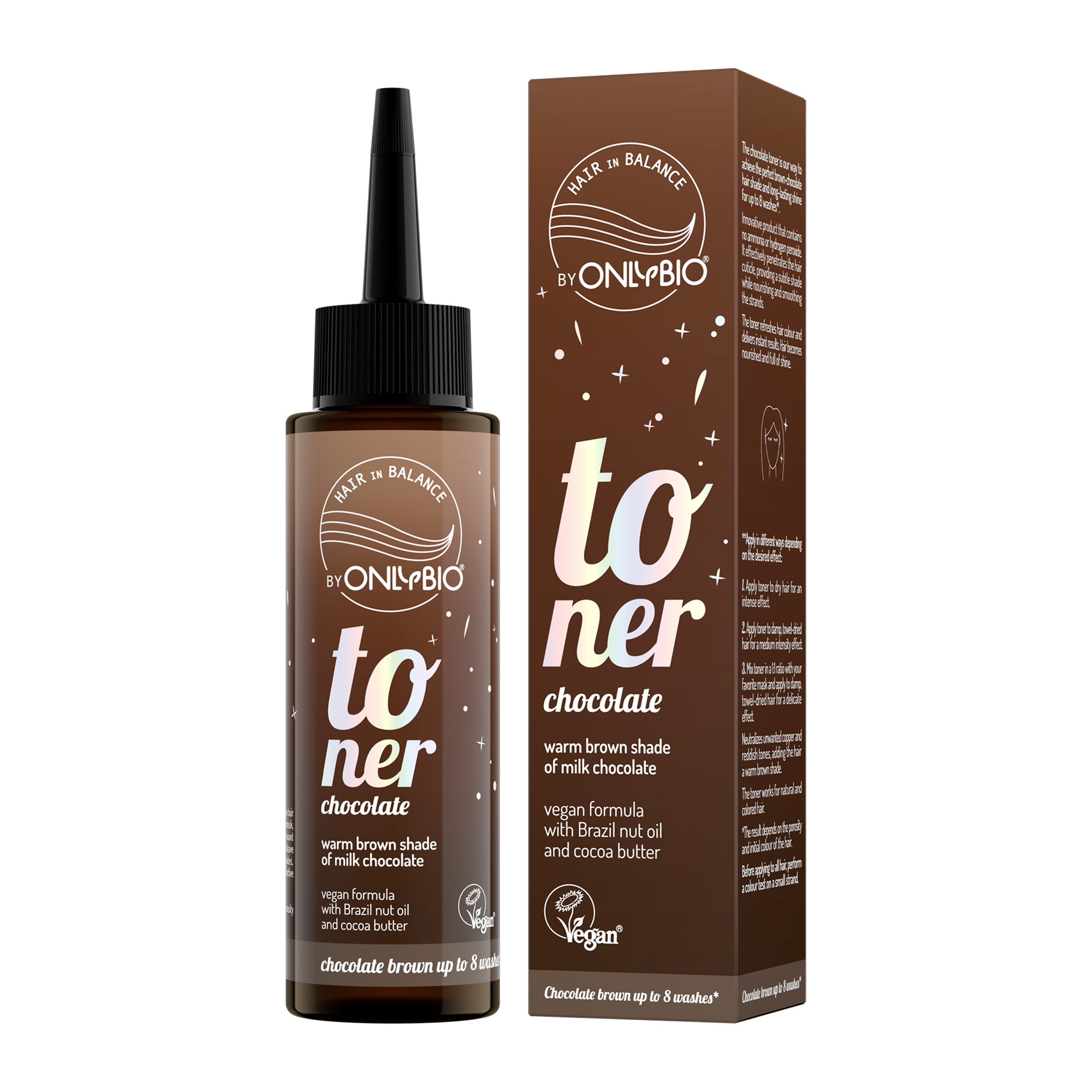 Toner Chocolate přináší nádherný hnědo-čokoládový odstín a dlouhotrvající lesk vlasů až na 8 umytí. Tento inovativní produkt neobsahuje amoniak ani peroxid vodíku. Účinně proniká do kutikuly vlasů, dodává jemný odstín a zároveň je vyživuje a uhlazuje. Toner osvěžuje barvu a poskytuje okamžité výsledky, přičemž vlasy zanechává zdravé a lesklé. Vlasy jsou krásné a vyživené.