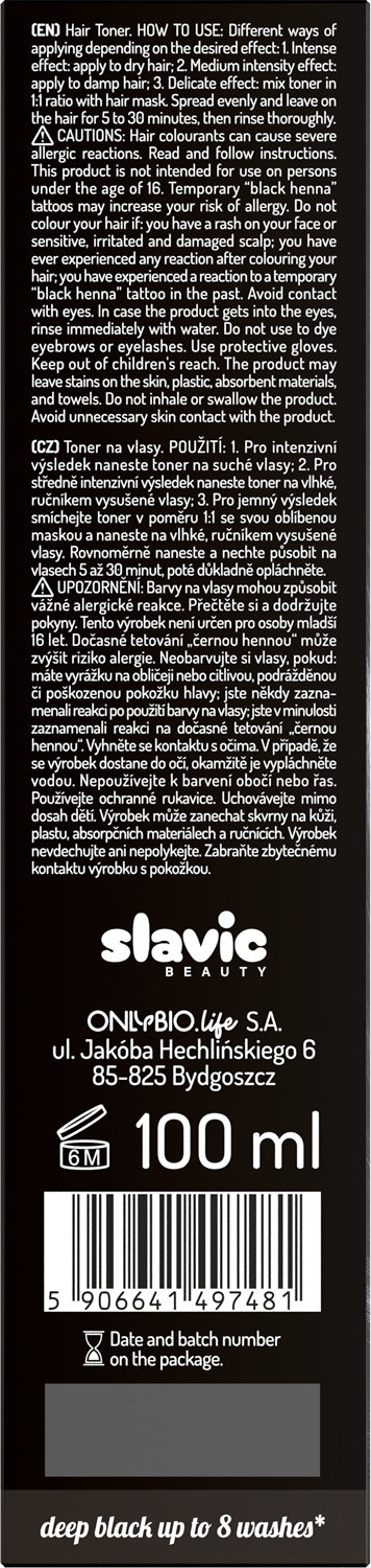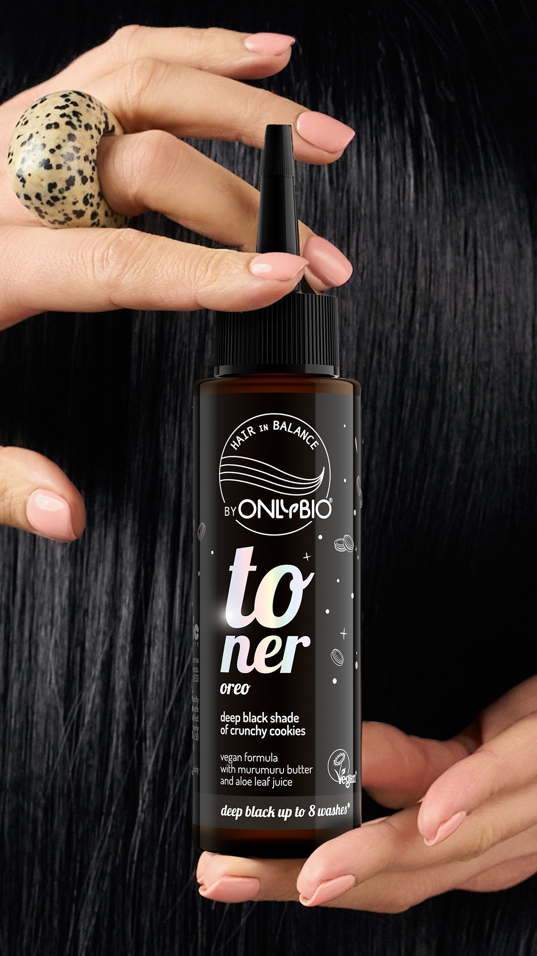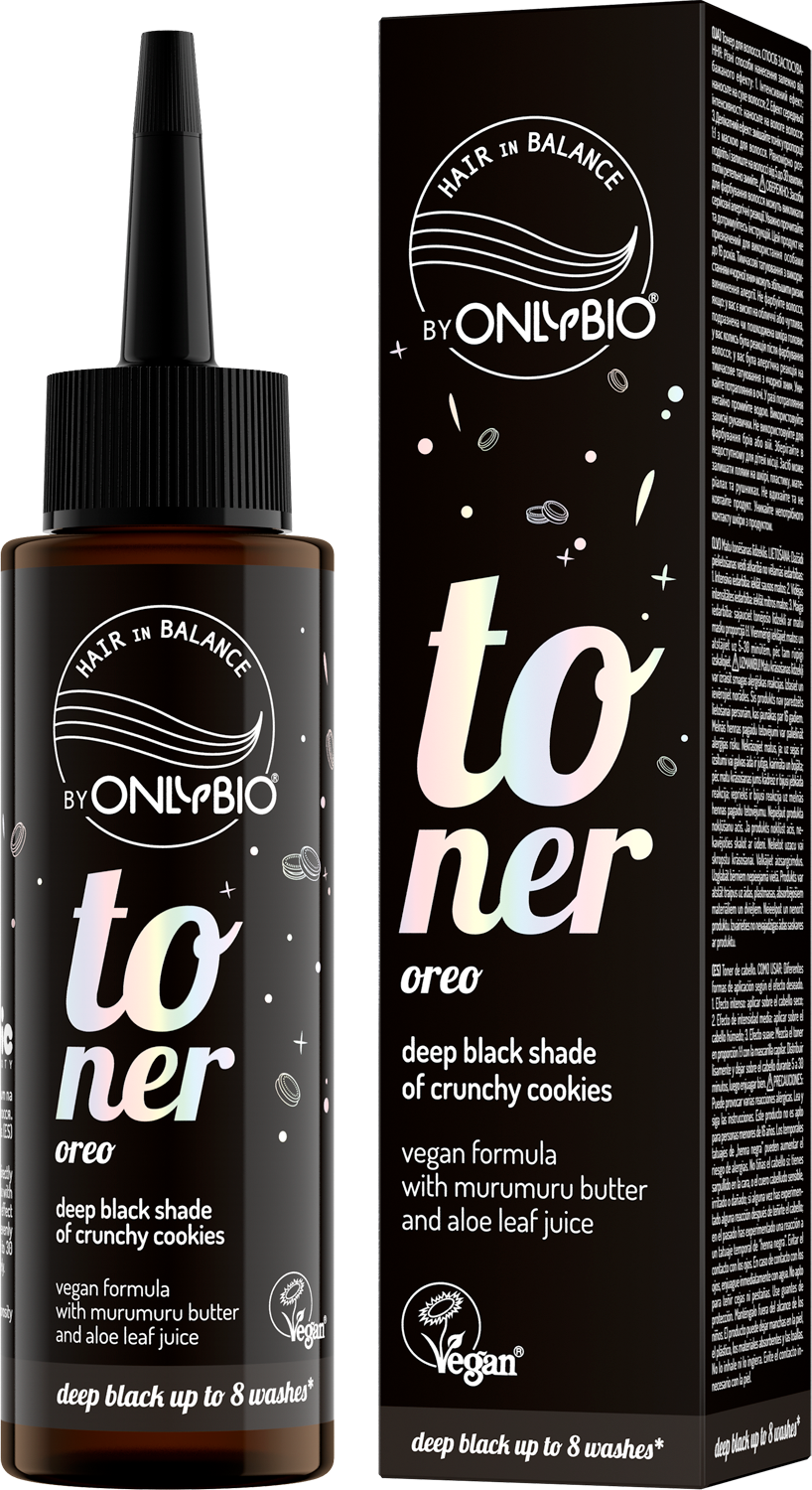 Toner na hnědé vlasy OnlyBio Hair in Balance, který osvěžuje barvu a dodává vlasům intenzivní, černý odstín křehkých sušenek. Unikátní složení tonera obsahuje máslo murumuru, které regeneruje a vyhlazuje vlasy, a šťávu z listů aloe vera, která je hydratuje a zvyšuje jejich pružnost.