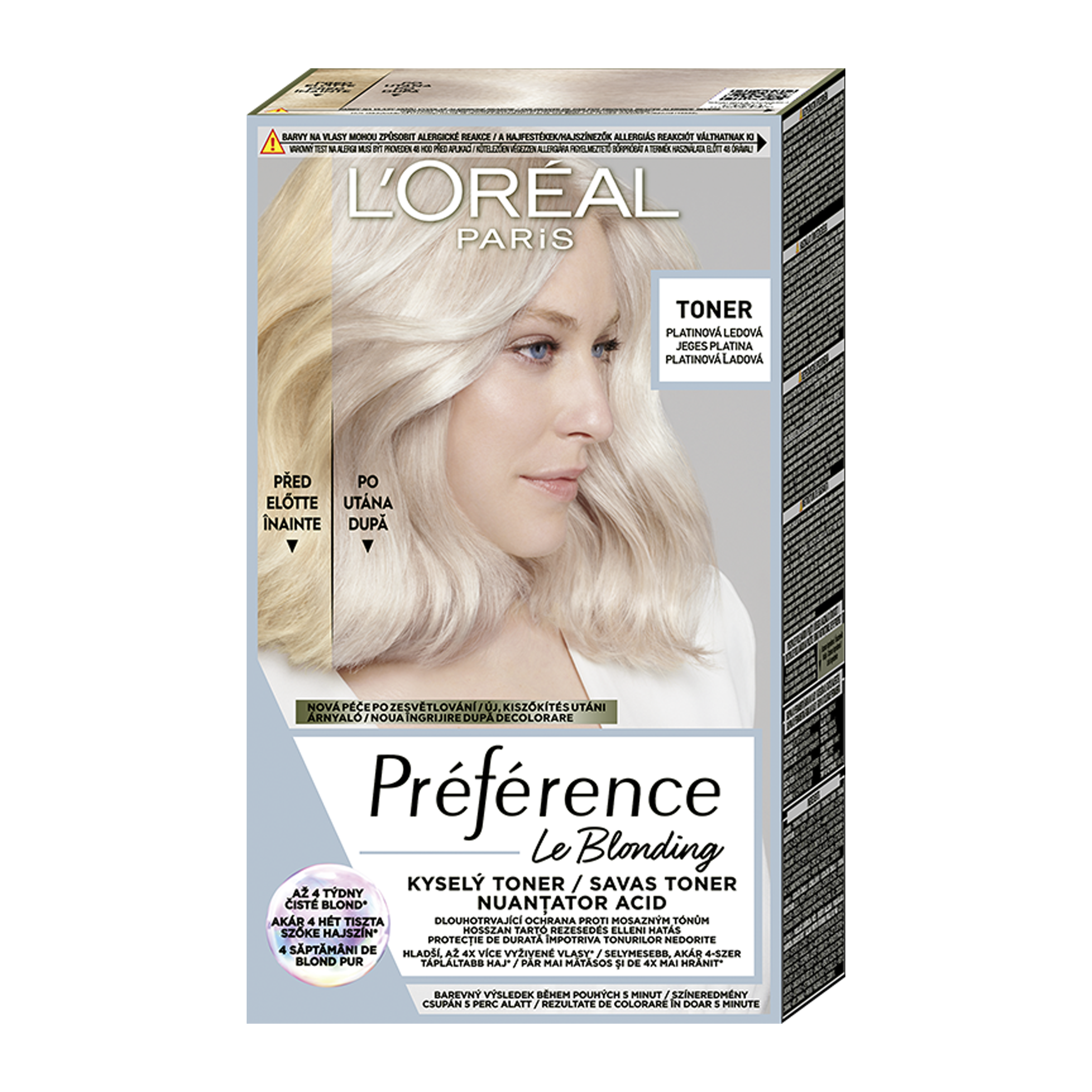 Dlouhotrvající ochrana proti mosazným tónům bez amoniaku. L'Oréal Paris Préférence přináší nově dlouhotrvající ochranu proti mosazným tónům, díky které jsou vlasy hladší a až 4x více vyživěné*. Jak Kyselý toner působí? Po absolvování odbarvení se pH vlasů stává zásaditým. To může vést k mdlým a porézním vlasům. Kyselý toner Préférence pomáhá obnovovat rovnováhu pH vlasů pro jeho přirozený rozsah a napomáhá tak zachovat vlasy kvalitní, vyživené a hebké. Efektivně neutralizuje nechtěné oranžové a žluté tóny pro ultra čistou blond barvu, která vydrží až 4 týdny*.