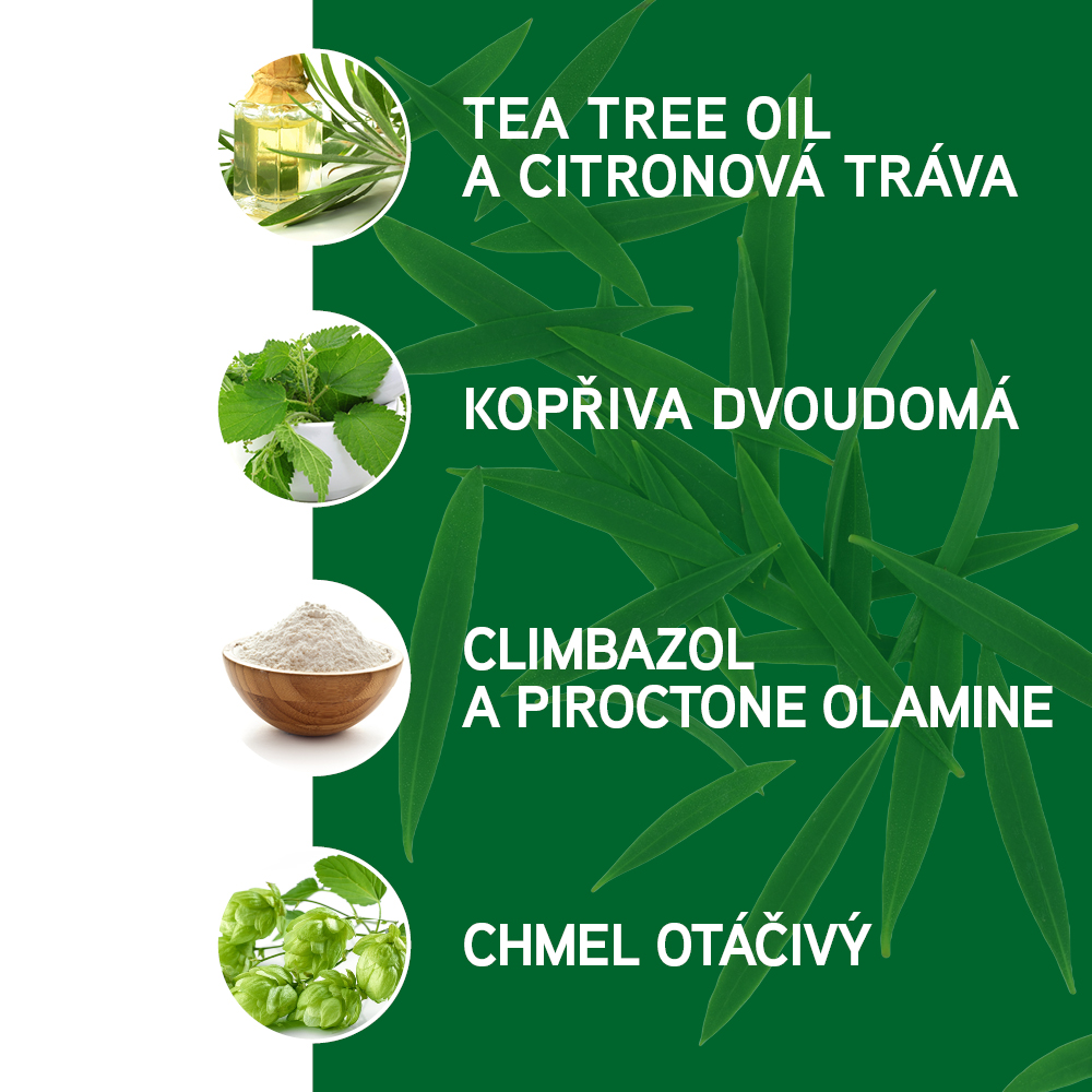 - Tea Tree Oil a citronová tráva poskytují silné antimykotické účinky, které efektivně redukují tvorbu lupů, zmírňují podráždění a svědění a důkladně čistí pokožku hlavy.