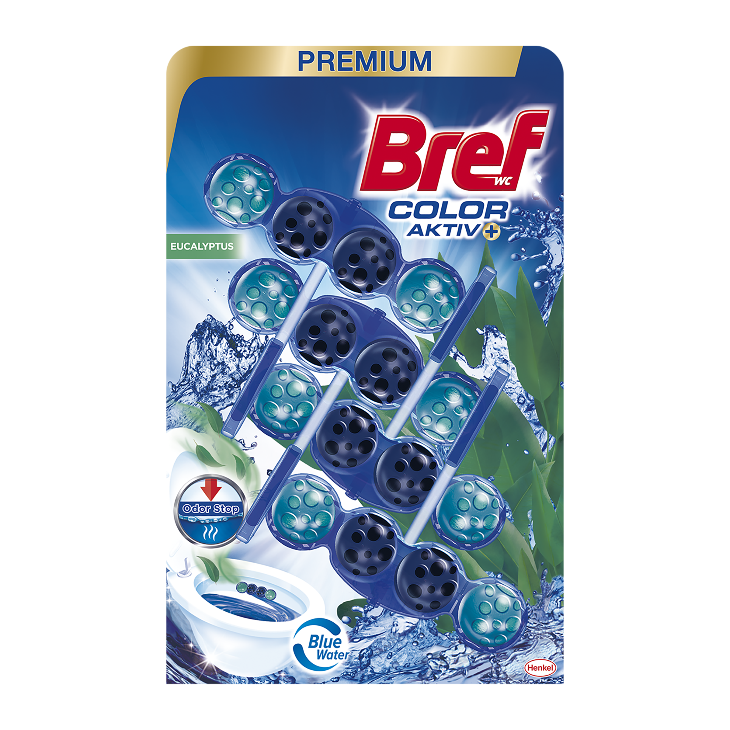 Bref Color Aktiv WC blok s vůní eukalyptu a technologií Odor Stop Bref Color Aktiv WC blok s technologií Odor Stop vytváří ochrannou bariéru proti nepříjemným zápachům a zároveň uvolňuje dlouhotrvající svěžest. Zažijte neutralizaci zápachu po každém spláchnutí s přidanou hodnotou vůně eukalyptu. Viditelné čištění je zajištěno vodou zabarvenou do modra a vaši toaletu provoní dlouhotrvající vůně eukalyptu. Bref Color Aktiv WC blok má složení se 4 funkcemi:
