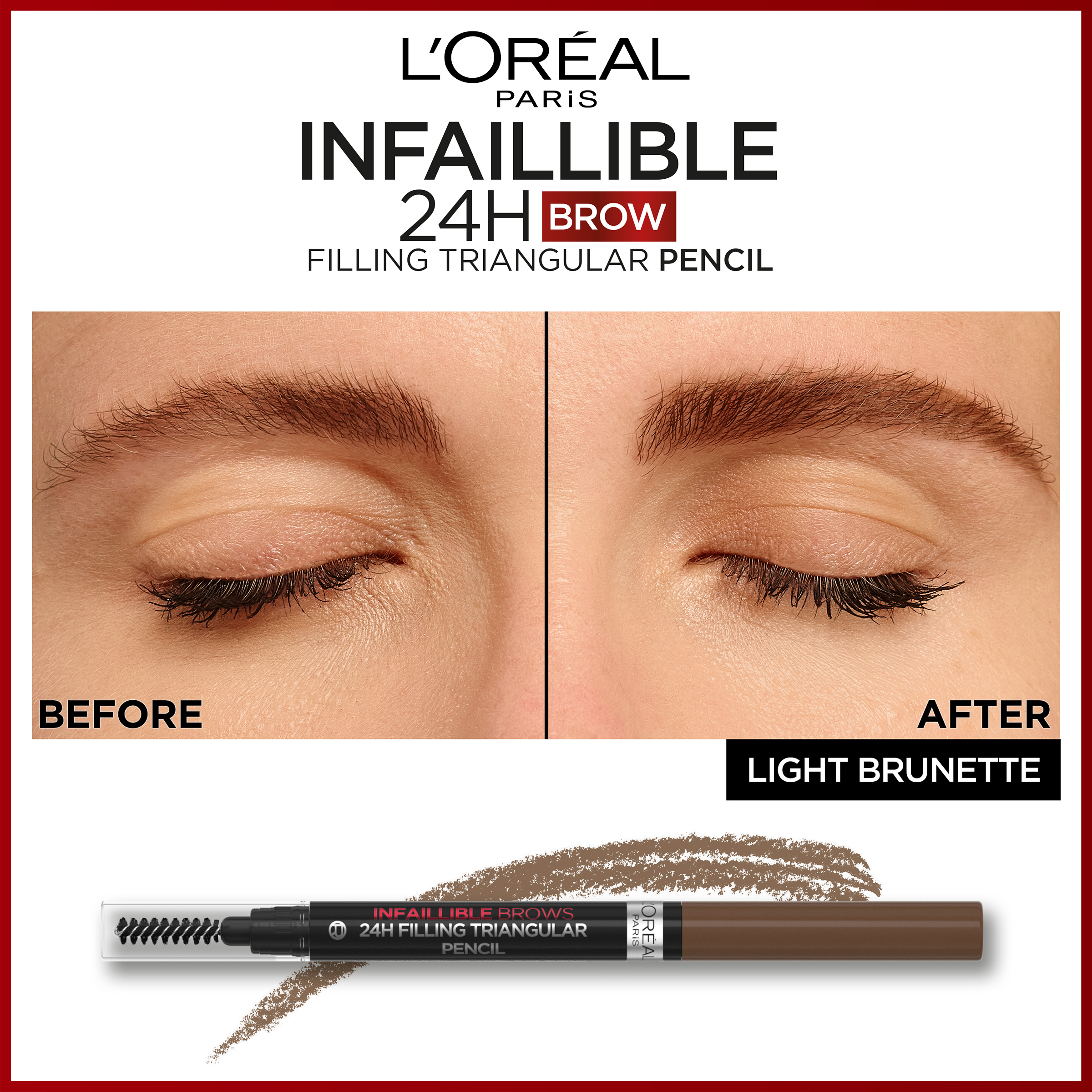 Objevte jedinečnou technologii v trojúhelníkové tužce na obočí Infaillible Brows 24H Filling Triangular Pencil od L´Oréal Paris pro bezchybný sjednocený tvar obočí bez vynechání. Pevná textura tužky na obočí se během aplikace přemění v tekutou pro maximálně snadné nanášení a přirozený efekt. Obsahuje vestavěný kartáček pro snadné pročesání a precizní tvarování obočí. Voděodolná tužka na obočí, která se nerozmazává a neláme.