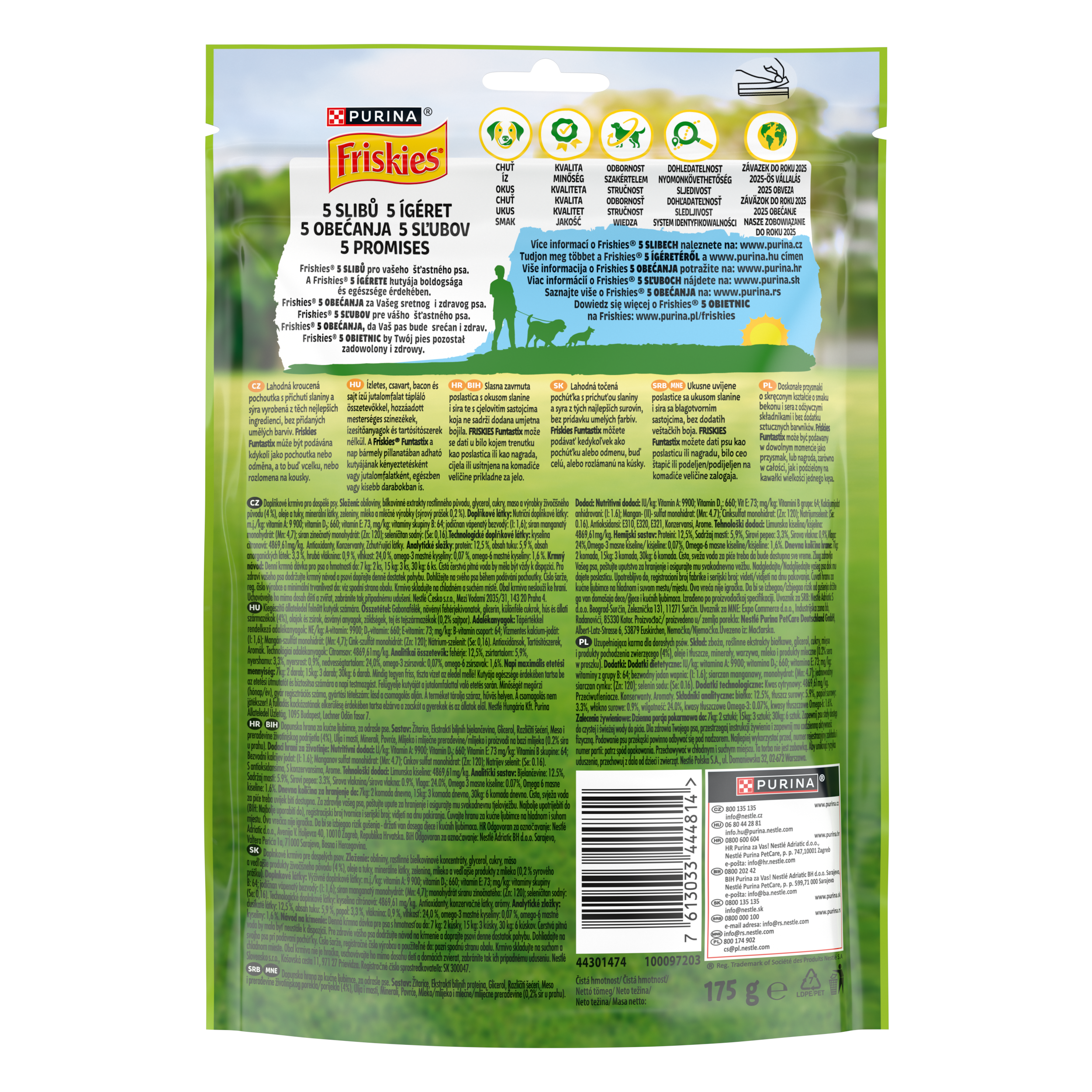 Lahodná kroucená pochoutka s příchutí slaniny a sýra vyrobená z těch nejlepších ingrediencí, bez přidaných umělých barviv. FRISKIES Funtastix může být podáváno kdykoli jako pochoutka nebo odměna, a to buď vcelku, nebo rozlomená na kousky. Friskies 5 slibů pro vašeho šťastného psa: - Chuť: lahodné receptury, které přinesou radost do vašeho domova - Kvalita: během našeho výrobního procesu provádíme stovky denních kontrol - Odbornost: vyvinuto Purina odborníky na výživu - Dohledatelnost: vyrobeno z vysoce kvalitních surovin, pečlivě vybraných od důvěryhodných dodavatelů - Závazek do roku 2025: zavazujeme se, že do roku 2025 budou naše obaly 100% recyklovatelné nebo znovupoužitelné