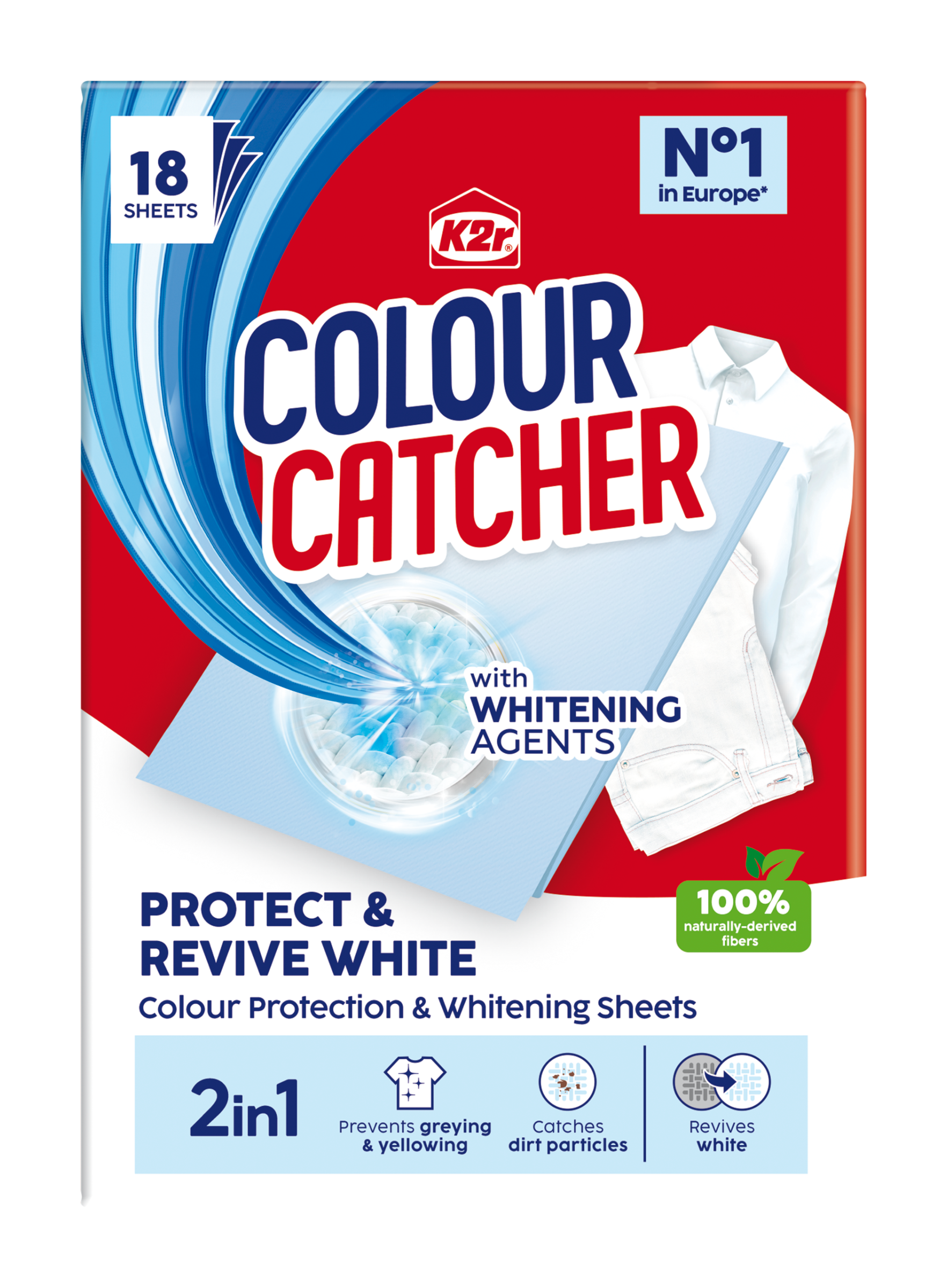 Colour Catcher 2in1 Revive White - Obnoví zašedlé a vybledlé bílé a zároveň chrání prádlo proti nechtěnému obarvení! Colour Catcher 2in1 Revive White kombinuje naše ubrousky proti přenosu barev a technologii, která pomáhá obnovit zašednutí a vyblednutí bílé - a to vše v ekologickém provedení. Inovativní ubrousek nejen zachycuje vypuštěné barvy a částice špíny, ale také využívá bělící činidlo a oživuje tak zářivost bílé - praní za praním. Ubrousky Colour Catcher umožňují praní smíšených barev, a vedou tak k méně třídění, pracím cyklům a šetří čas, vodu i energii. Ubrousky jsou vyrobeny ze 100% přírodních vláken*.