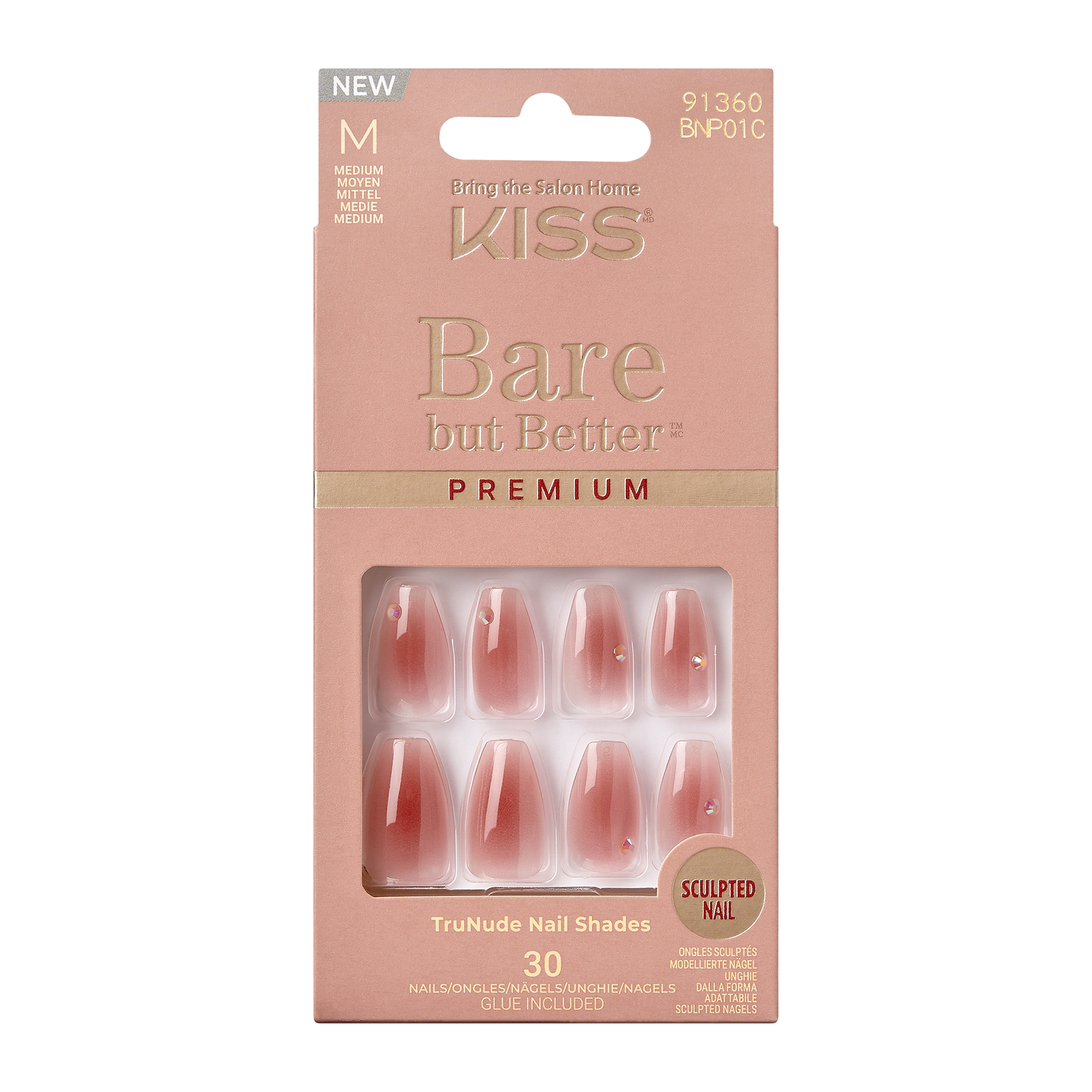 Tato čistě vypadající manikúra bez jakýchkoli nedokonalostí perfektně padne na vaše přirozené nehty. Nehty KISS Bare-but-better Nails si můžete sami aplikovat v domácím prostředí. Tyto nehty vypadají zcela přirozeně bez jakýchkoli šmouh, linií nebo nerovností. Díky snadné aplikaci lepidla je vše velmi jednoduché. K dispozici v krátkých i středních délkách.