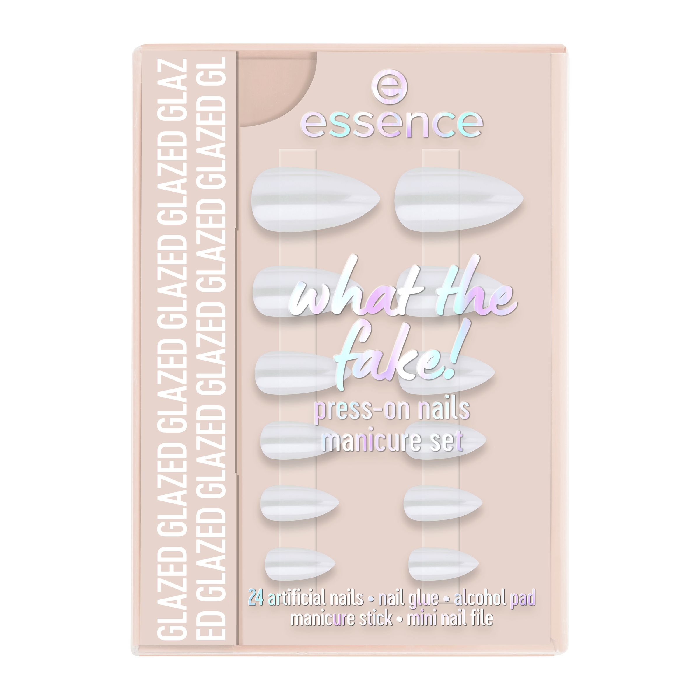 Hotové nehty během několika minut díky essence what the fake! sadě s umělými nehty PRESS-ON 01 GLAZED. Tato sada obsahuje 24 vysoce kvalitních umělých nehtů ve 12 různých velikostech v mandlovém tvaru s jemným bílým glazovaným efektem. Díky svému preciznímu tvaru a kvalitě se nehty dokonale přizpůsobí vašim přirozeným nehtům – pro vzhled jako ze salonu u vás doma. Sada obsahuje také lepidlo na nehty, tyčinku na manikúru, mini pilník na nehty a čisticí ubrousek na nehty – vše, co potřebujete pro snadnou aplikaci dlouhotrvající manikúry. Snadná aplikace a výsledek, který si zamilujete!