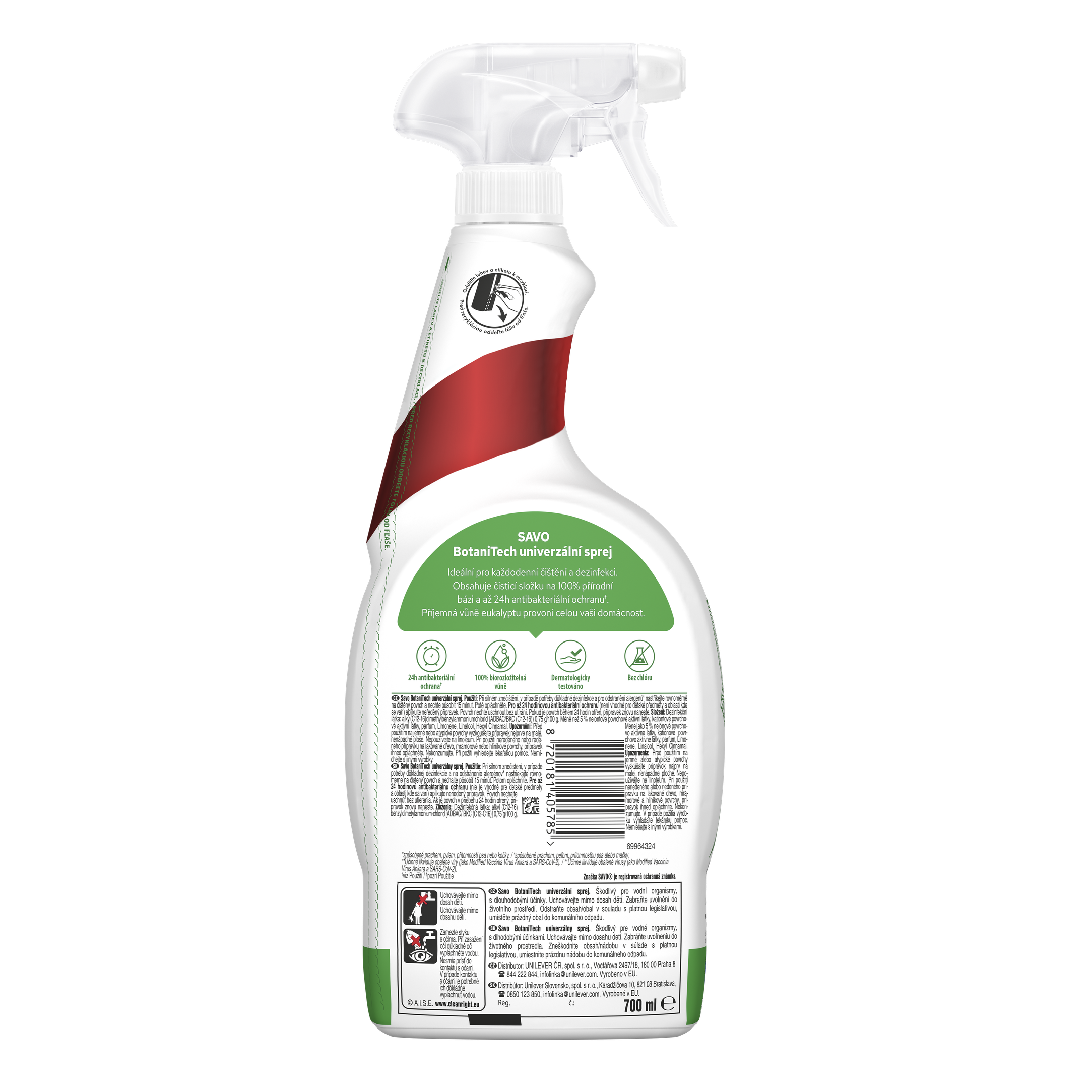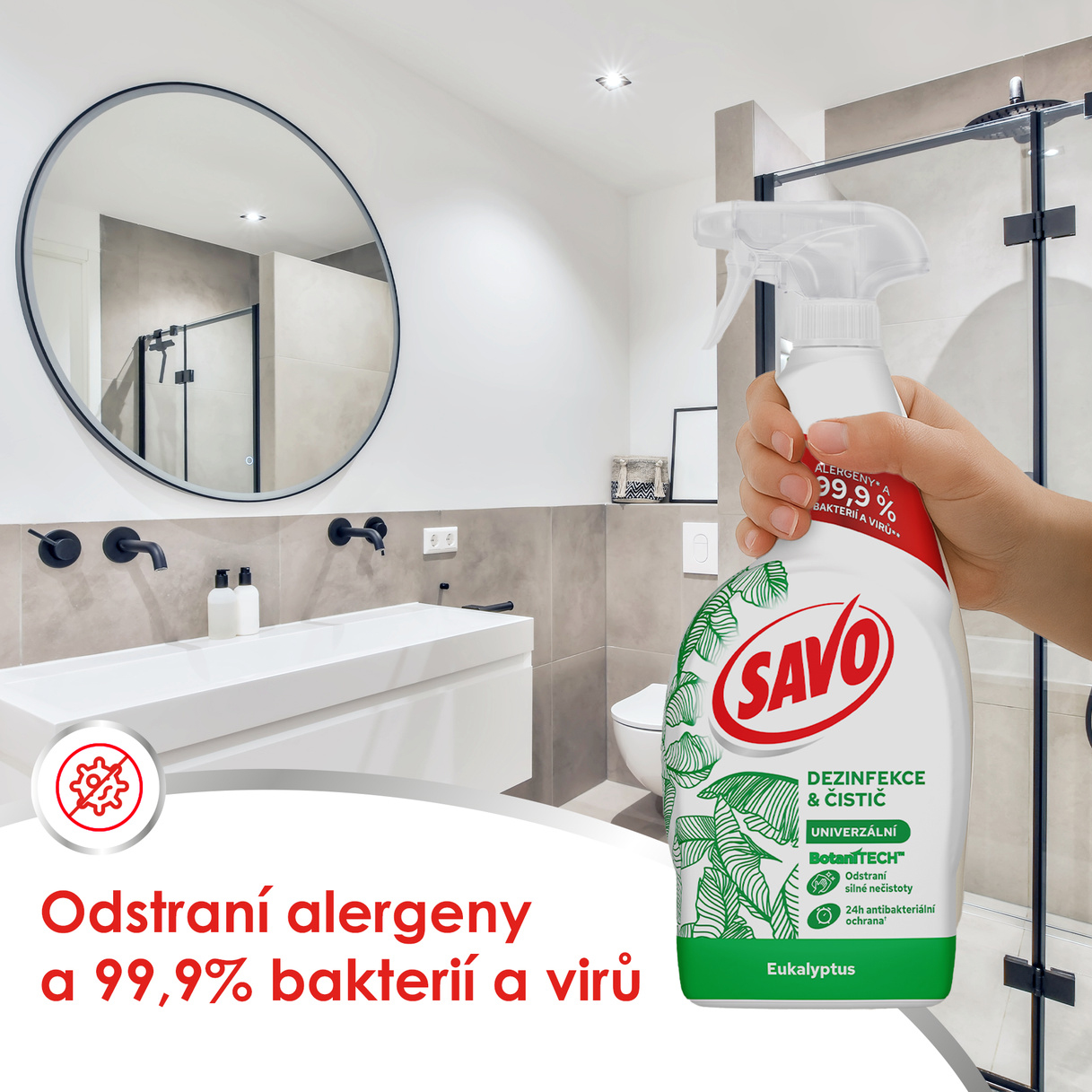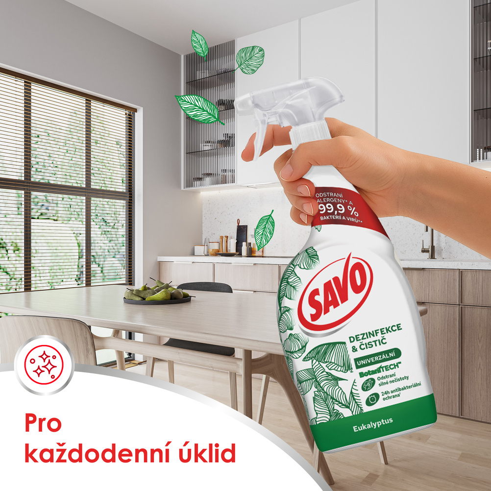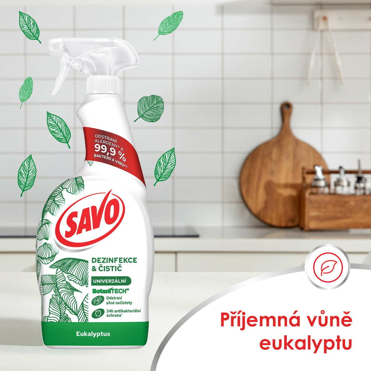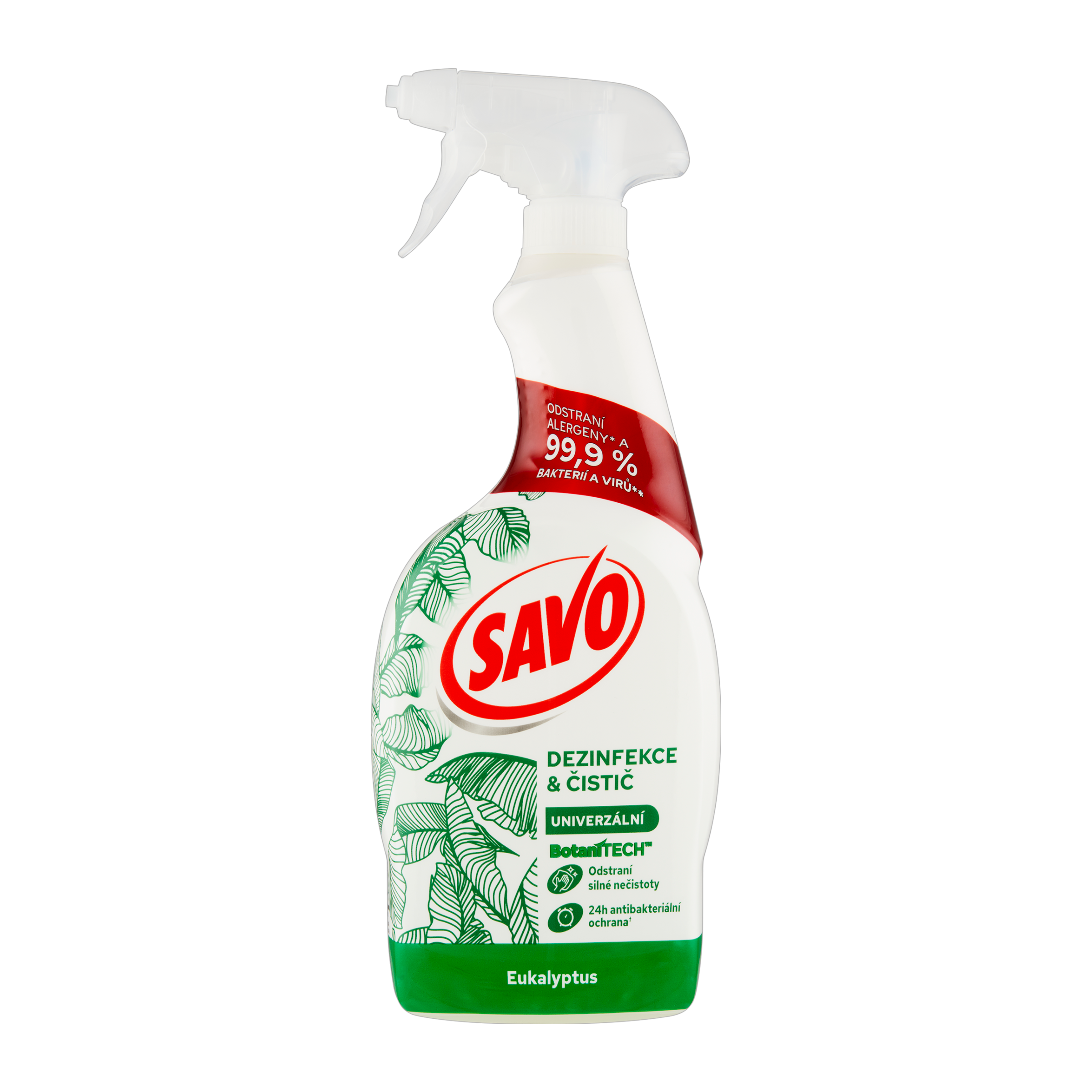 Savo BotaniTech univerzální sprej je ideální pro každodenní dezinfekci a čištění všech omyvatelných povrchů v domácnosti. Odstraní alergeny* a 99,9 % bakterií a virů**. Odstraní silné nečistoty a poskytuje 24h antibakteriální ochranu. Sprej neobsahuje chlór, takže je bez zápachu. Svěží vůně eukalyptu provoní celou vaši domácnost. Vyzkoušejte Savo BotaniTech univerzální sprej s vůní eukalyptu, který účinně čistí i dezinfikuje. Zbavte svůj domov nečistot a zároveň bakterií a virů!