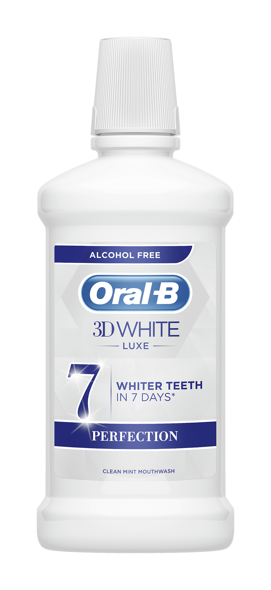 Pokud se ústní voda Oral-B 3DWhite Luxe Perfection používá po čištění zubů, budou zuby bělejší už za 7 dní. Pomáhá odstraňovat ze zubů povrchové skvrny a zanechává ústní dutinu svěží bez nepříjemného štípání alkoholu.