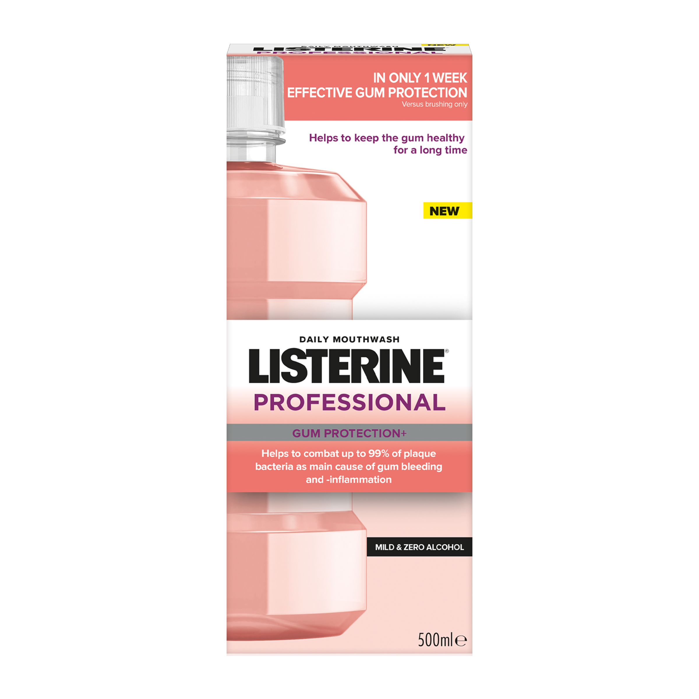 Ústní voda LISTERINE® PROFESSIONAL GUM PROTECTION+ s esenciálními oleji, fluoridem a nejvyšším obsahem zinku v rámci ústních vod LISTERINE® pomáhá bojovat proti zubnímu plaku, hlavní příčině krvácení a zánětu dásní, při používání 2x denně. Poskytuje účinnou ochranu dásní už za 1 týden*. Pomáhá chránit před opakujícími se problémy s dásněmi. Při nepřežitém používání pomáhá udržovat dásně zdravé. Jemné složení, bez alkoholu. Nevysušuje ústa.