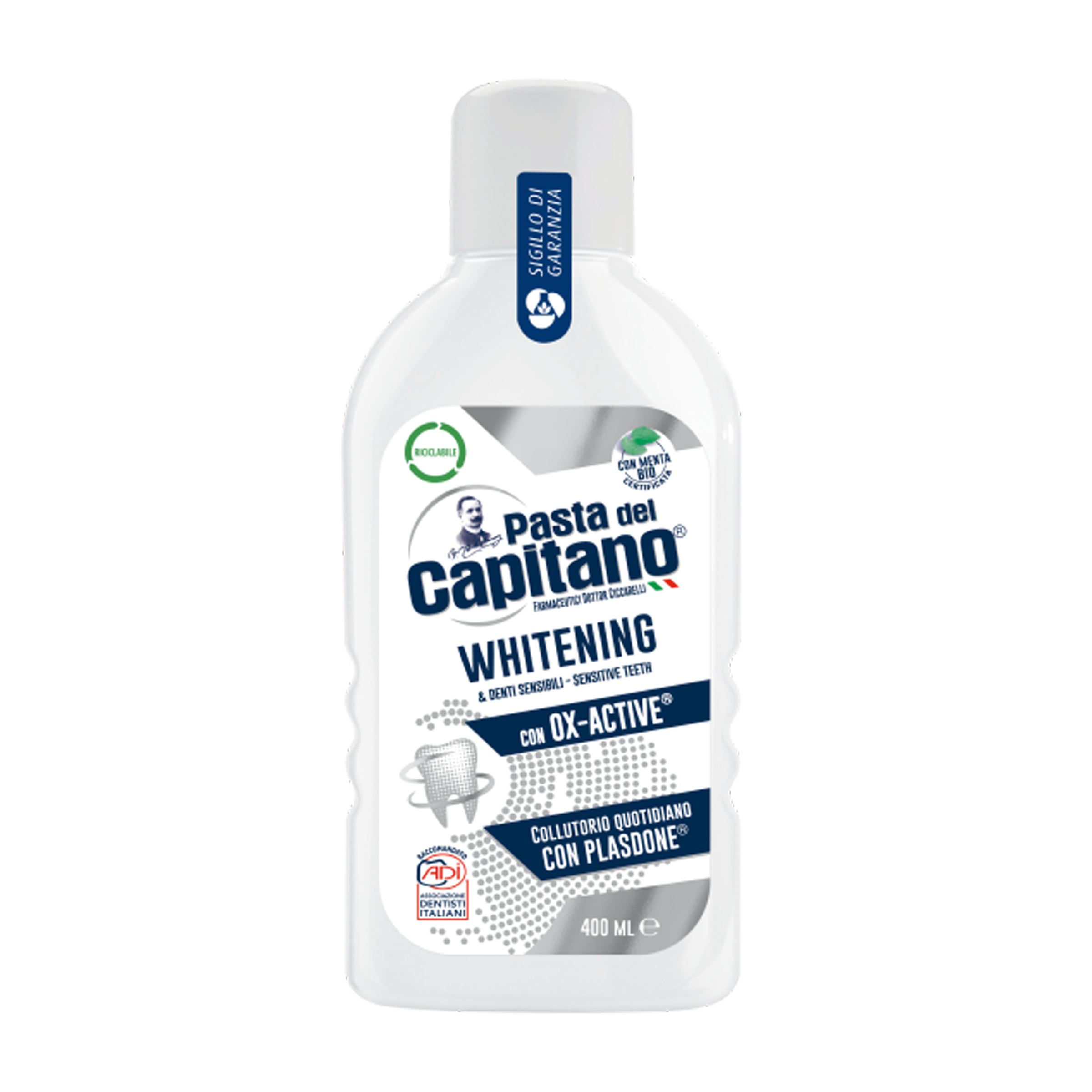 Bělící ústní voda, která vytvoří tvorbu skvrn na zubech. Jeho inovativní složení s Plasdone® pomáhá obnovit a udržovat přirozenou bělost zubů bez poškození skloviny. Ideální také pro citlivé zuby díky citrátu draselnému, který snižuje citlivost zubů, zatímco Betain zklidňuje a pomáhá předcházet podráždění dásní. Přípravek se nesmí ředit.