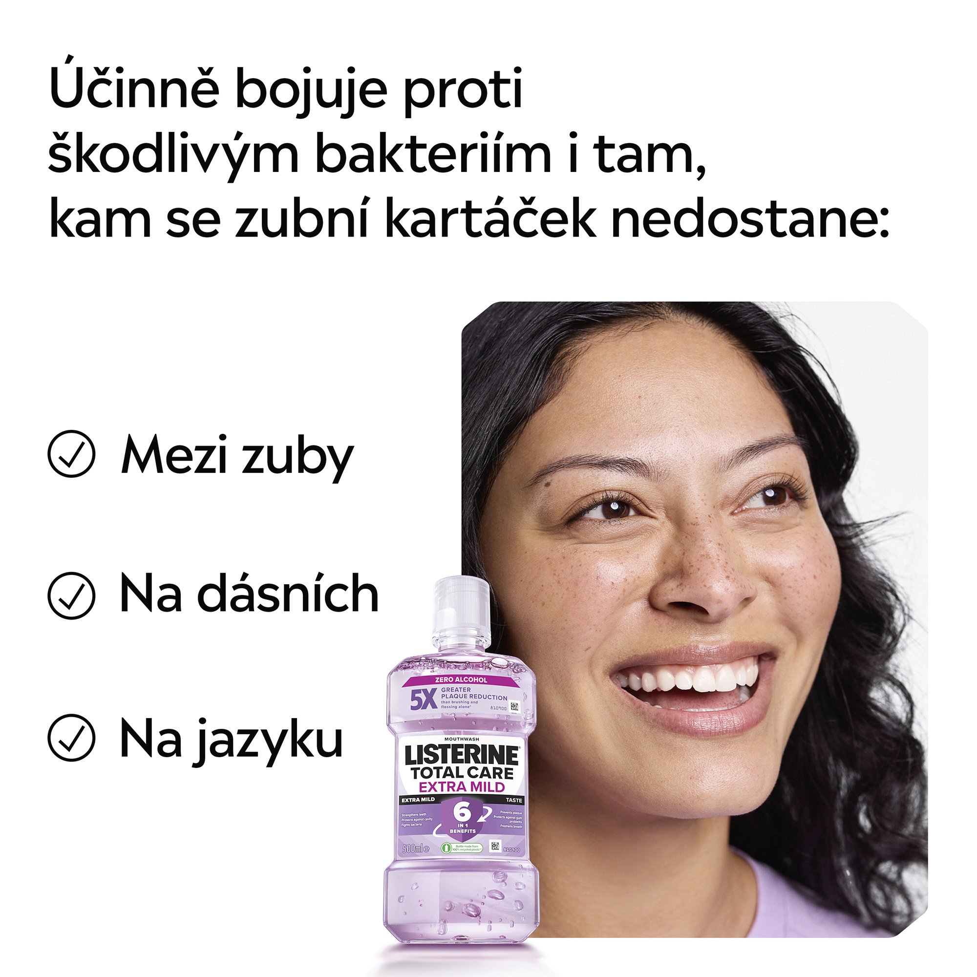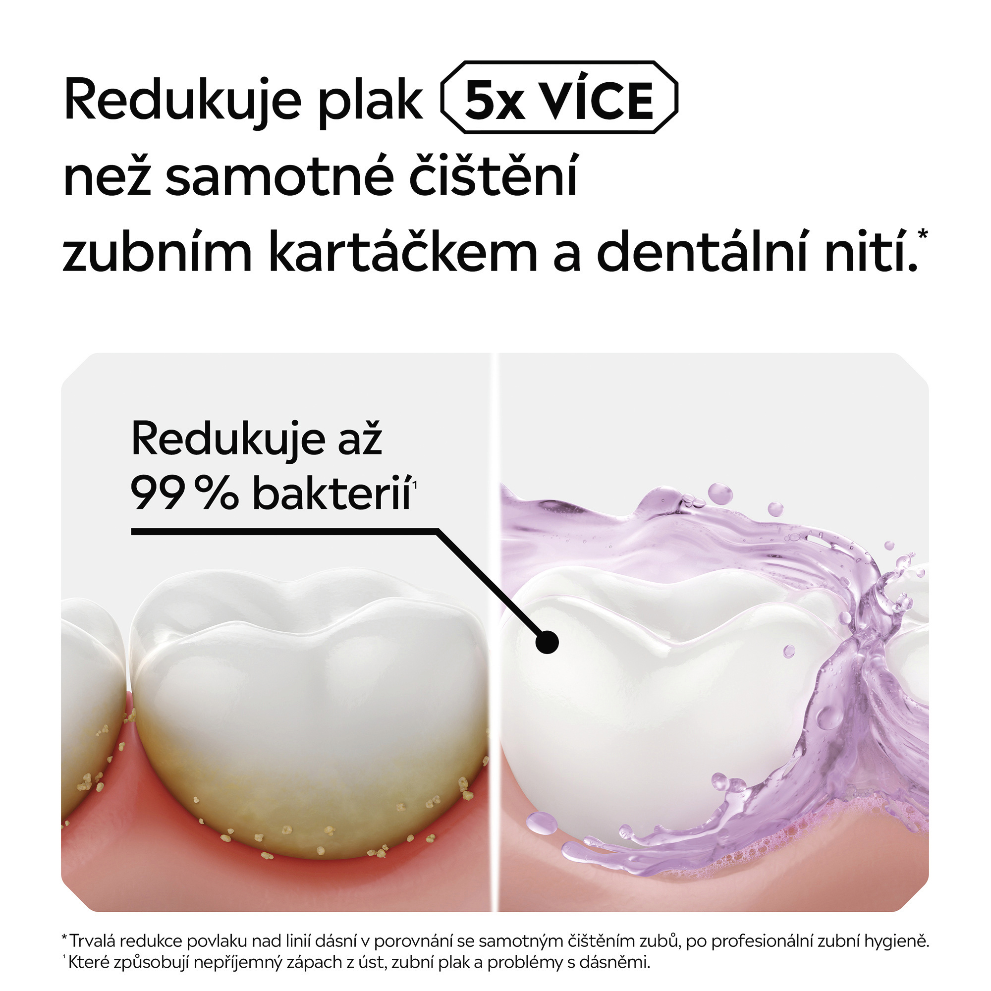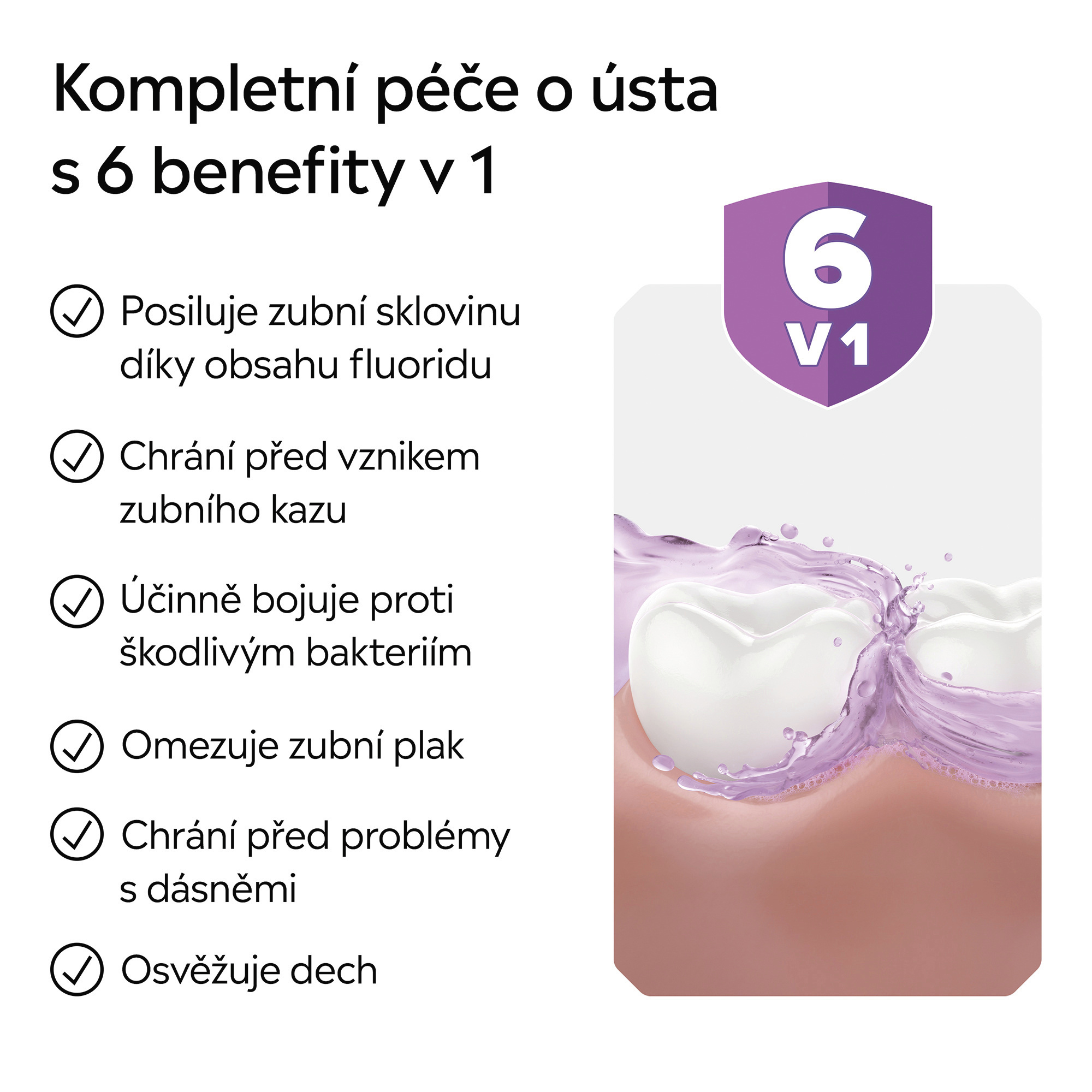 - Účinně bojuje proti bakteriím i tam, kam se zubní kartáček nedostane: mezi zuby, na dásních a na jazyku