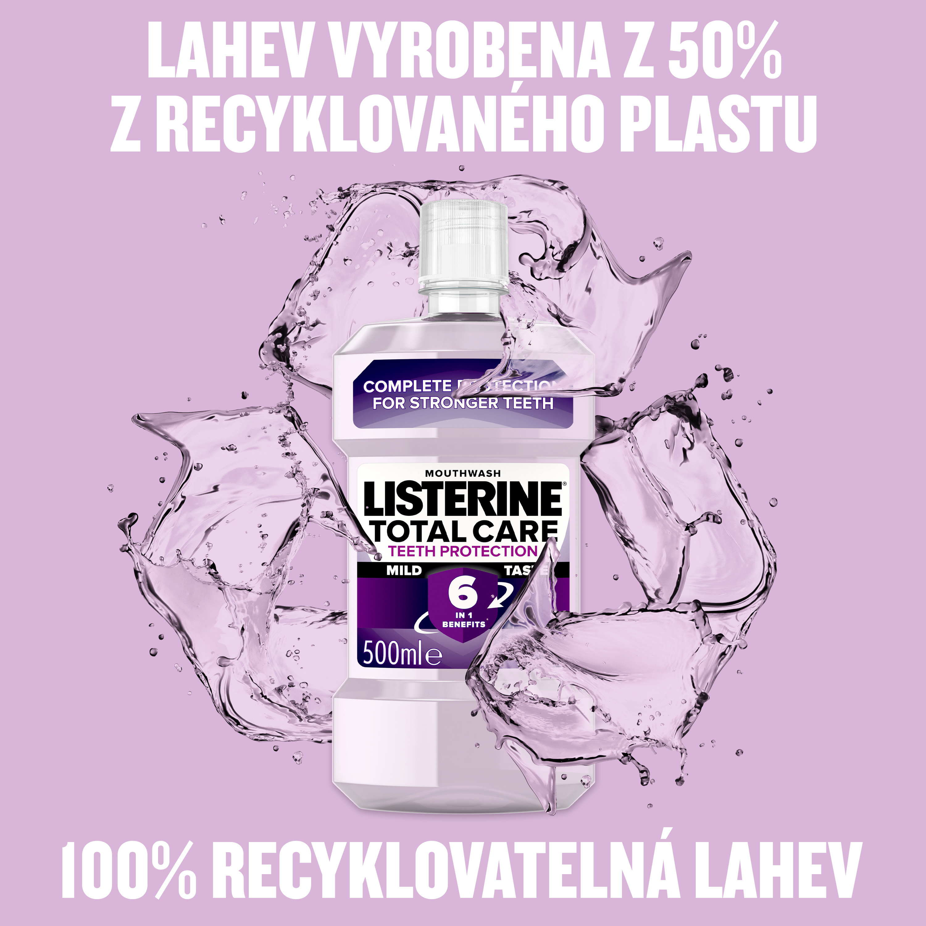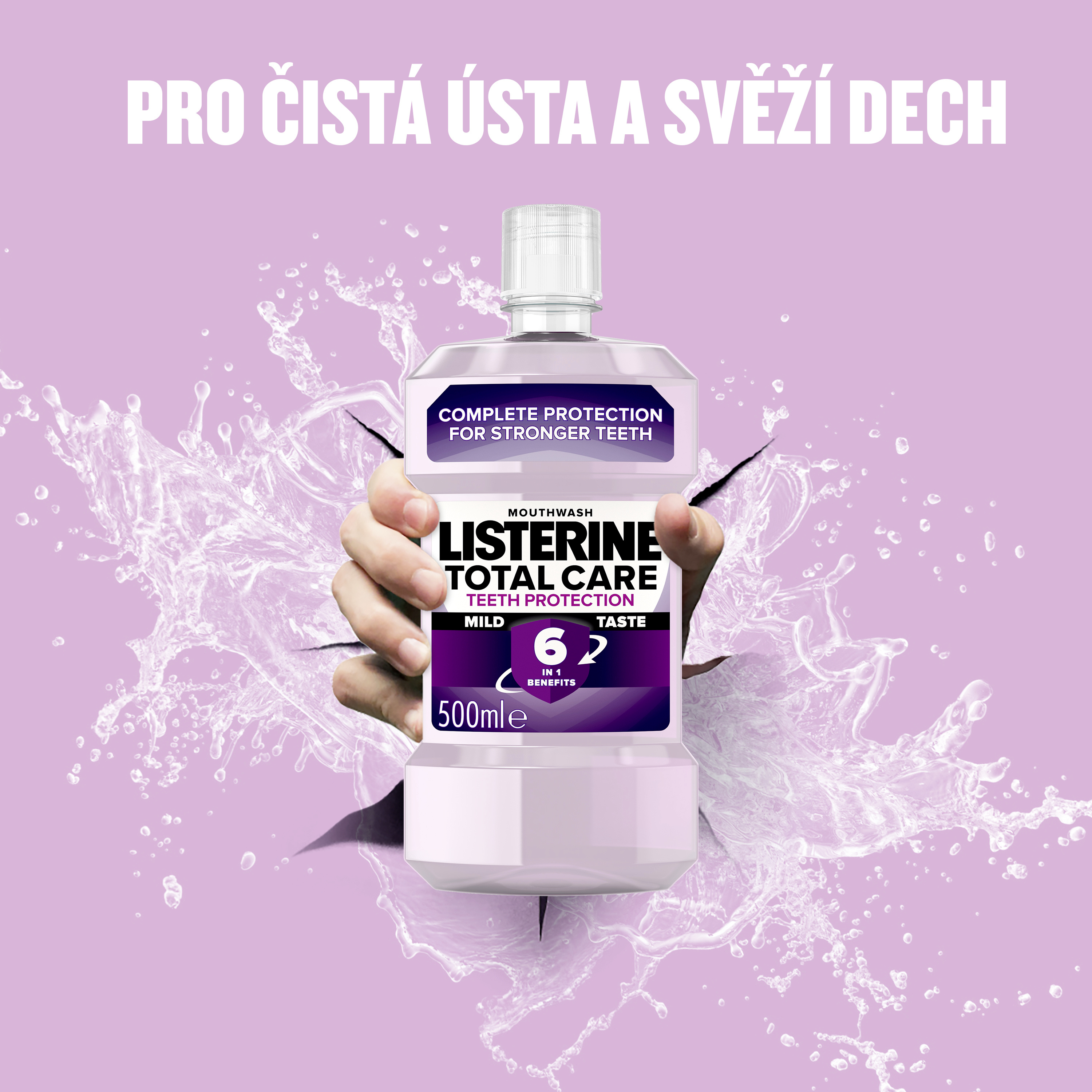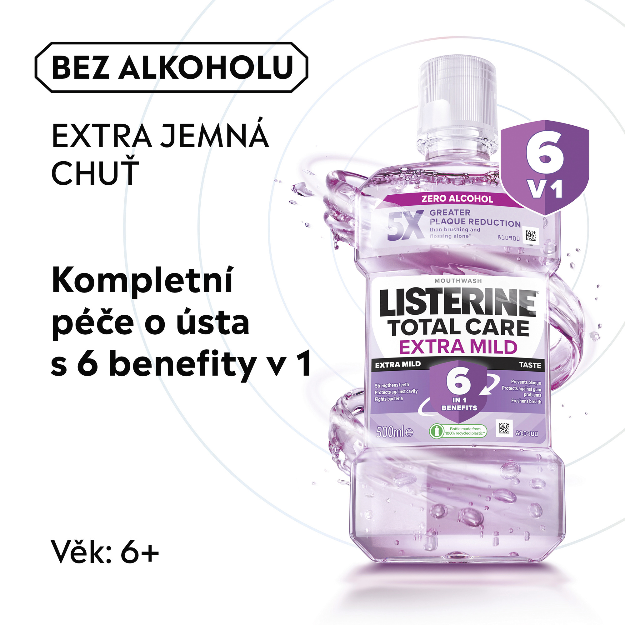 Ústní voda Listerine® Total Care Extra Mild při používání dvakrát denně zlepšuje ústní hygienu - s esenciálními oleji, fluoridem a chloridem zinečnatým. Poskytuje celkovou ochranu pro silné zuby s 6 výhodami v 1: