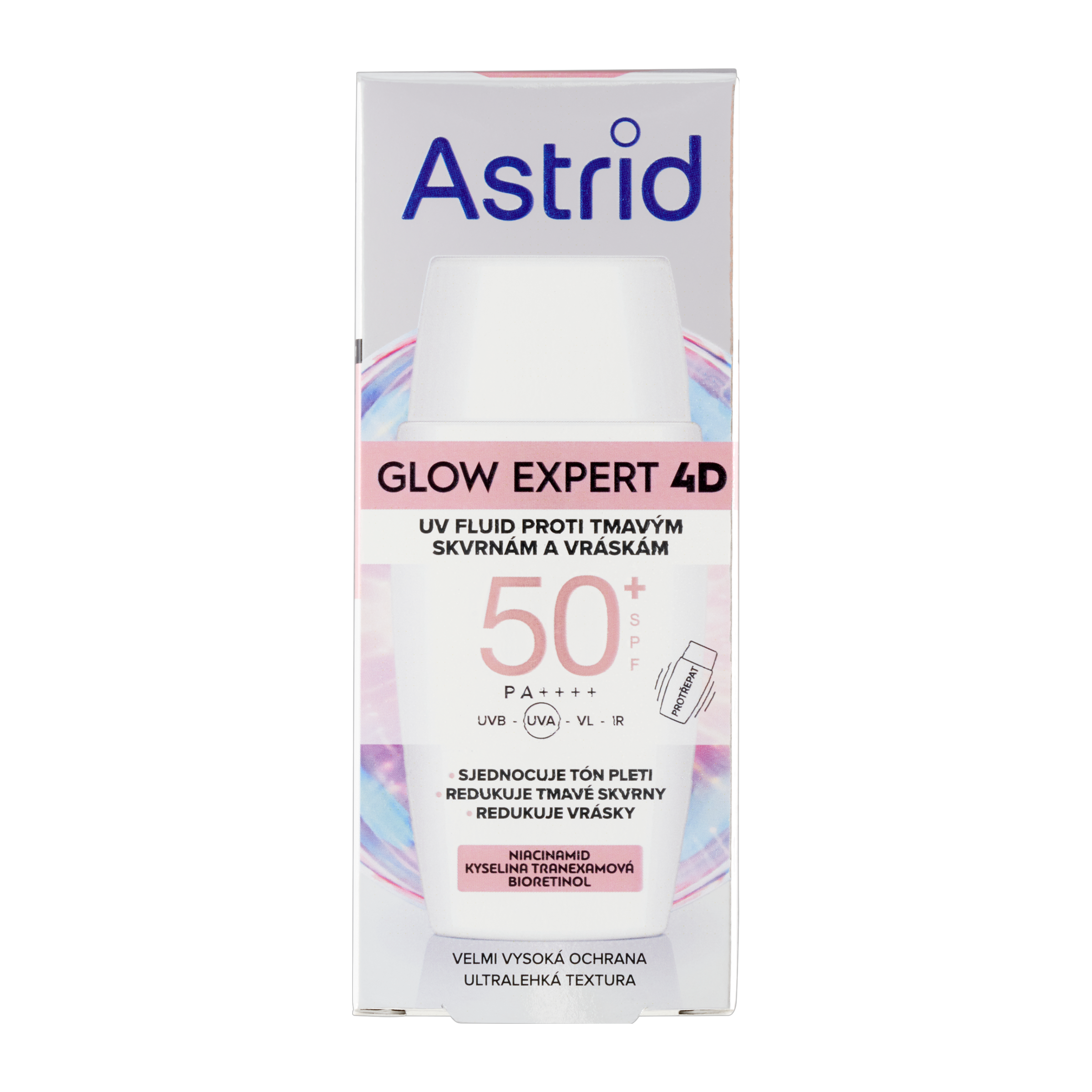 Astrid Glow Expert 4D Ultralehký denní UV fluid proti tmavým skvrnám a vráskám SPF 50+ chrání vaši pleť tím, že pomáhá předcházet jejímu fotostárnutí způsobenému škodlivým UVA, UVB, VL¹ a IR¹ zářením.