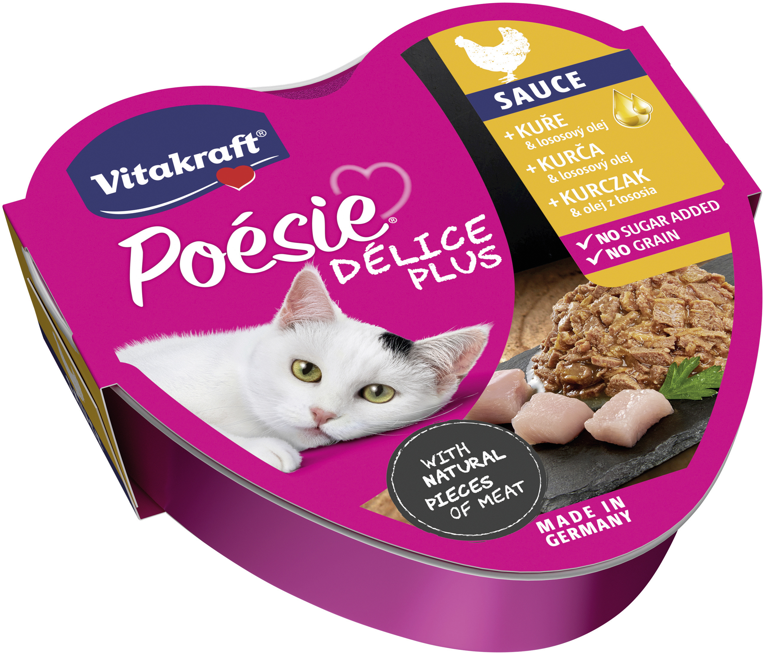 Kompletní krmivo uzpůsobeno denním nutričním požadavkům dospělých koček. Obsahuje navíc lososový olej pro podporu zdravé kůže a srsti. Viditelné rozpoznatelné kousky v lahodné porci omáčky. Receptura bez cukru, obilovin, umělých barviv a konzervantů.