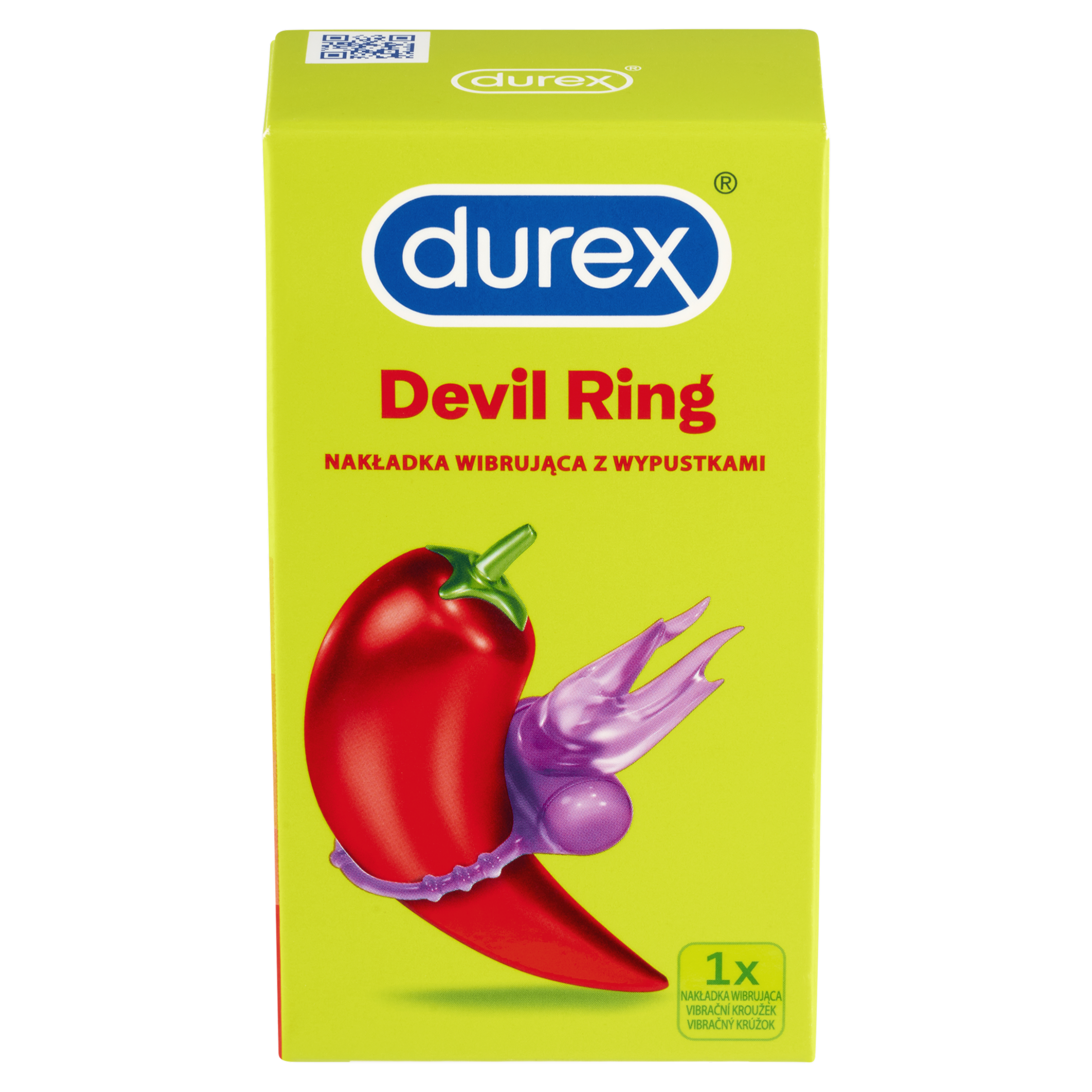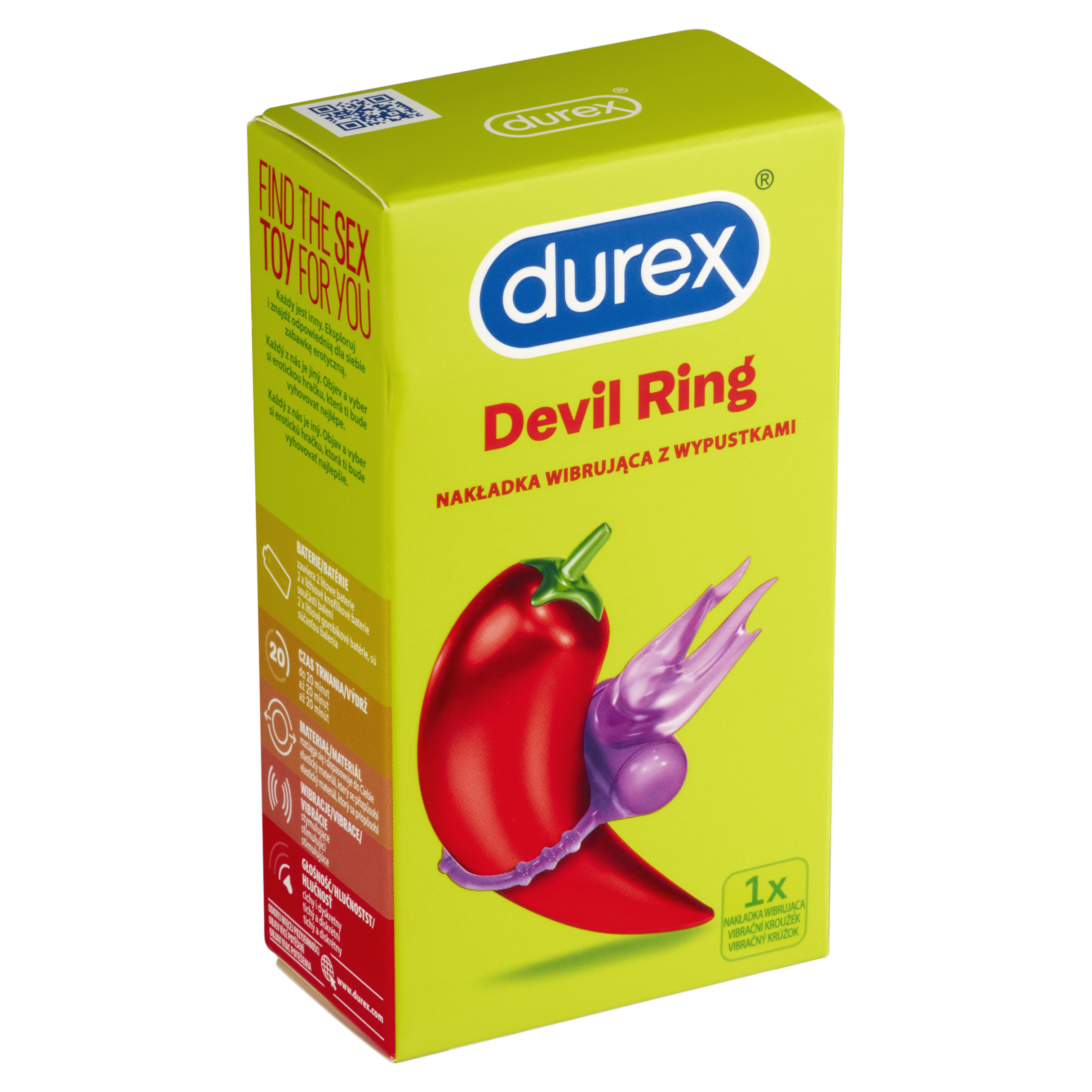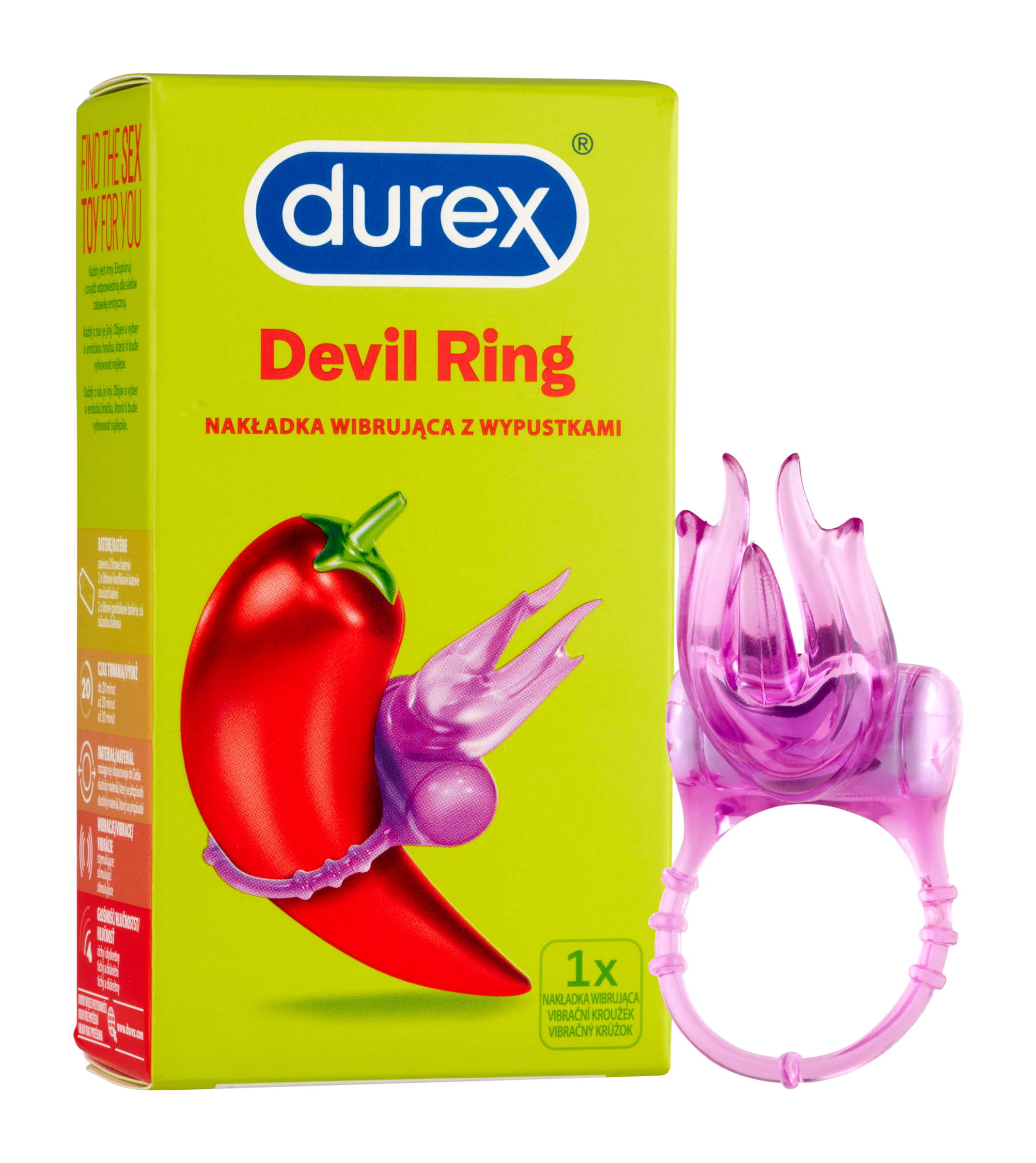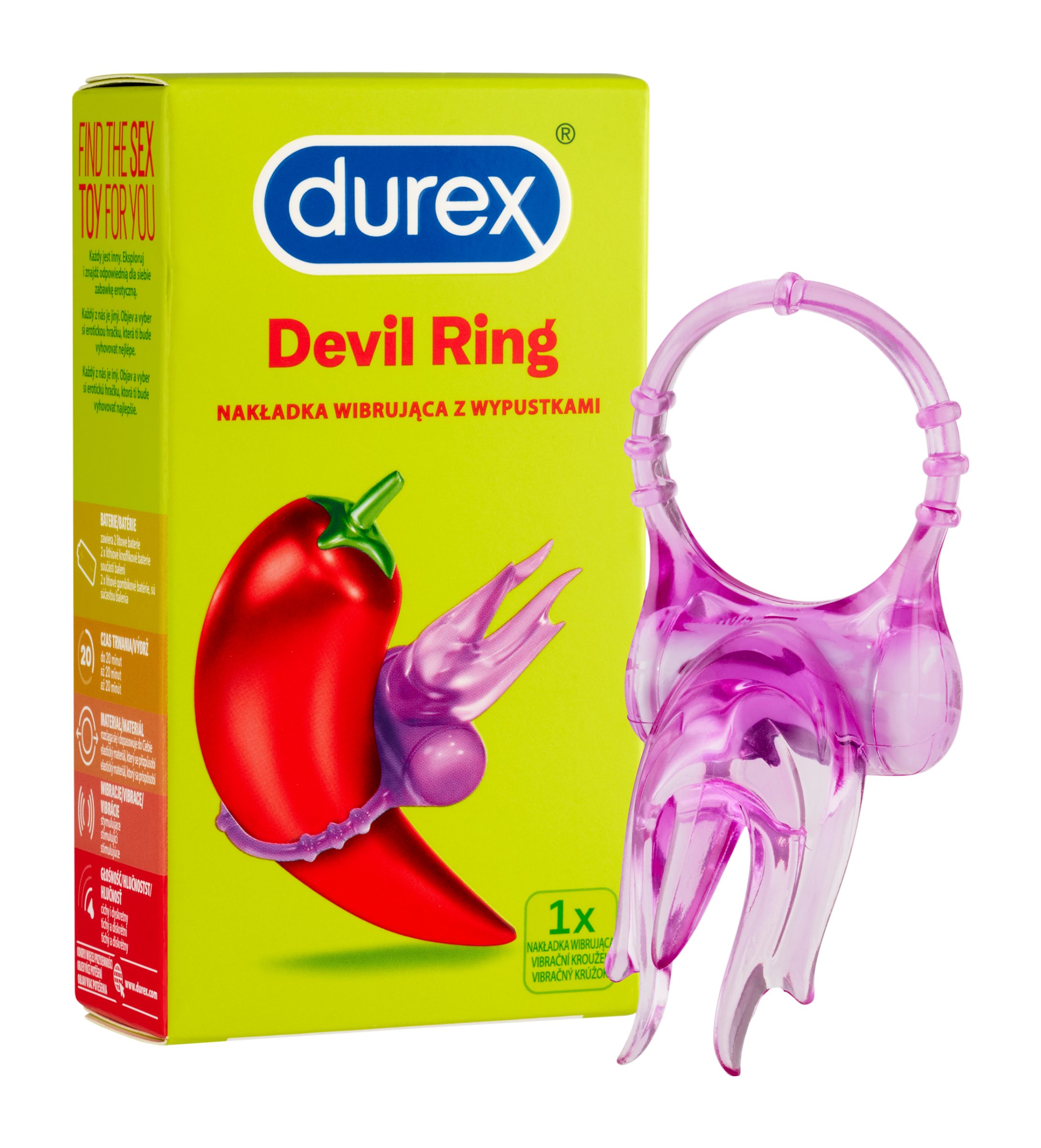 Objevuj potěšení. Durex Devil Ring je vibrační kroužek určený na penis s vibrační hlavicí pro stimulaci klitorisu, která je navržena tak, aby ženám poskytla více potěšení během sexu. Vibrační hlavice je sestrojena tak, aby poskytla až 20 minut intenzivních vibrací.