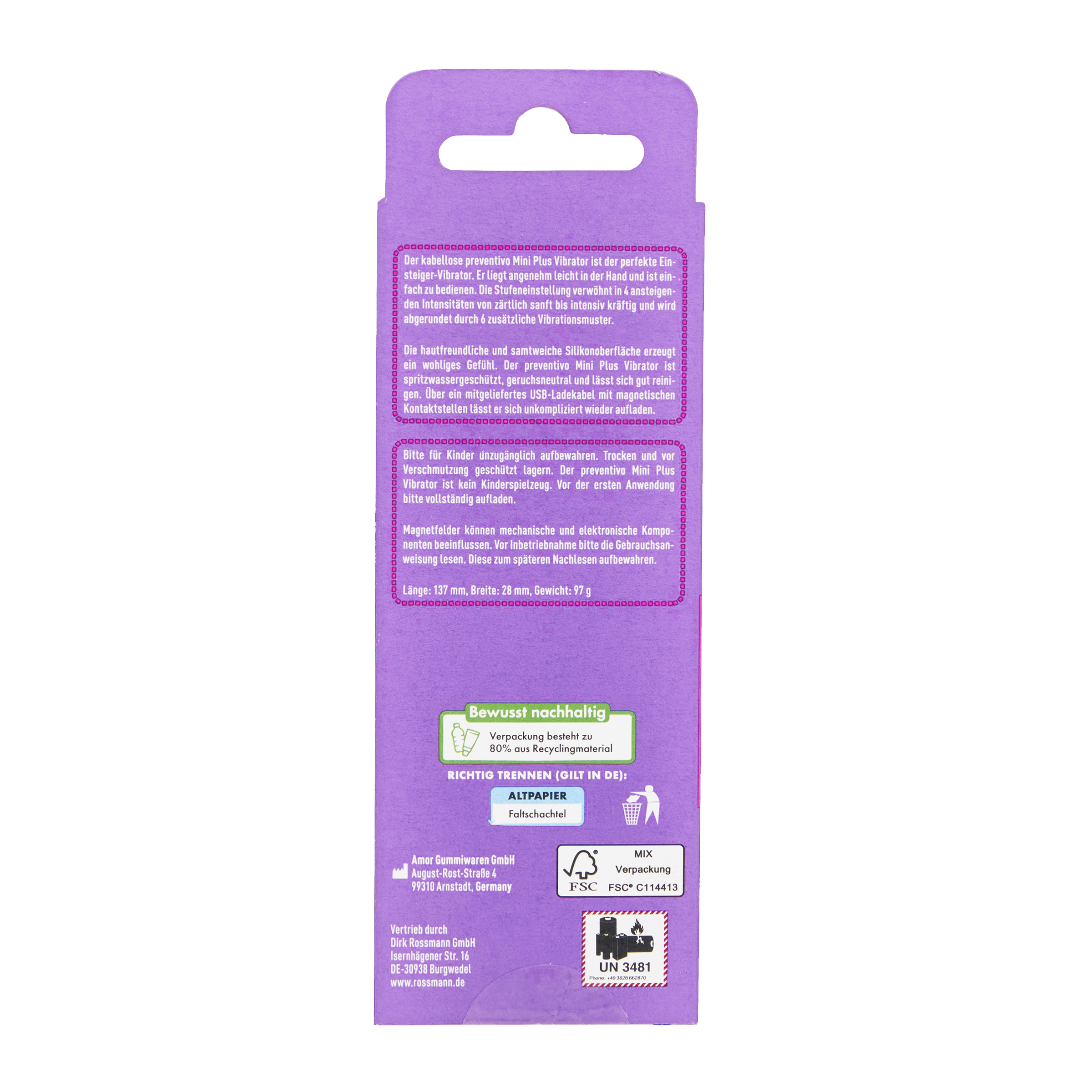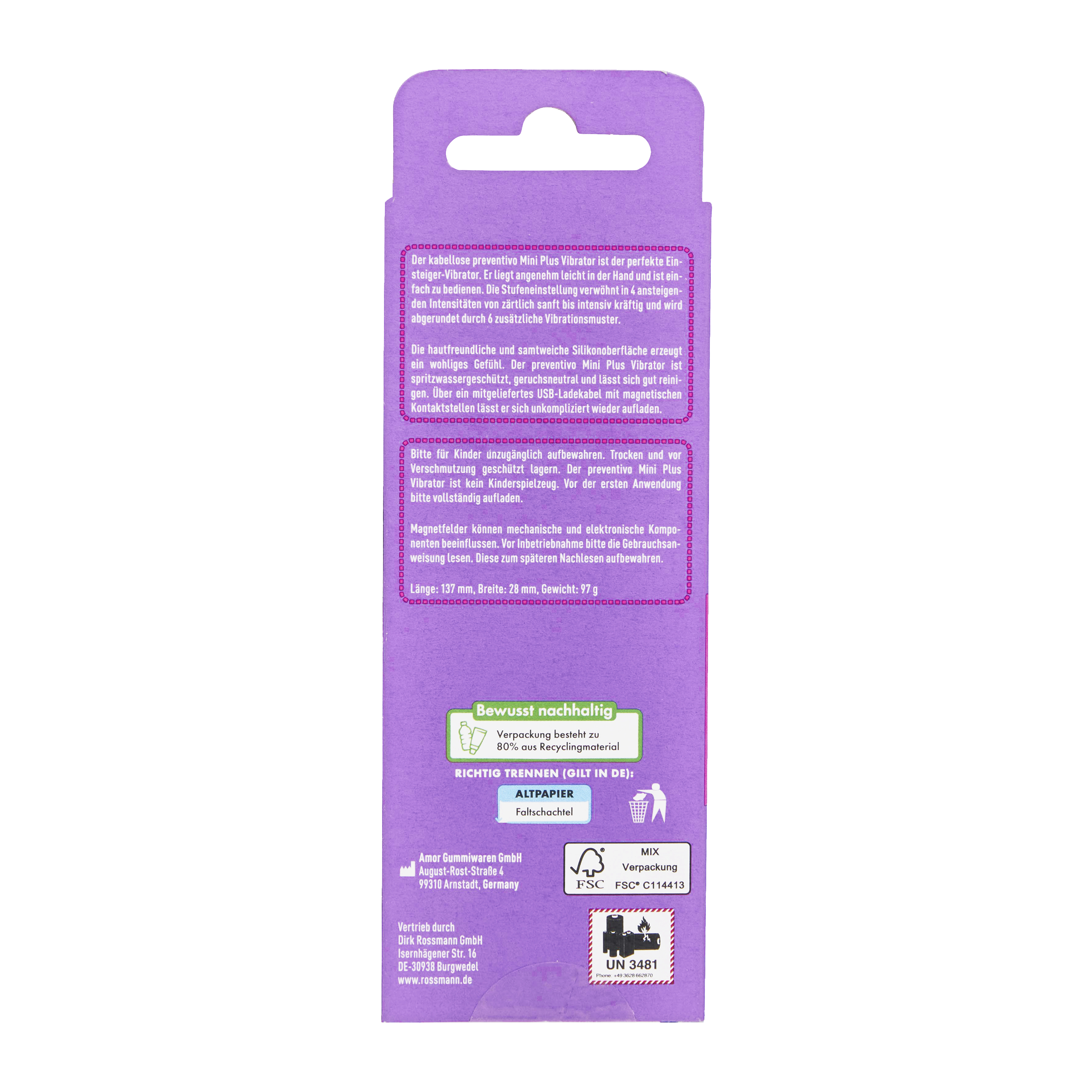 Vibrátor Preventivo Mini Plus je vyrobený ze šetrného silikonu, který nabízí maximální komfort při používání. Vibrátor Preventivo disponuje 4 úrovněmi intenzity a 6 různými vibračními vzory, díky nimž si snadno přizpůsobíte stimulaci podle vlastních potřeb. Pomůcka je odolná vůči vodě, což umožňuje její použití i v prostředí se zvýšenou vlhkostí, například v koupelně. Materiál bez obsahu ftalátů zaručuje bezpečné a šetrné používání.