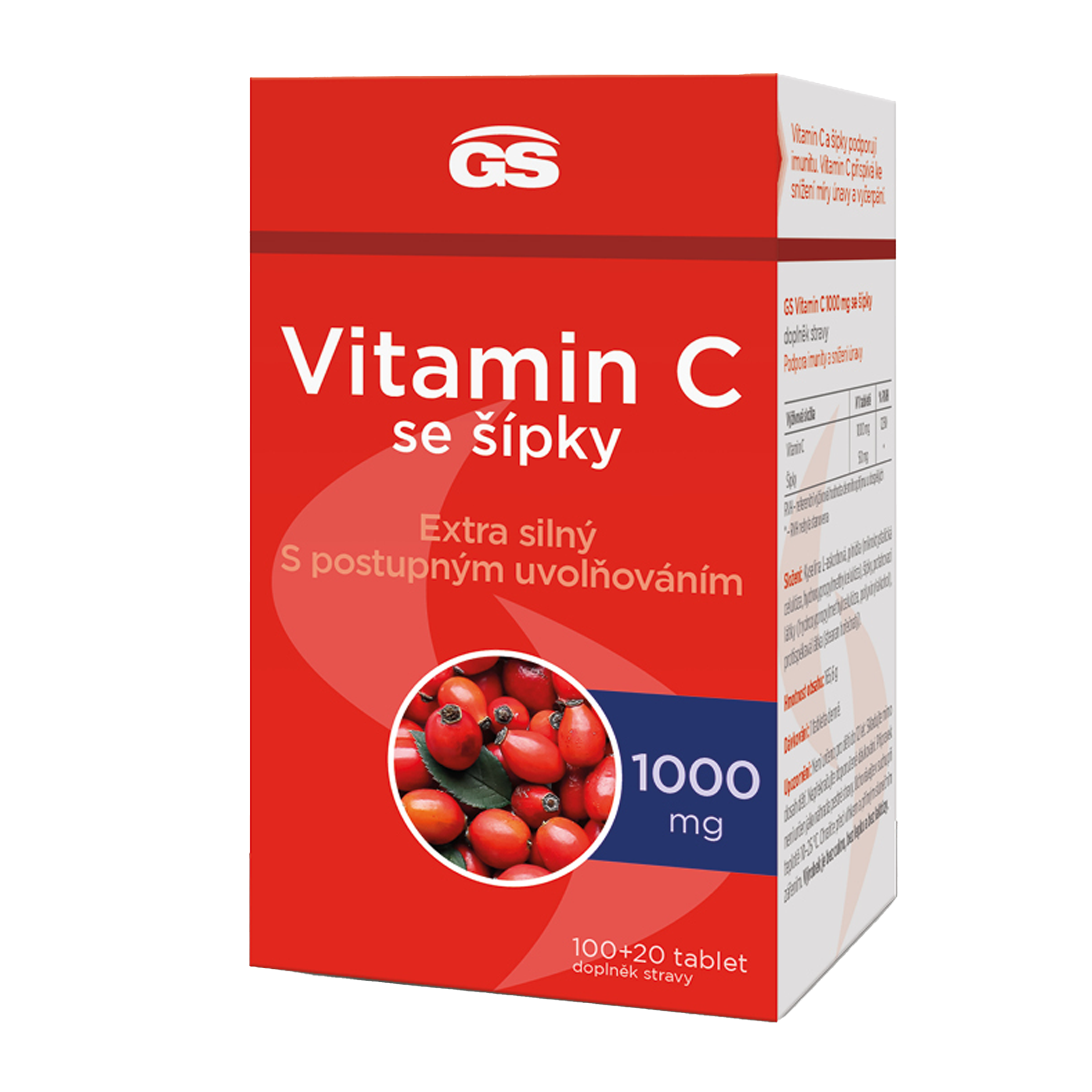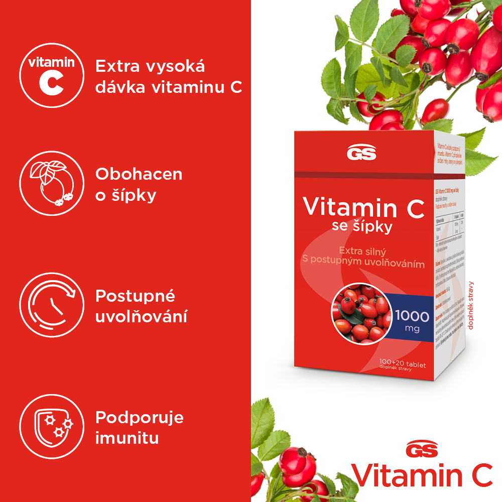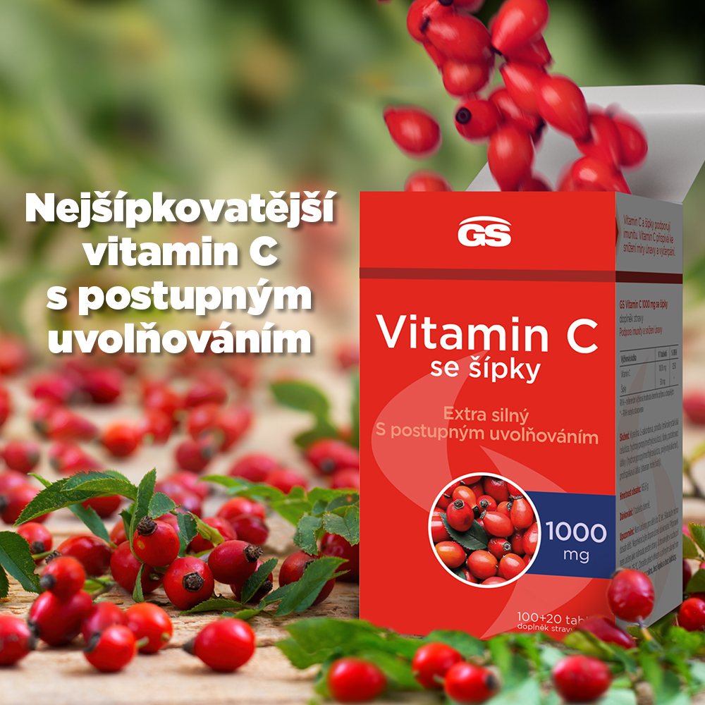 - GS Vitamin C 1000 mg se šípky – extra silný vitamin C obohacený o přírodní sílu šípků v tabletě s postupným uvolňováním