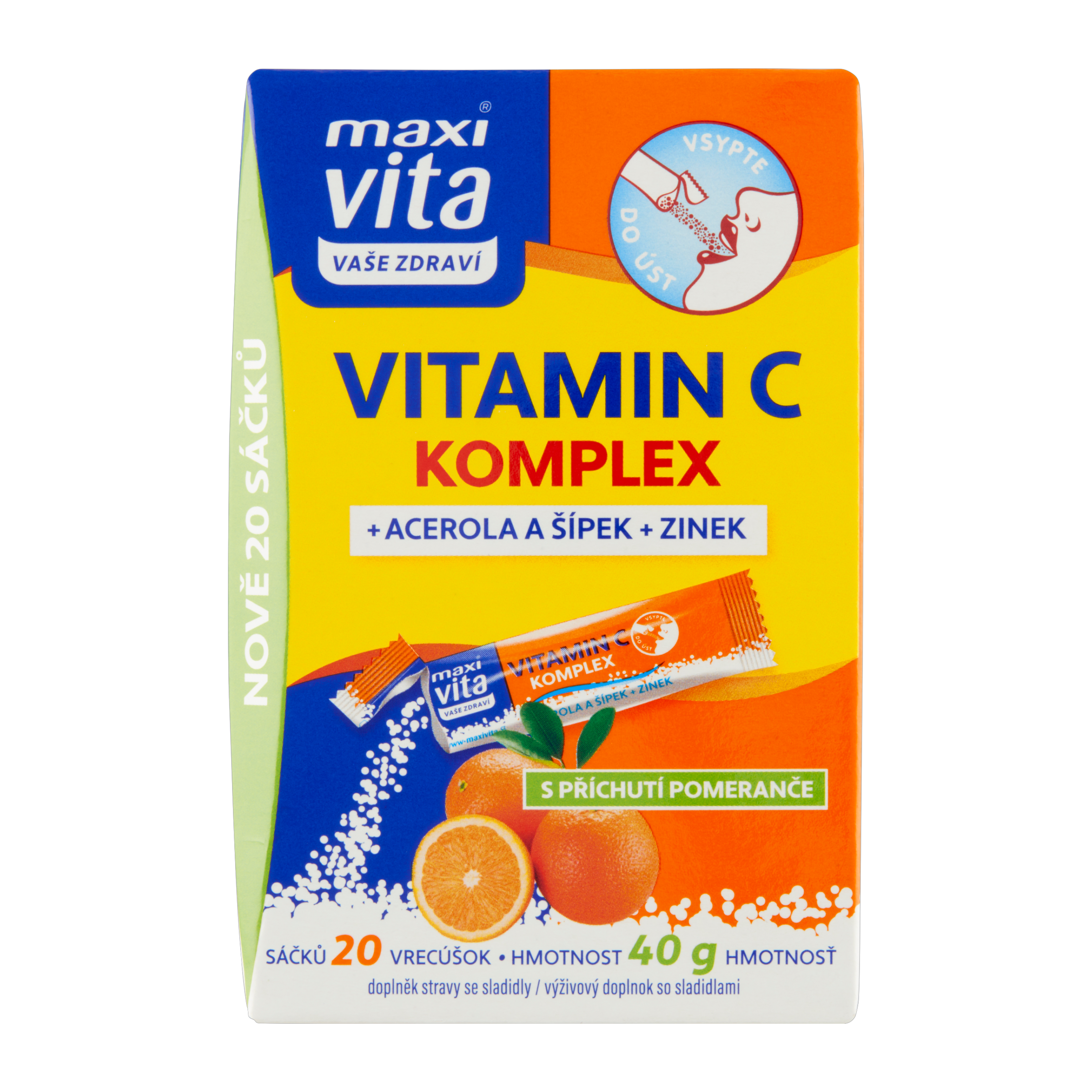 Maxi Vita® Vitamin C komplex + acerola a šípek + zinek je moderním doplňkem stravy v praktických jednorázových sáčcích, které umožňují vysoce komfortní užívání bez nutnosti zapíjení. Aktivní látky jsou pro organizmus lépe vstřebatelné, s rychlejším nástupem účinku.