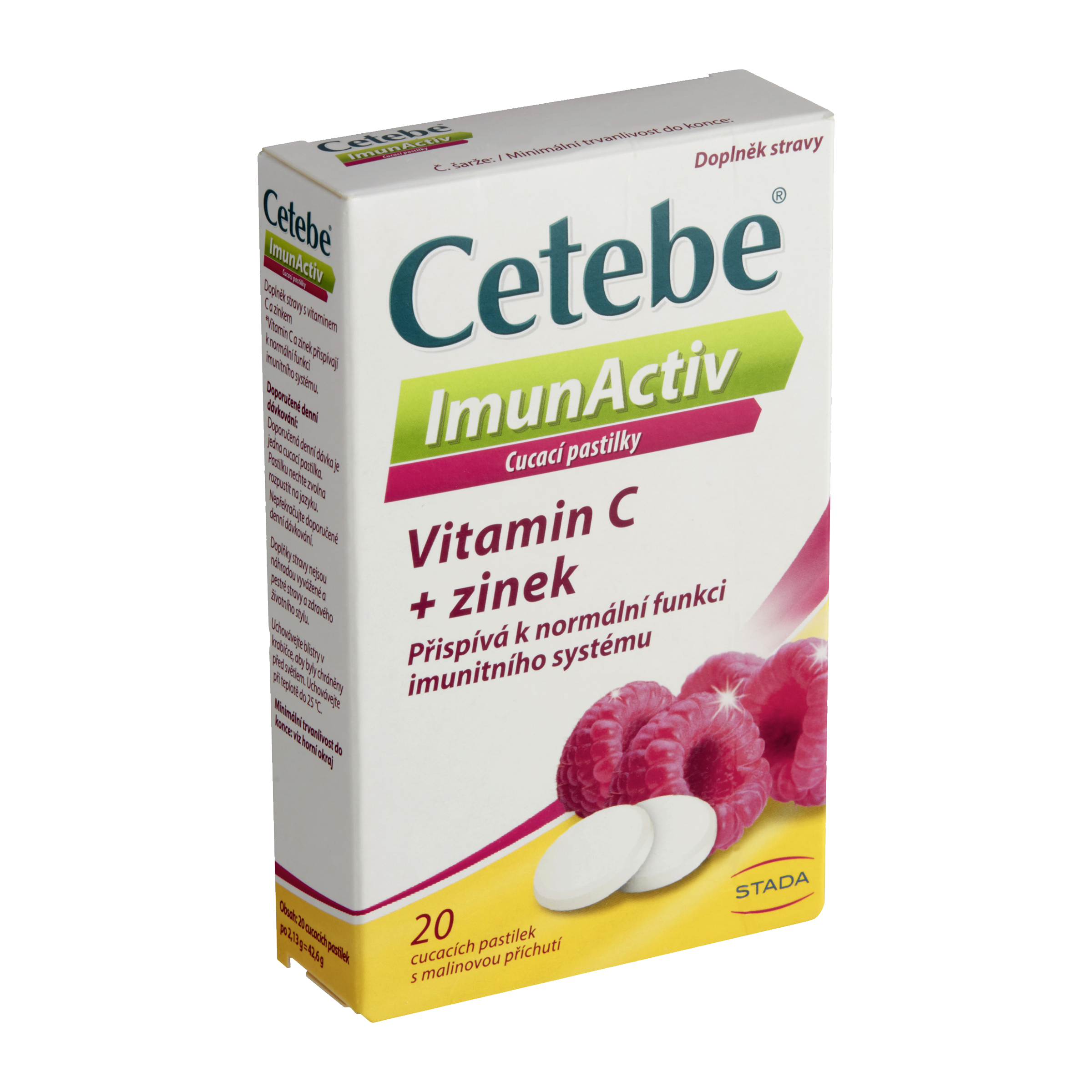 cukr, vitamin C, Maltodextrin, protispékavá látka oxid křemičitý, citrát zinečnatý, protispékavá látka hořečnaté soli mastných kyselin, extrakt z aceroly, extrakt ze šípků, malinová příchuť, prášek z rybízové šťávy