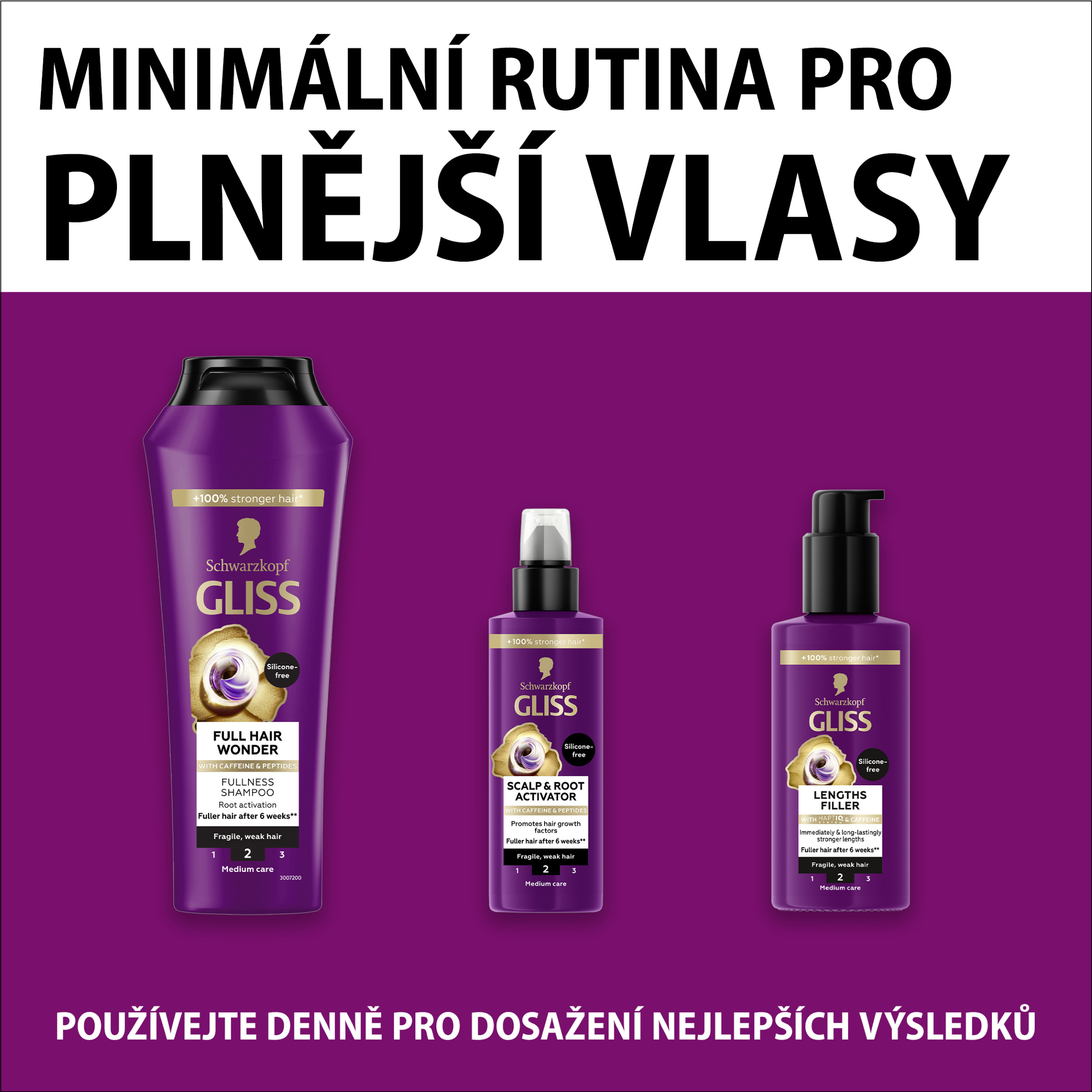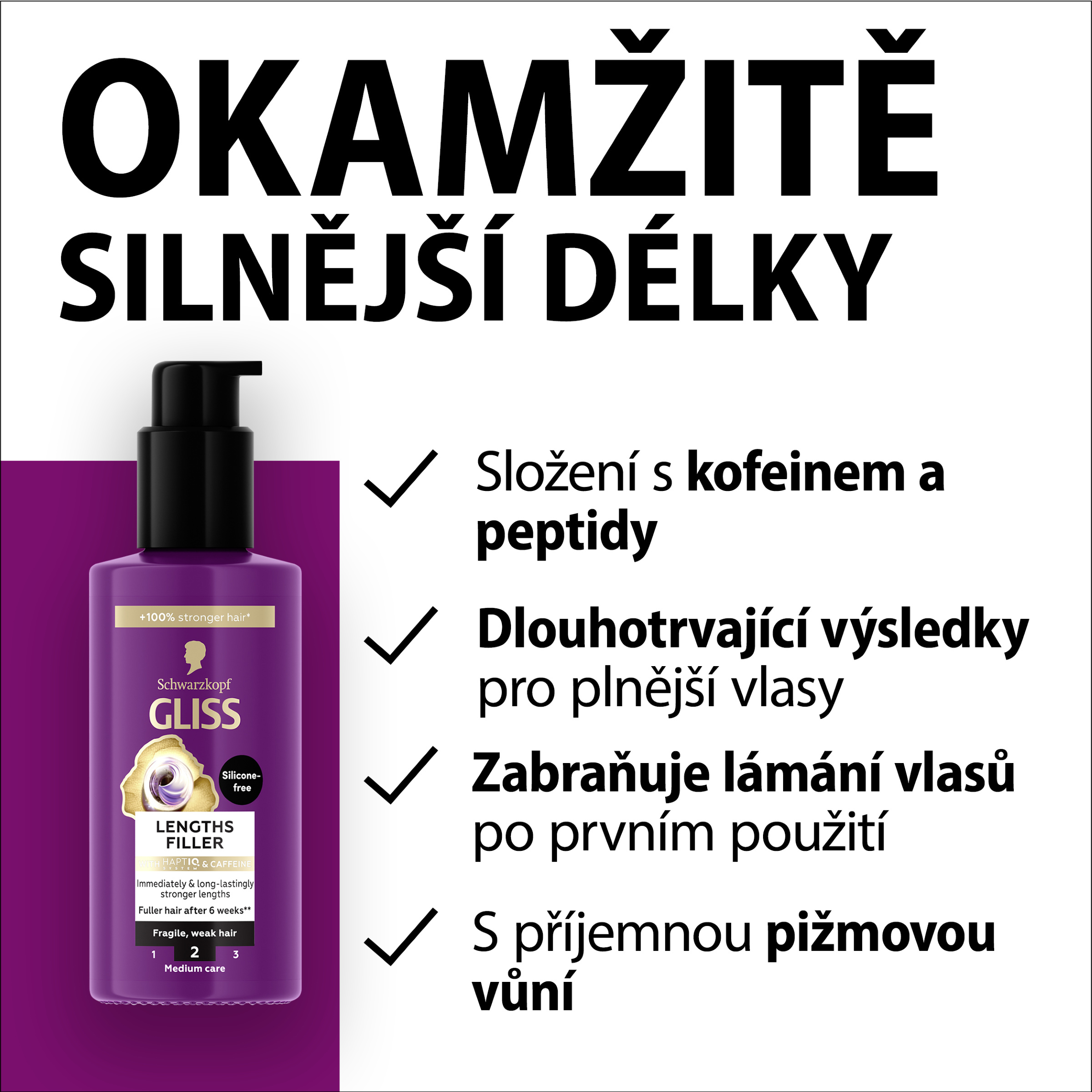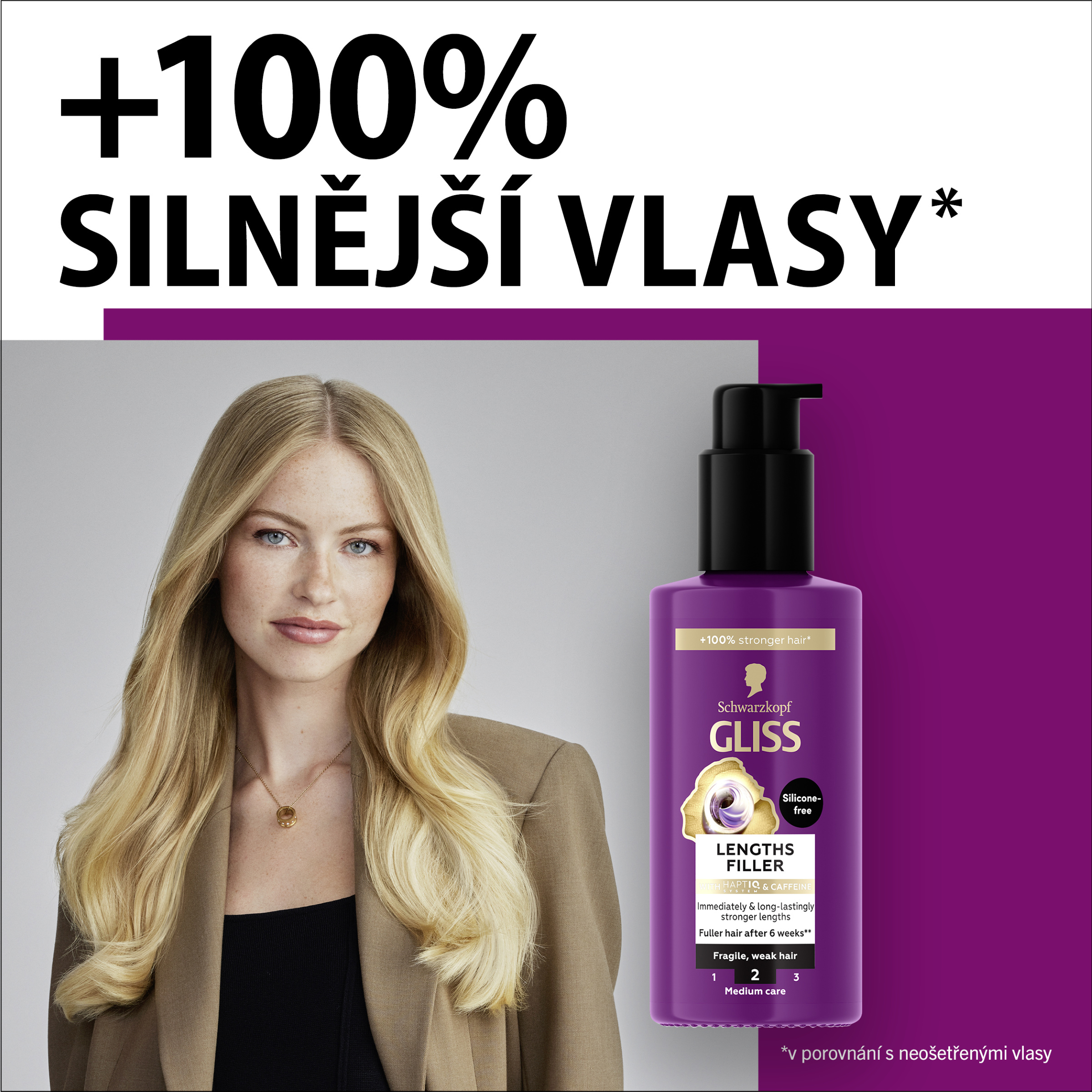 Obnova vlasů je věda, nikoli tajemství. Všechny receptury Gliss, založené na POKROČILÝCH AKTIVNÍCH LÁTKÁCH & PŘÍRODNÍCH POKLADECH, jsou šité na míru speciálním potřebám vlasů, aby zajistily jejich obnovu a viditelně zlepšily jejich kvalitu. Opravují stávající poškození a zabraňují budoucímu poškození tím, že posilují buněčnou strukturu a bojují proti volným radikálům. Naše dosud nejlepší obnova vlasů: zabraňuje poškození dříve než k němu dojde, pro dlouhotrvající krásné vlasy. Vlasová péče pro posílení délek: Tota vlasová péče Gliss pomáhá dosáhnout okamžitých a dlouhotrvajících výsledků pro plnější a silnější vlasy. Získejte zdravě vypadající vlasy s Gliss Kofein a systém HAPTIQ: V případě křehkých a slabých vlasů je vlasová péče Gliss založena na molekulární vědě o vlasech a vytváří mikrovazby a posiluje strukturu vlasů - pro krásné výsledky, které můžete vidět a cítit Silnější délky: Tato vlasová péče s příjemnou pižmovou vůní předchází lámání vlasů již po jednom použití a okamžitě a dlouhodobě posiluje délky vlasů. Šetrný k planetě: Složení vlasové péče je z 96 % přírodního původu včetně vody, neobsahuje silikony a je veganské***. Obsah balení: Schwarzkopf Gliss Full Hair Wonder vlasová péče pro posílení délek 100 ml se středním stupněm péče pro slabé a křehké vlasy Výplň délek pro plnější vlasy po 6 týdnech*. *Díky menší lámavosti při pravidelném používání **Globální politika testování na zvířatech ***Bez složek živočišného původu ****vs. neošetřené vlasy