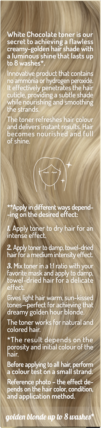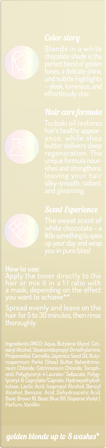Toner má šetrné složení bez amoniaku a peroxidu vodíku, které vlasy nejen tónuje, ale zároveň vyživuje, uhlazuje a dodává jim přirozený lesk. Je vhodný pro přírodní, barvené i odbarvené vlasy a jeho účinek trvá až 8 umytí – v závislosti na poréznosti vlasů. Použití zpříjemní sladká vůně bílé čokolády, která provoní celou péči jemnou dezertní atmosférou.