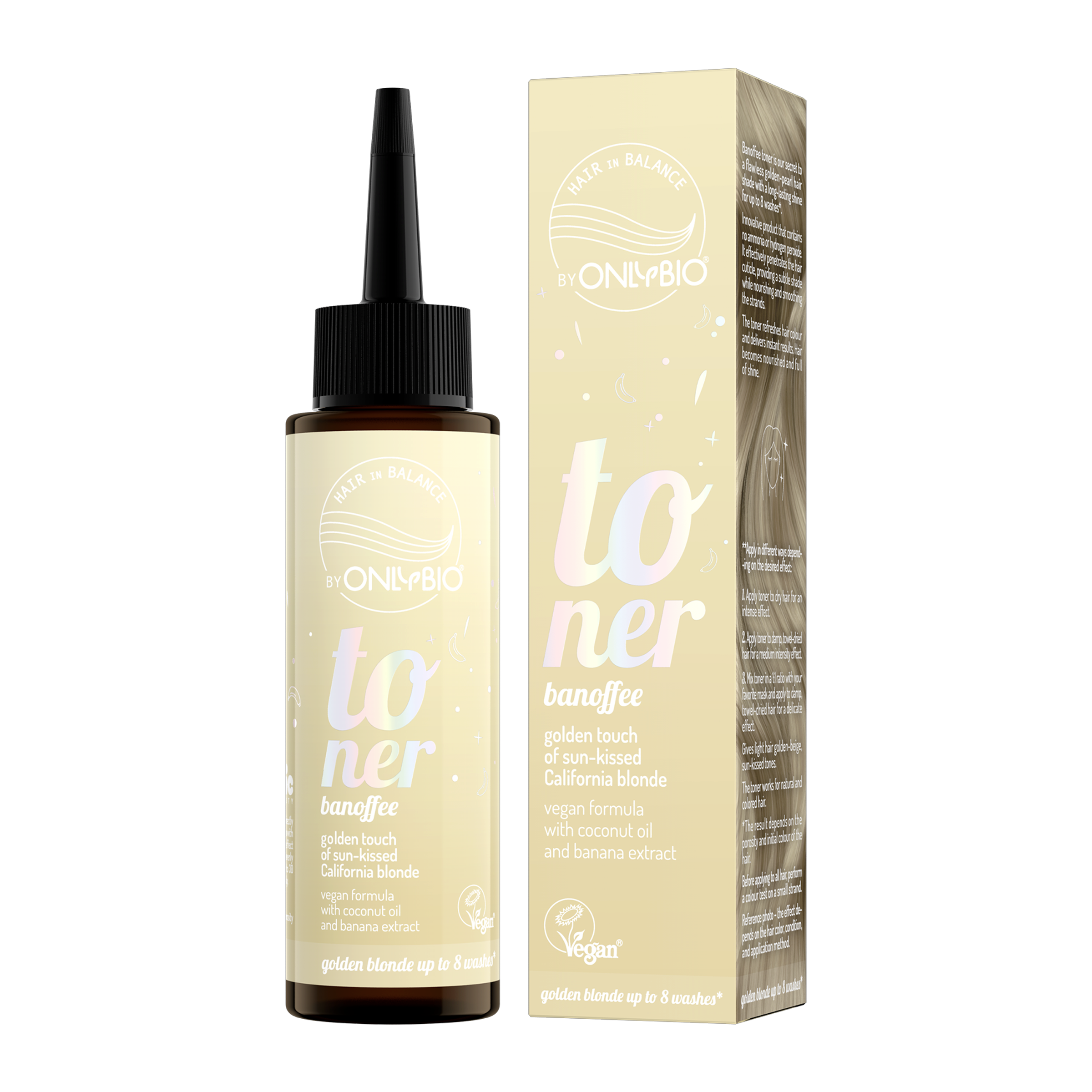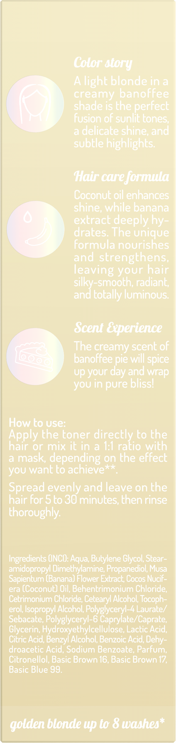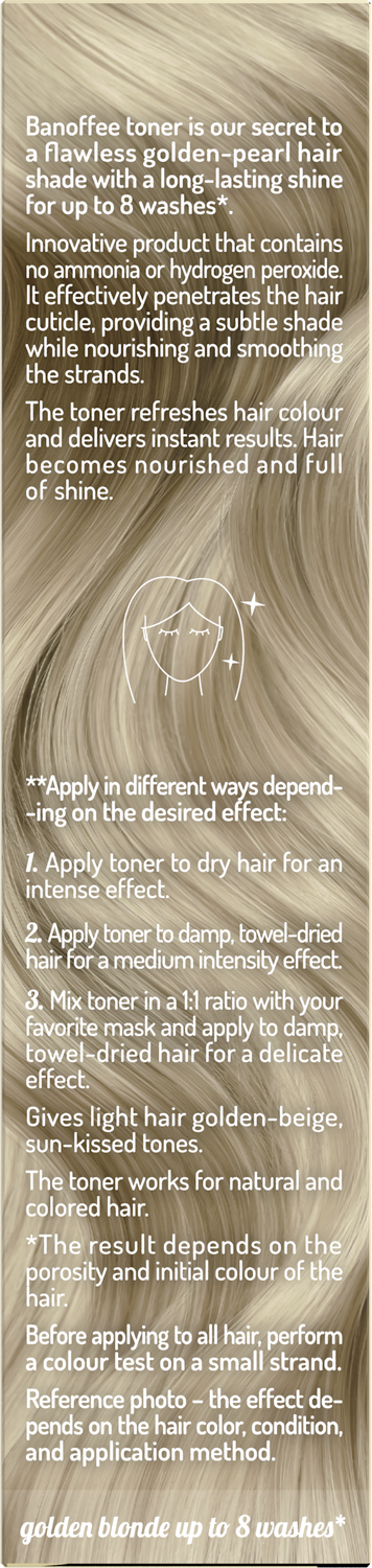 Vlasový toner OnlyBio Hair in Balance Banoffee dodává vlasům světlý blond odstín se zlatavým podtónem, inspirovaný sluncem zalitou kalifornskou pláží. Světlým vlasům propůjčuje zářivě béžový tón se zlatým nádechem, zatímco na tmavších vlasech je výsledný efekt jemnější.