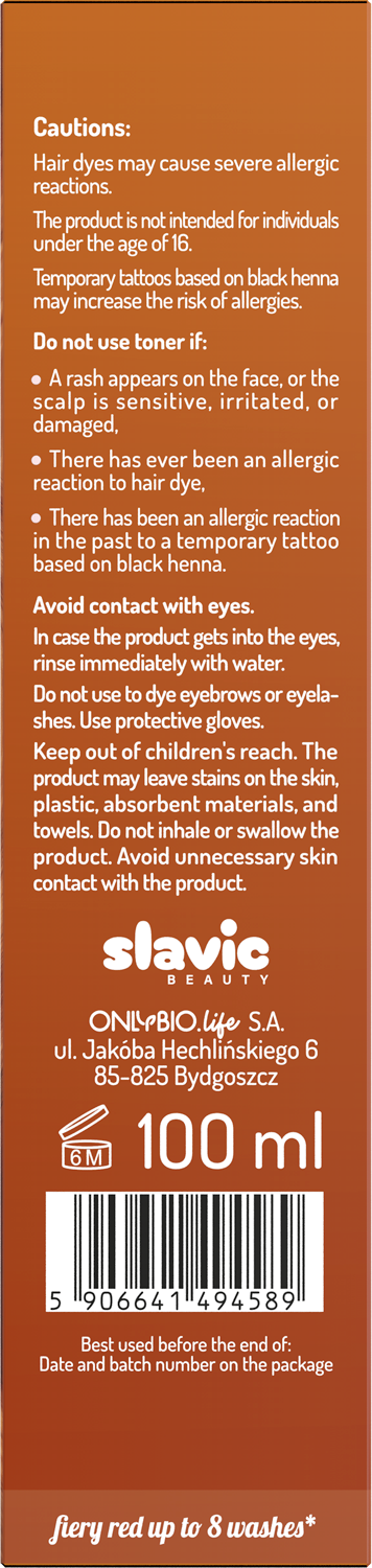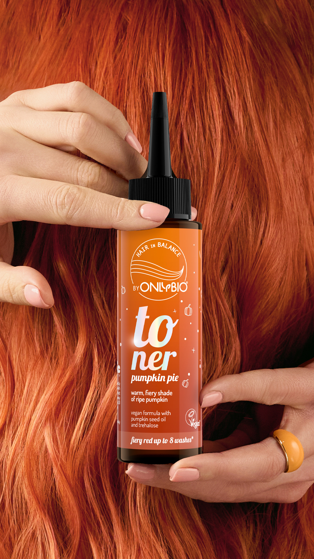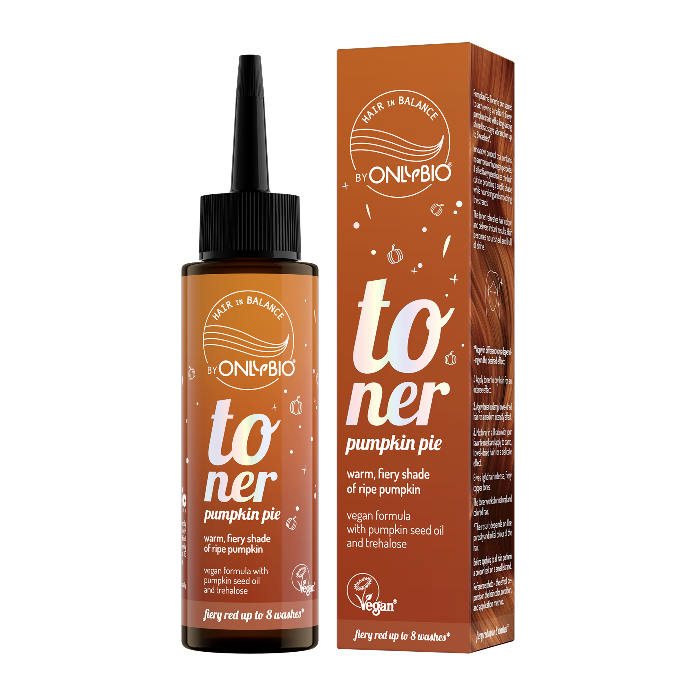 Vlasový toner OnlyBio Hair in Balance Pumpkin Pie dodává vlasům ohnivě červený odstín s intenzivním, zářivým podtónem. Barva připomíná zralou podzimní dýni – teplá, výrazná a plná energie. Na světlých vlasech vytváří sytý kaštanový tón s ohnivým nádechem, zatímco tmavým vlasům propůjčuje jemný červený odlesk.