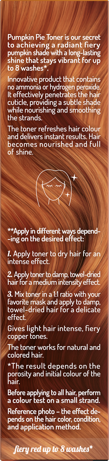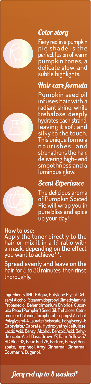 Díky složení bez amoniaku a peroxidu vodíku je toner k vlasům šetrný, zároveň je vyživuje, uhlazuje a zanechává přirozený lesk. Hodí se pro přírodní, barvené i odbarvené vlasy a výsledek vydrží až 8 umytí – v závislosti na poréznosti a původní barvě vlasů. Dezertní vůně Pumpkin Spiced Pie provoní vlasy a zpříjemní celý proces tónování.