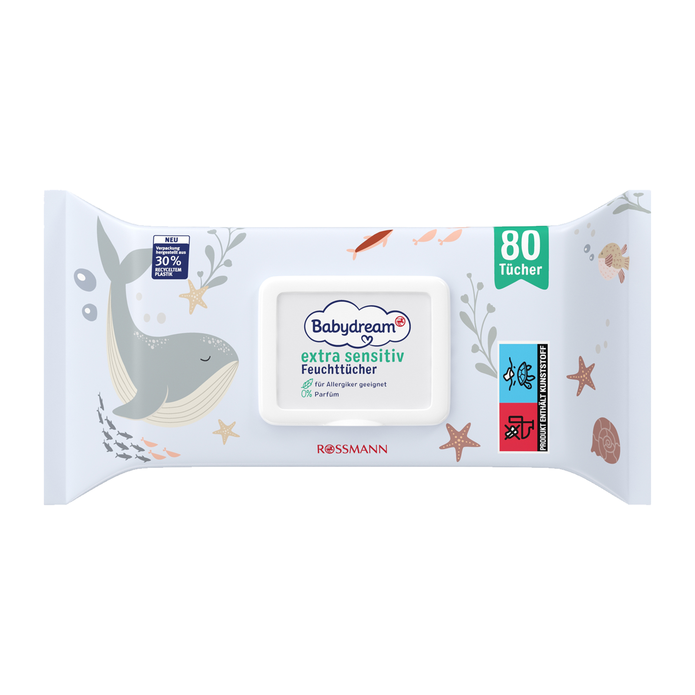 Naše ubrousky Babydream Extra Sensitive čistí citlivou pokožku zvlášť šetrně a jemně. Ubrousky jsou prakticky složené, takže můžete uchopit další ubrousek stejným způsobem. Takže máte ubrousek po ruce rychle a druhou rukou můžete držet vaše dítě. Jemné, zklidňující složení s Aloe vera a alantoinem chrání pokožku před vysycháním. Vhodné pro velmi citlivou pleť dětí i dospělých. Testované a doporučené Německou asociací pro alergie a astma. Balení zase dobře uzavřete, aby ubrousky nevysychaly.